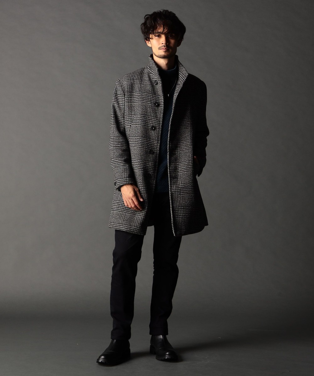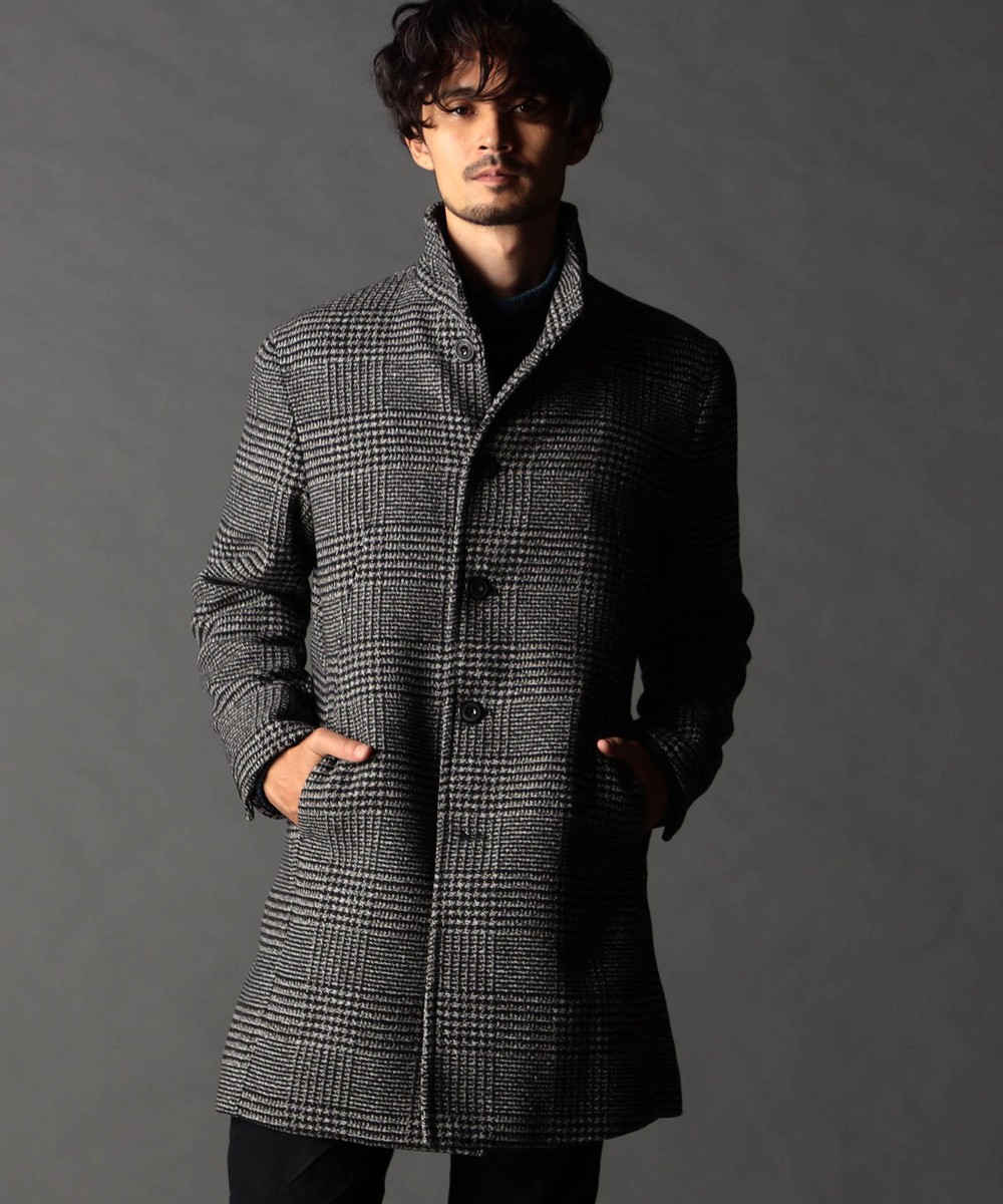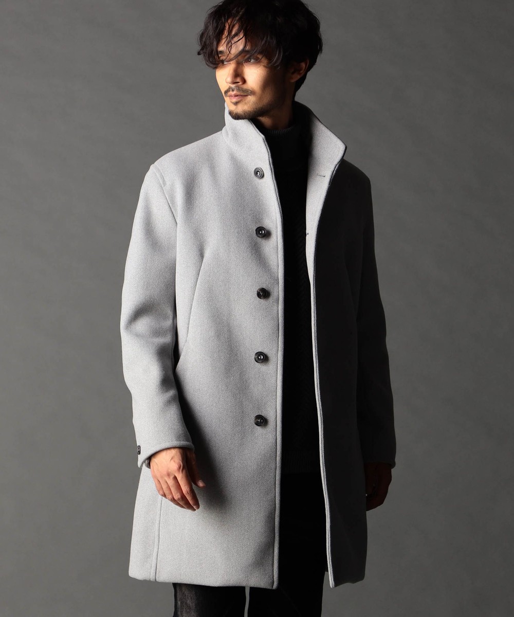ビジカジ対応も可能なスタンドカラーのコート。ミニマムなデザインとシャープなシルエットなのでスタリングしやすいです。衿端にはワイヤーを入れていますのでVゾーンを綺麗に見せれます。その衿部分は折り返してラペルとしても綺麗に収まる設定です。袖口は本切羽仕様で、身返しを表地にしていますので折り返して遊べます。腰ポケットはダーツを利用したスラッシュポケットで斜めに作っていますので使いやすく、内ポケットは大きめのパッチポケットと、胸辺りに身返しとの切り替えを利用したスラッシュポケットを両身に配置しています。上まで釦止めが出来るので防風性も高く、保温性の高い裏地を採用した総裏仕様なので防寒性も良いです。