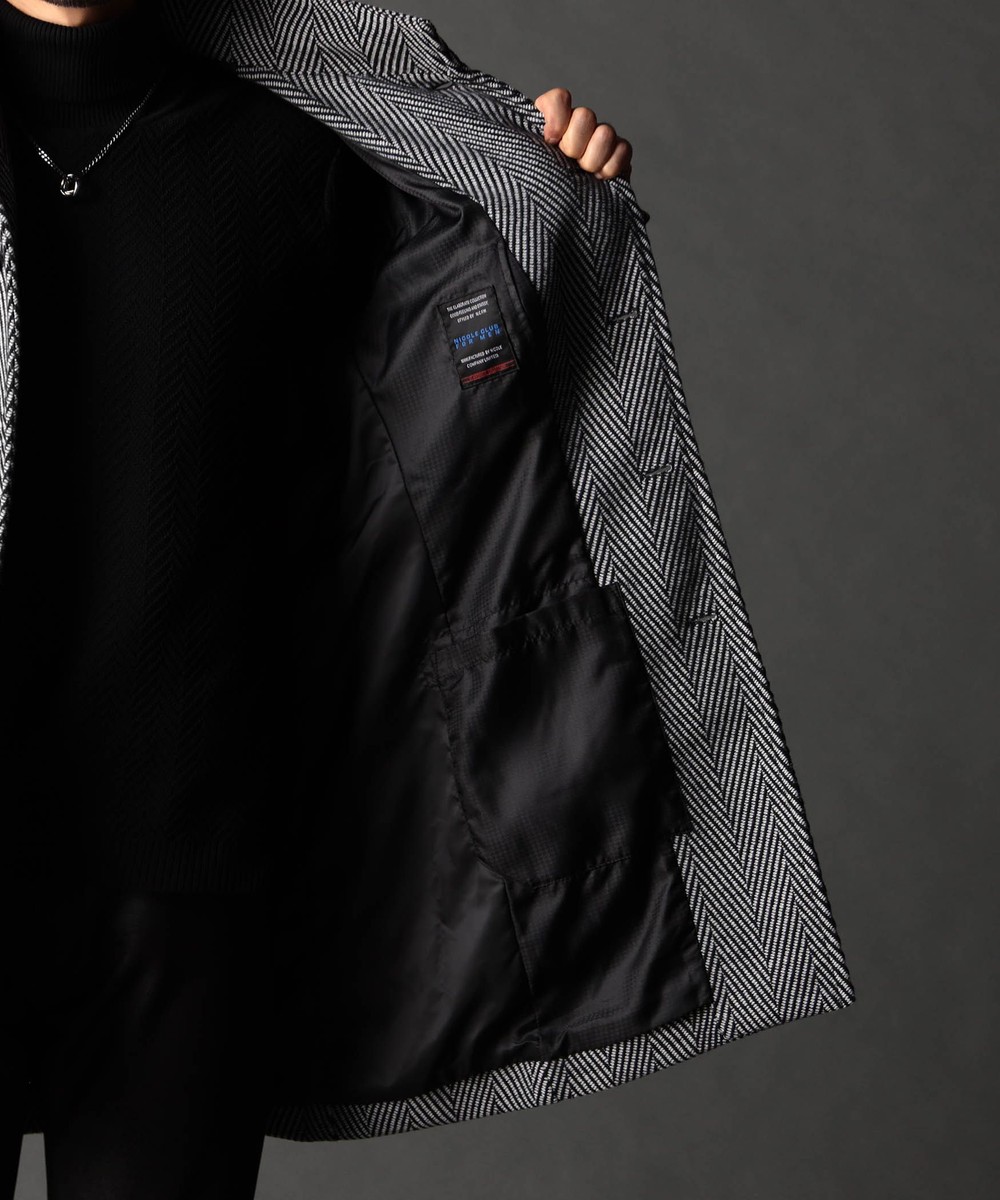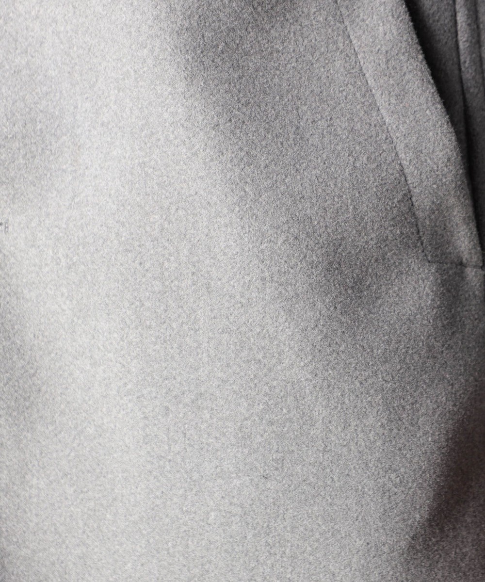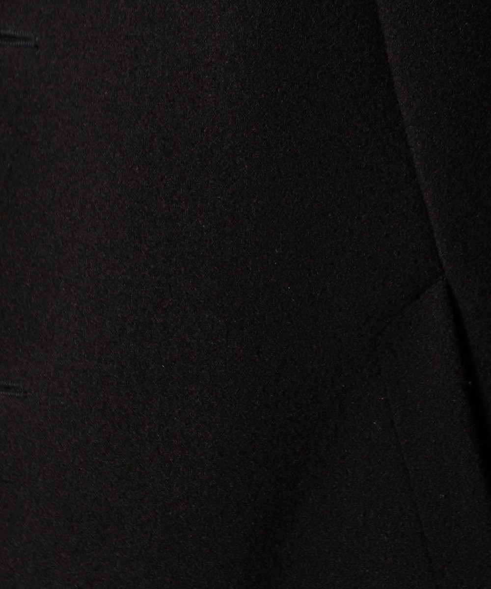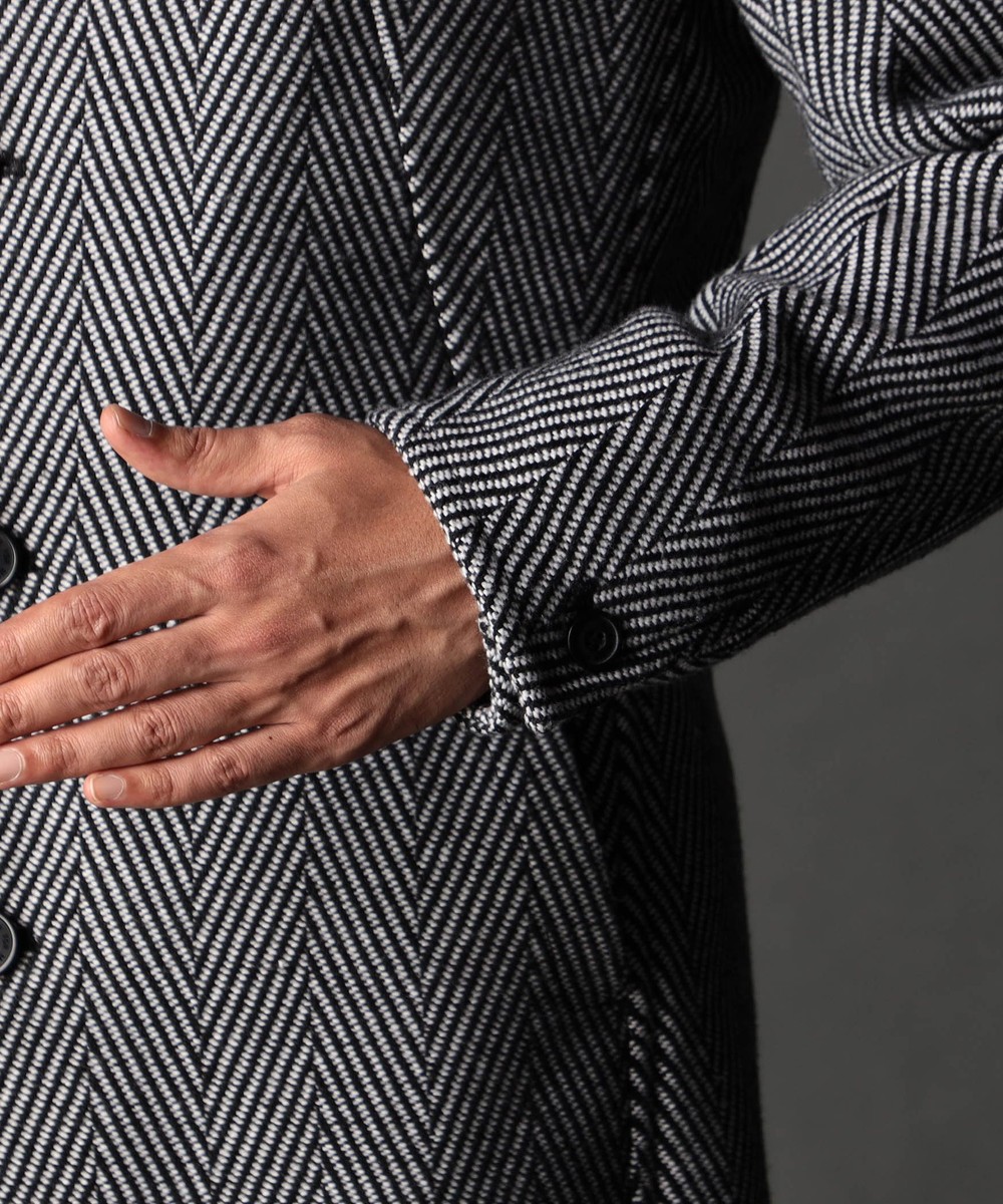 ビジカジ対応も可能なスタンドカラーのコート。ミニマムなデザインとシャープなシルエットなのでスタリングしやすいです。衿端にはワイヤーを入れていますのでVゾーンを綺麗に見せれます。その衿部分は折り返してラペルとしても綺麗に収まる設定です。袖口は本切羽仕様で、身返しを表地にしていますので折り返して遊べます。腰ポケットはダーツを利用したスラッシュポケットで斜めに作っていますので使いやすく、内ポケットは大きめのパッチポケットと、胸辺りに身返しとの切り替えを利用したスラッシュポケットを両身に配置しています。上まで釦止めが出来るので防風性も高く、保温性の高い裏地を採用した総裏仕様なので防寒性も良いです。
