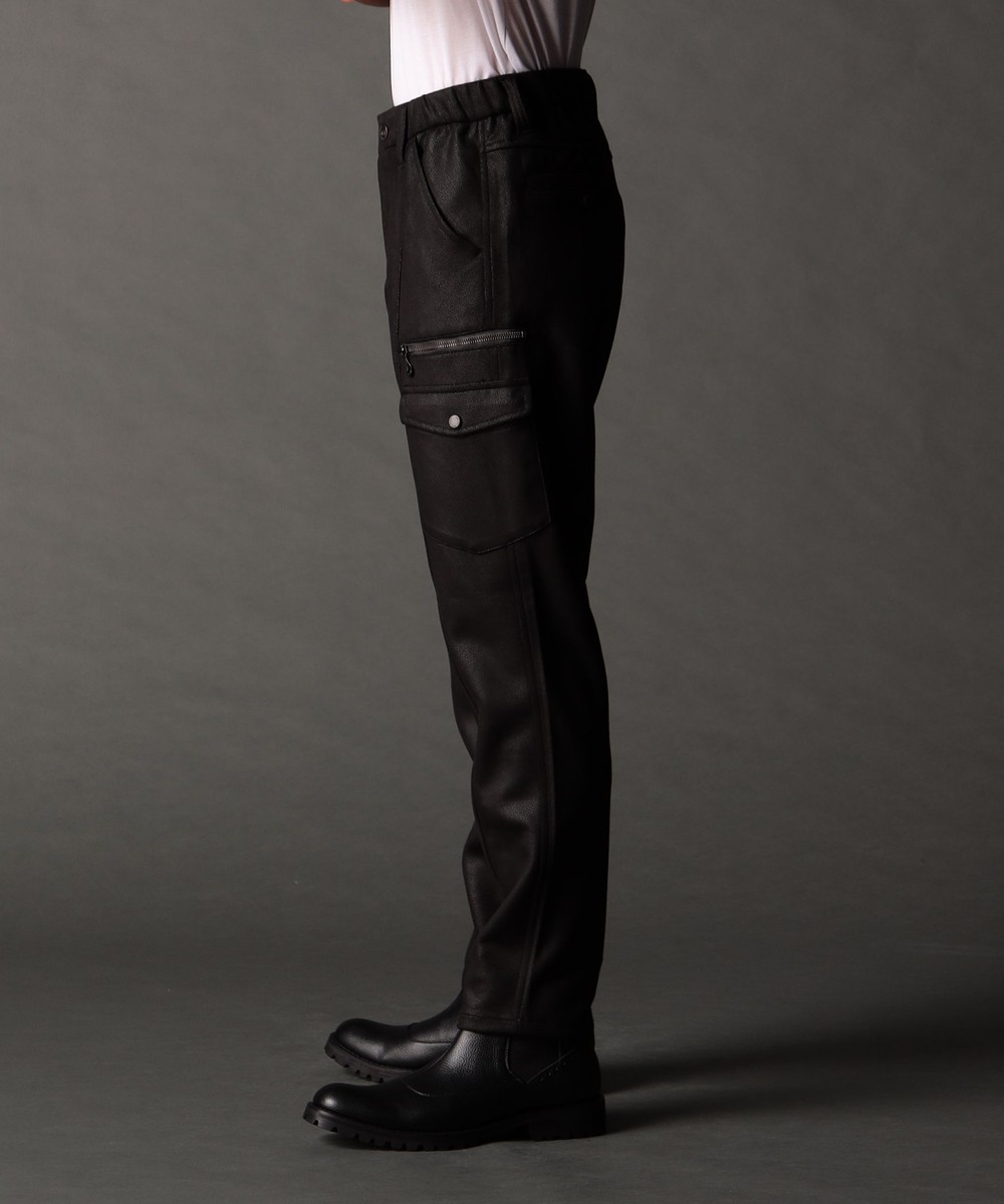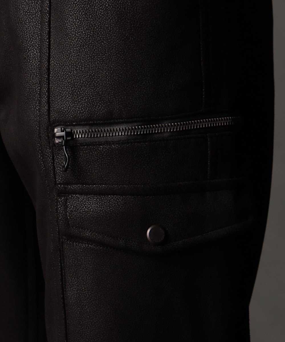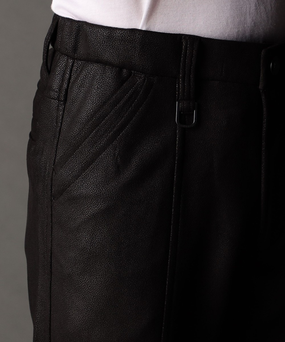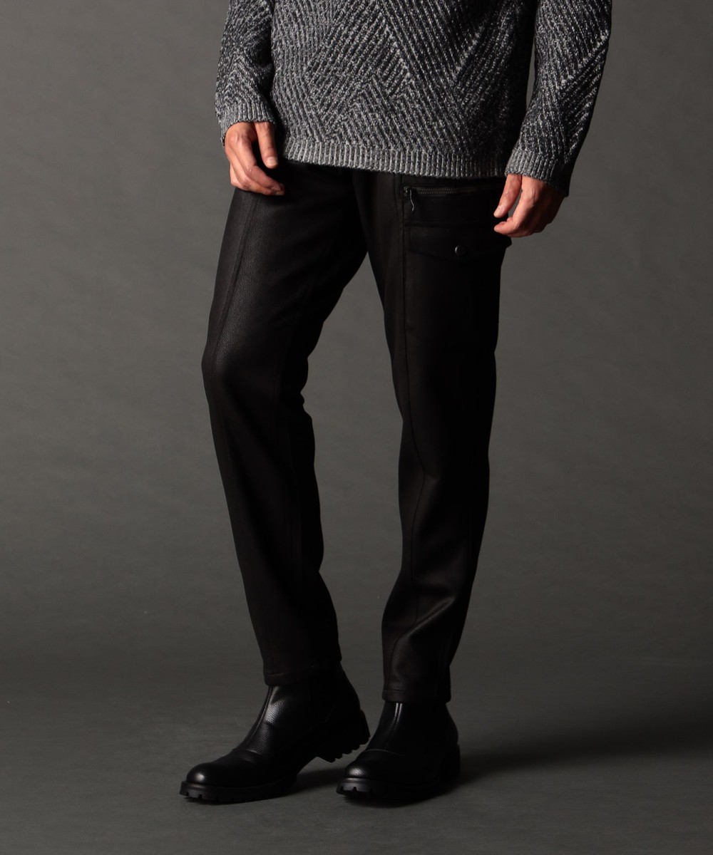91その他2は、革の小シボを表現した柄の箔プリントを施して革パンの様なレザーライクな見え方に作っています。マルチなストレッチ性、ジャージ素材なのではのプリッとした横張り感もあり、シルエットを綺麗に作ります。