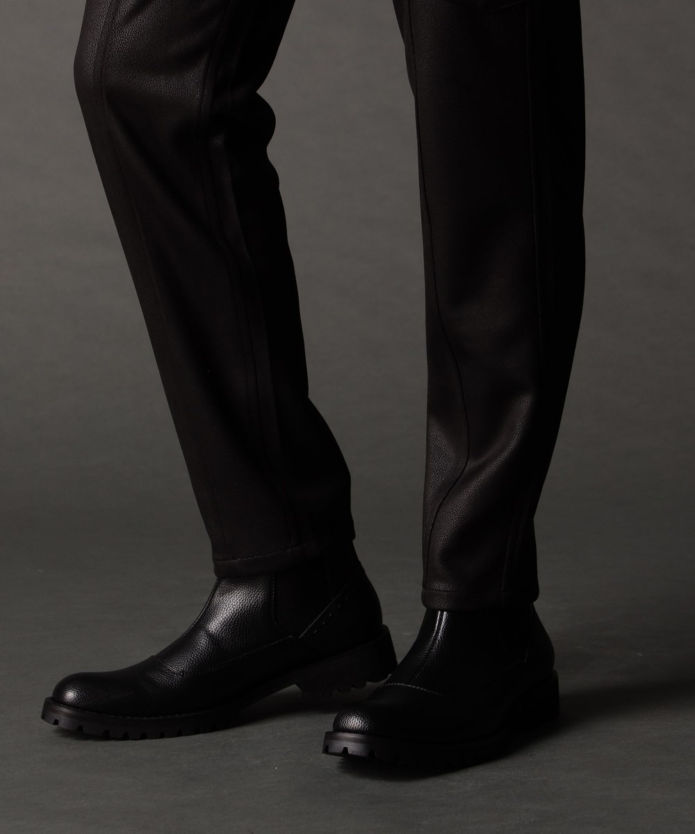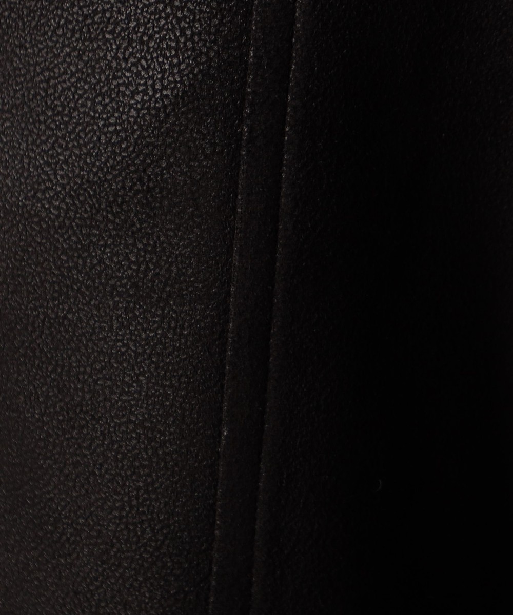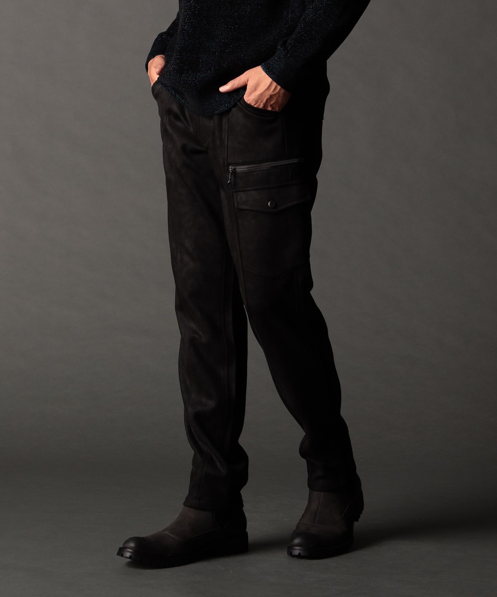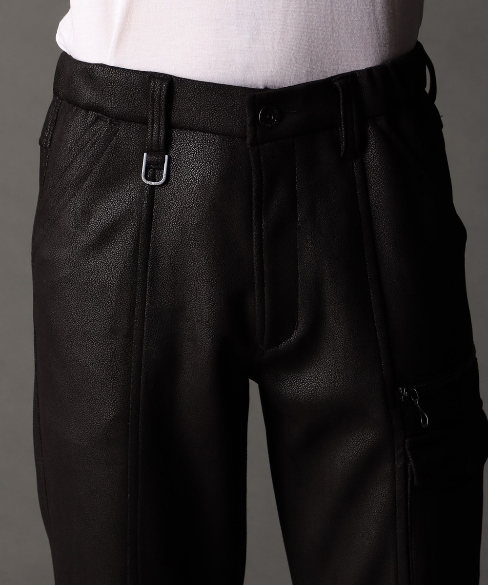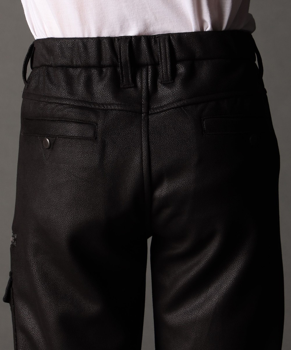 91その他2は、革の小シボを表現した柄の箔プリントを施して革パンの様なレザーライクな見え方に作っています。マルチなストレッチ性、ジャージ素材なのではのプリッとした横張り感もあり、シルエットを綺麗に作ります。