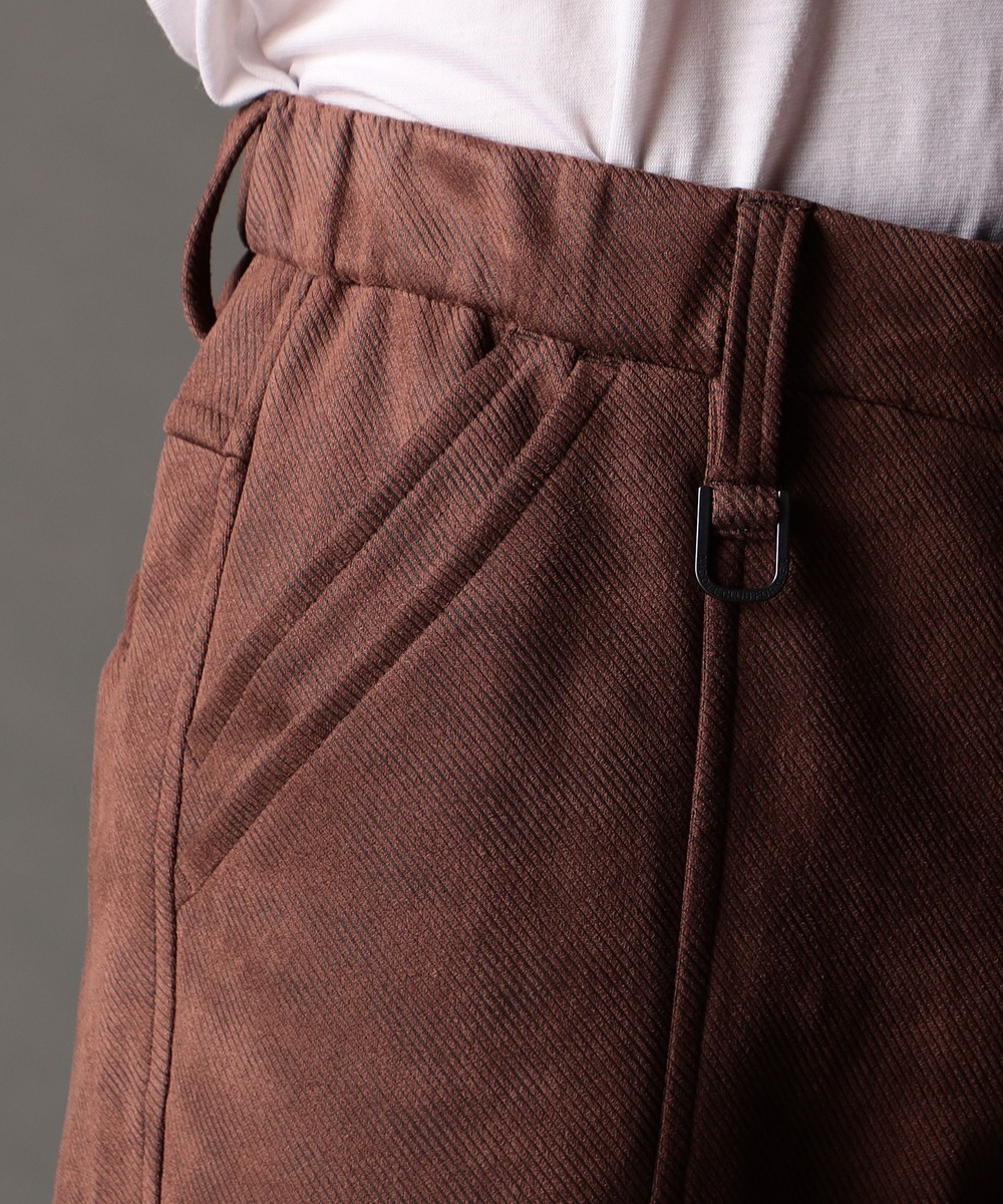 ウエストベルトには平ゴムを通していますのでテンションがあり、スピンドルも通していますのでサイズ調整もしやすくなったイージーパンツ仕様。