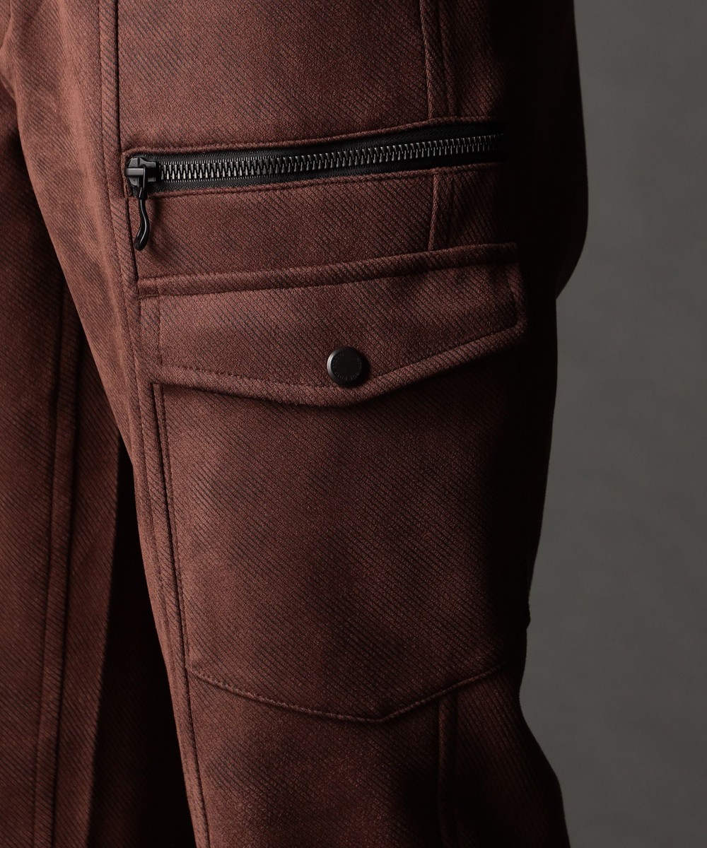 ポリエステルのマイクロファイバーで編まれたジャージ素材の表面をスウェード起毛し、滑らかなタッチとソフト風合いを特徴にしたカットソー素材がベース。