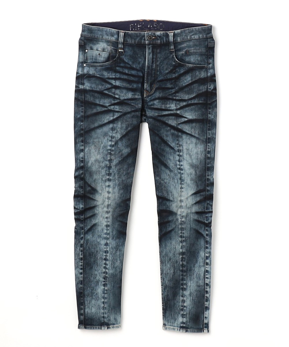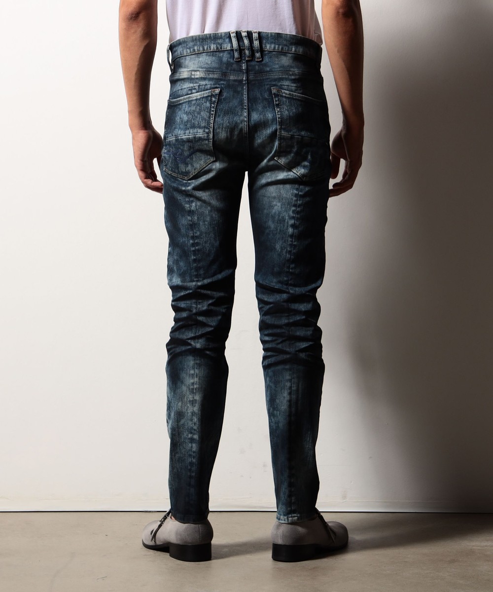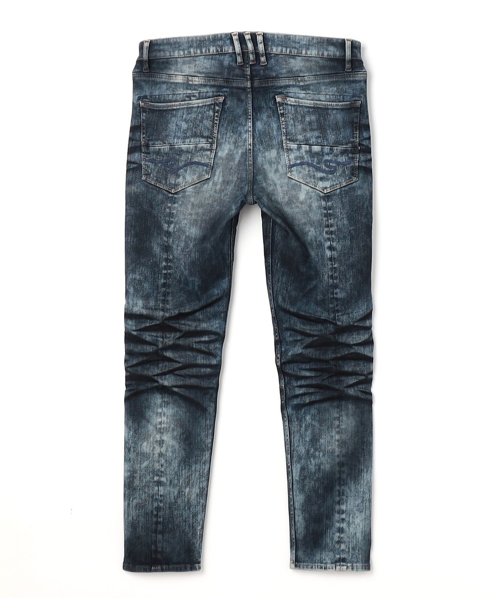 最終の製品加工を岡山のデニム専門の加工所(Wellsウェルズ)に依頼。中国で縫製後、ユーズドとケミカル加工を施し、全体のサイズ感を調整しています。国内で最終加工、顔料を混ぜた樹脂コーティング剤を部分的吹き付け、所々アイロンでしっかり抑える事で縫い代の厚みがある部分や平たい部分に光沢を出してコーティングパンツの様な質感に仕上げます。最後に立体的でリアルな3Dシワ加工を施し、更に陰影感をつける様に顔料を吹き付けています。
