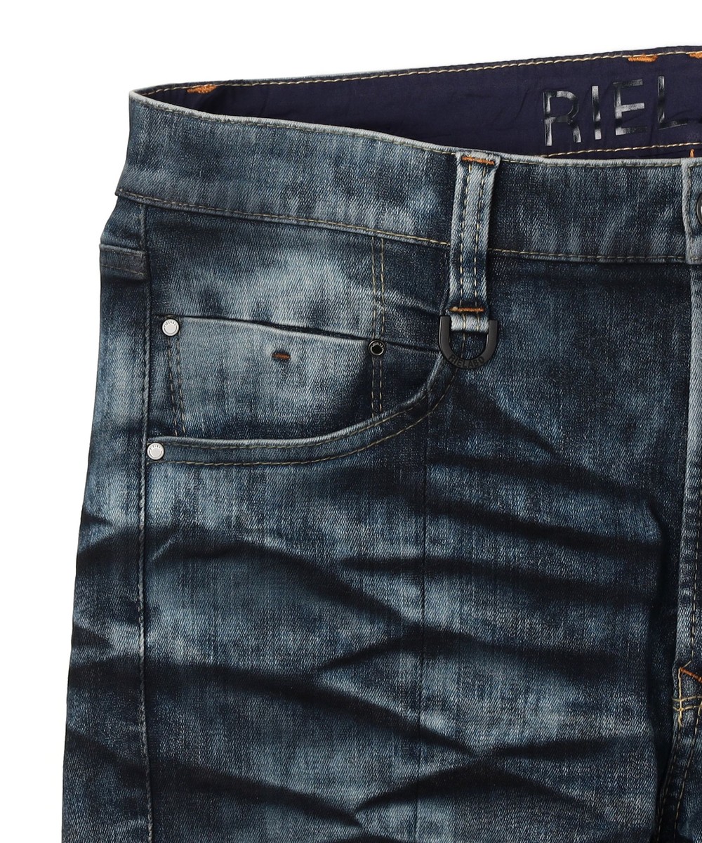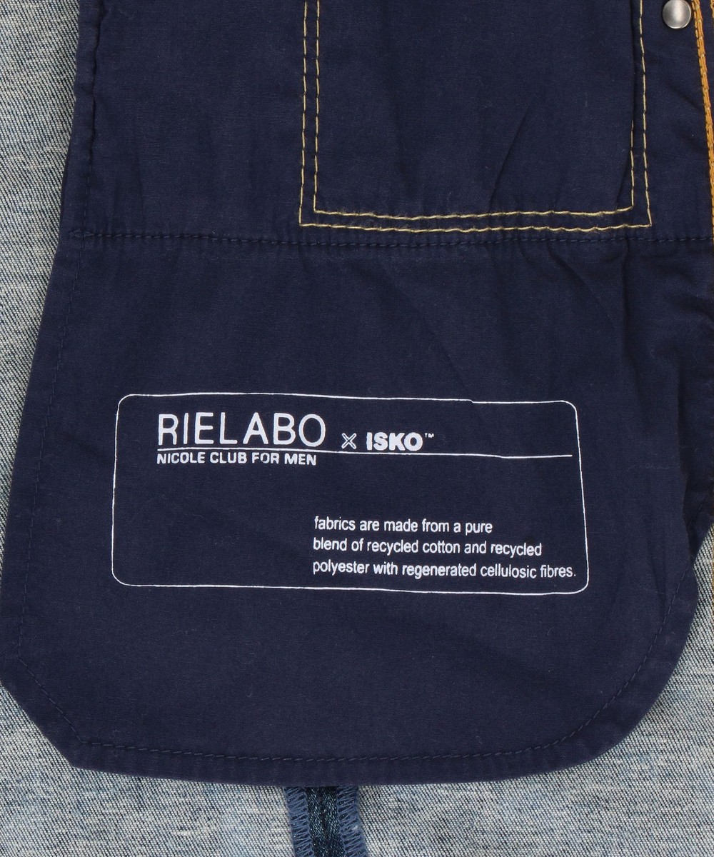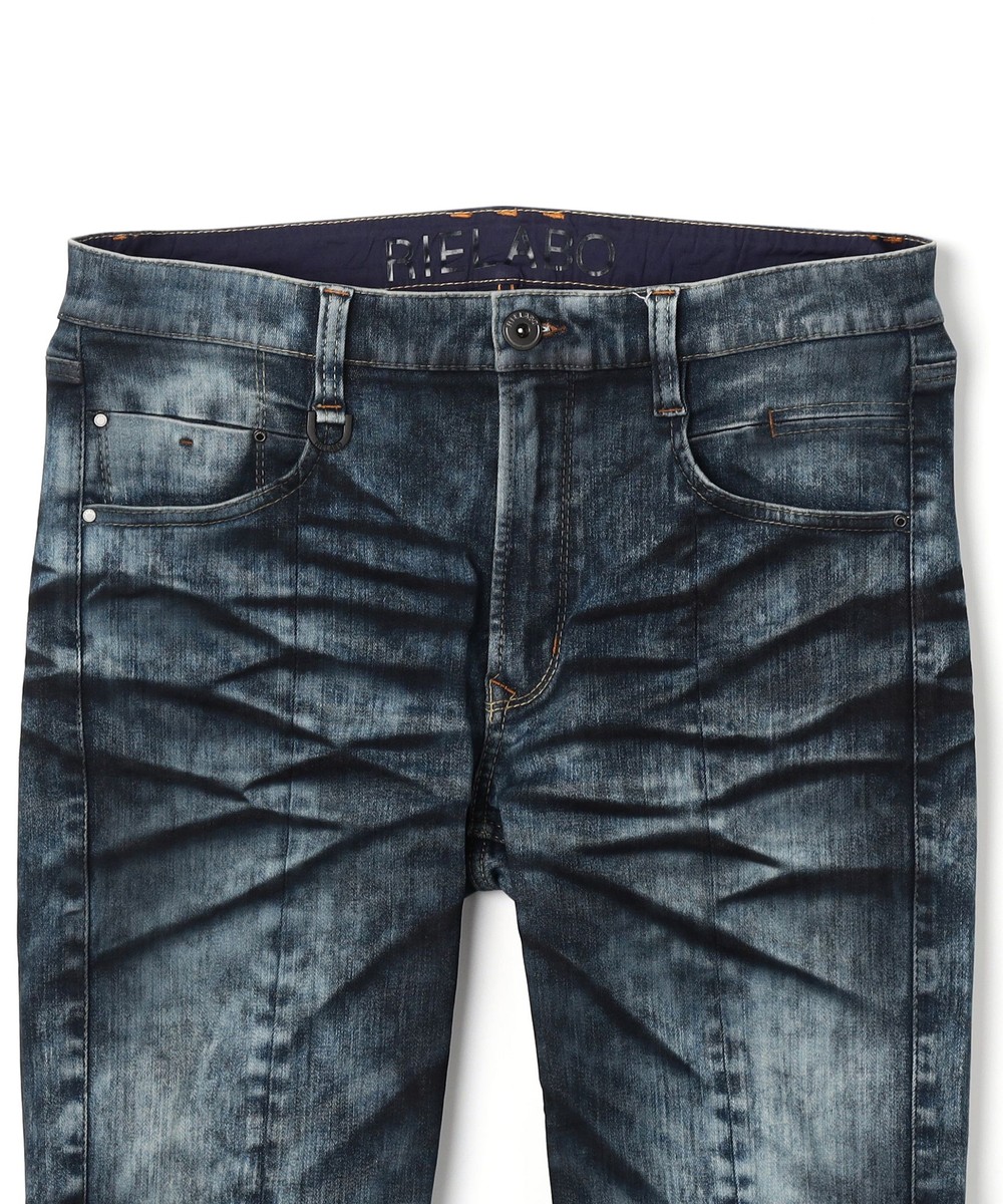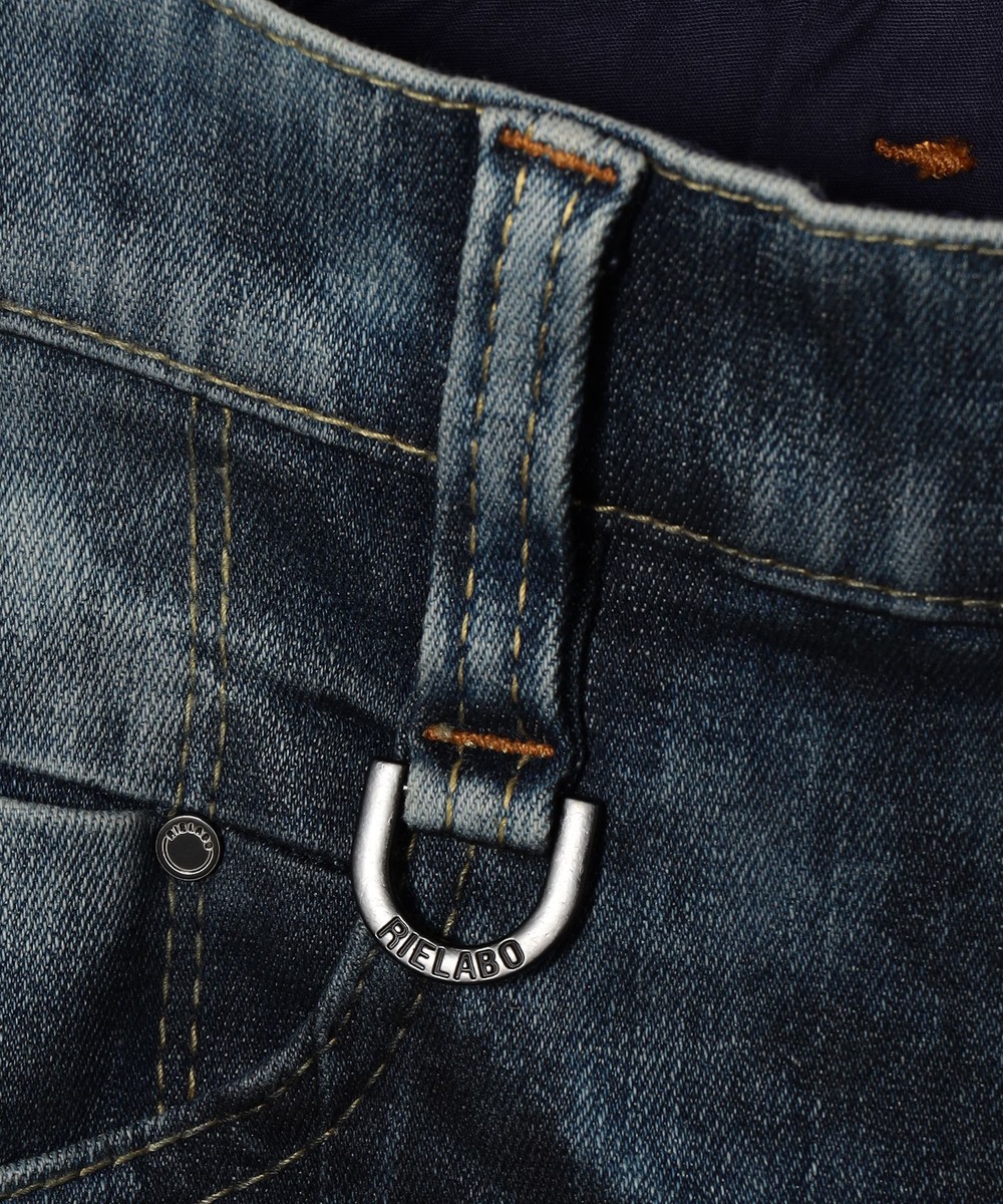 バックポケットのR刺繍と3本ループを特徴としたリエラボの5ポケットデザインパンツ。縦のデザイン切り替えを入れる事で加工感が目立つ様にしています。素材にあわせてウエストベルトも少し伸びる様に縫製、ストレッチ裏地を別布に使用していますので穿き着心地も抜群です。ISKOの下札を付け、右ポケット袋布にISOKコラボのプリントを施しています。