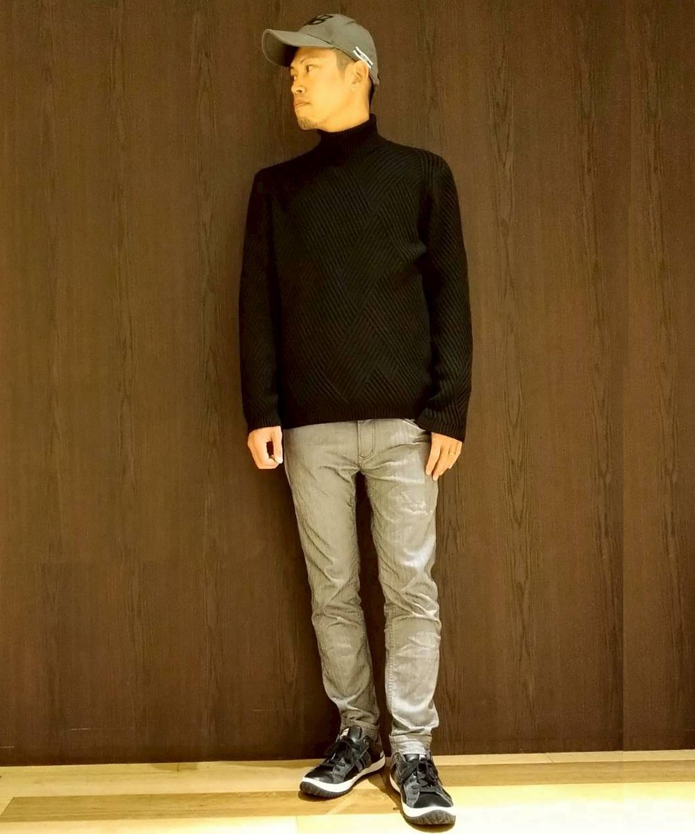 大柄のバスケット柄をジャカードで表現したタートルネックニット。