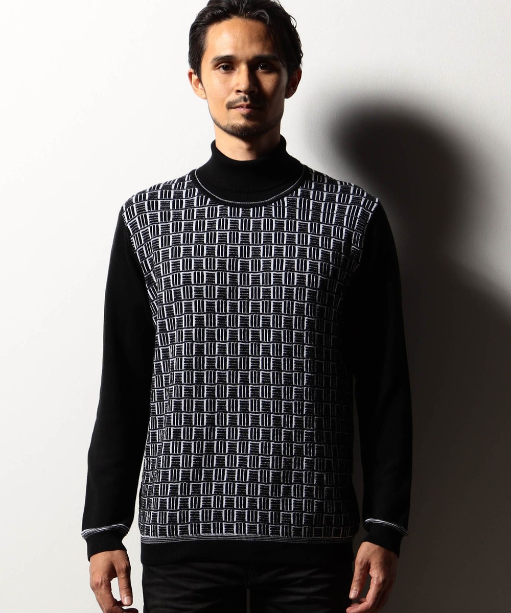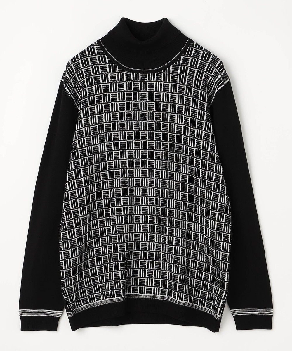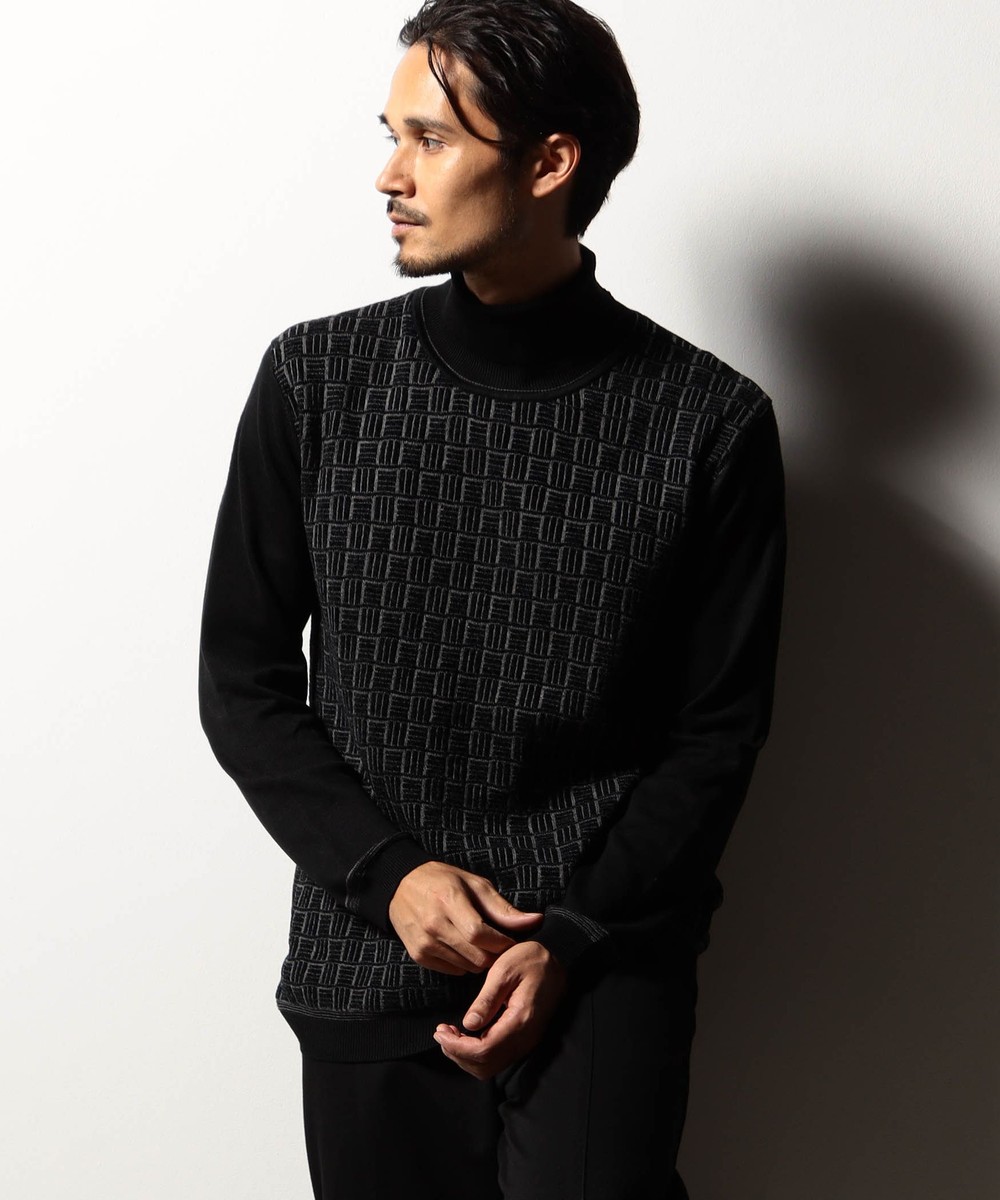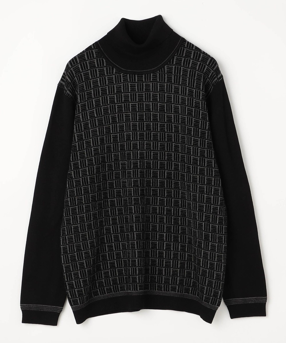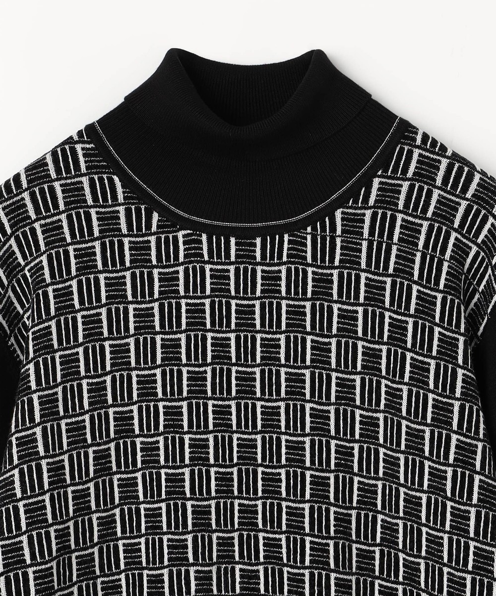 カットソー感覚で着られるタートルネックプルオーバーニット。前身には立体的に編み立てたブロックチェック柄を配色で表現して陰影感のある洗練された印象に仕上げました。衿付けと袖口、裾の切り替え部分には配色ラインのリンクス編みを入れたニットらしい遊び心のある一着です。脇下には消臭抗菌テープを入れて機能性もプラスしたこだわりの仕上がりです。