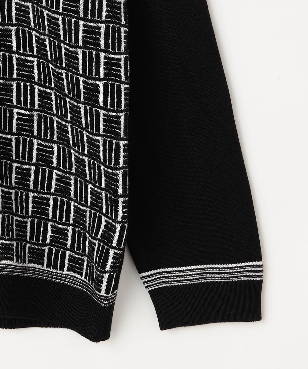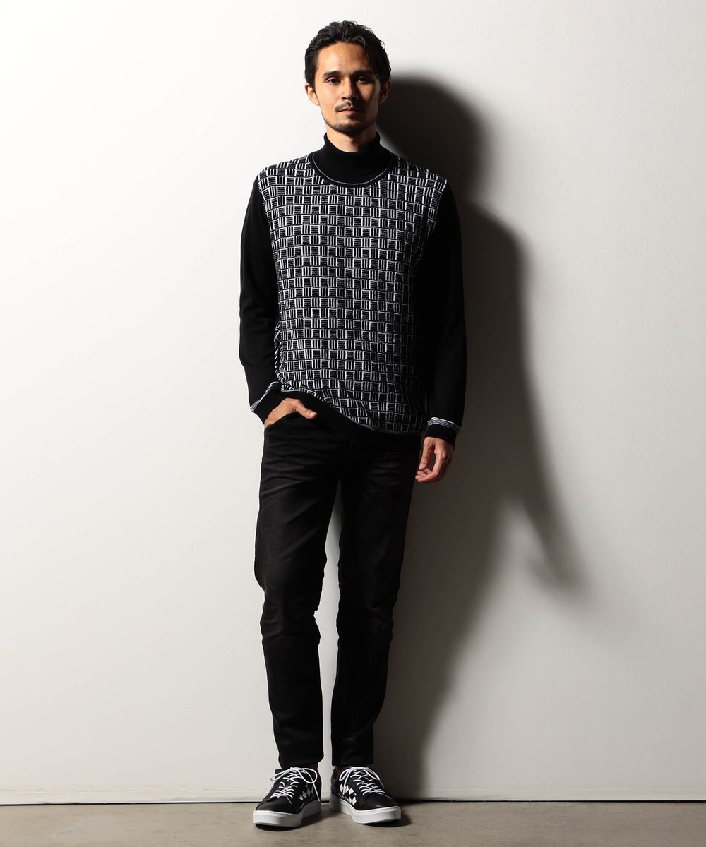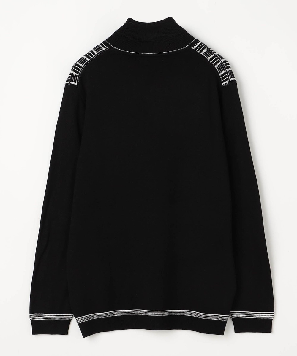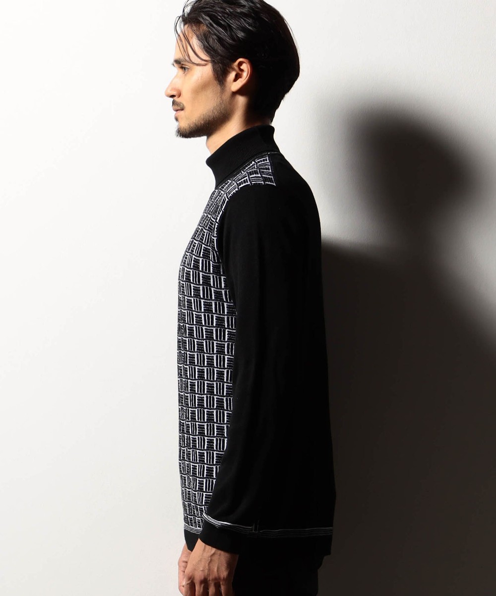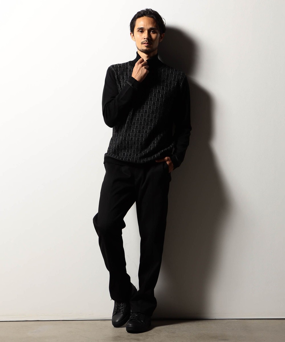 カットソー感覚で着られるタートルネックプルオーバーニット。前身には立体的に編み立てたブロックチェック柄を配色で表現して陰影感のある洗練された印象に仕上げました。衿付けと袖口、裾の切り替え部分には配色ラインのリンクス編みを入れたニットらしい遊び心のある一着です。脇下には消臭抗菌テープを入れて機能性もプラスしたこだわりの仕上がりです。