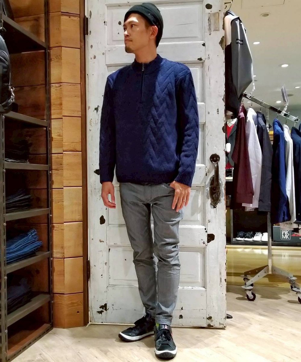 上品な編地の交差柄とスッキリとした衿元がアクセントのハーフジップポロニット。軽量で膨らみのあるソフトな風合いがウォーム感のある仕上がりです。