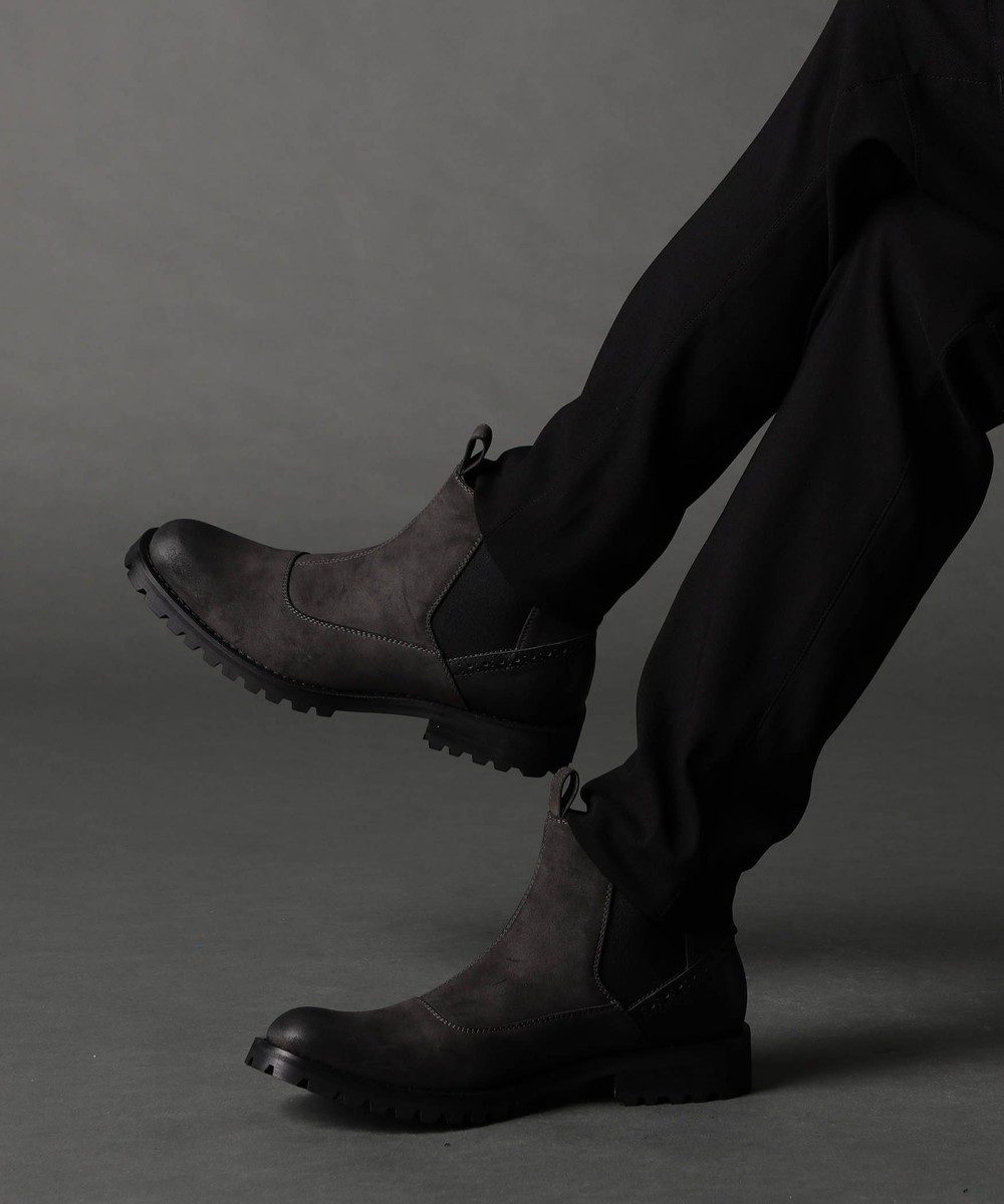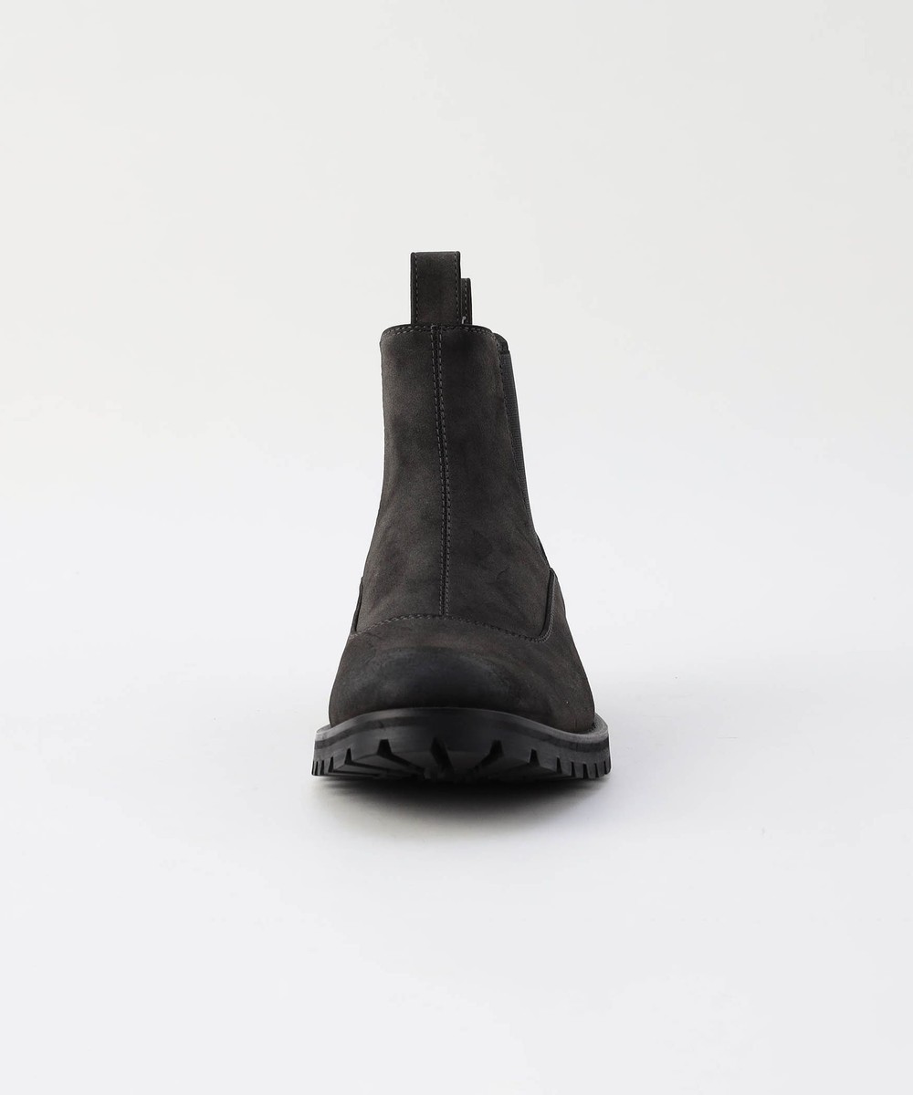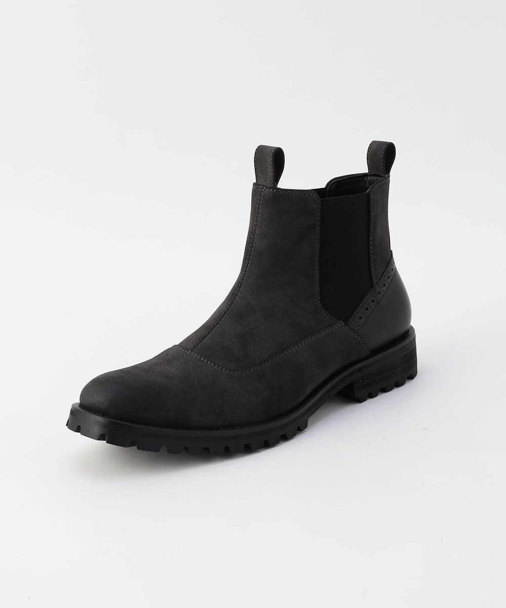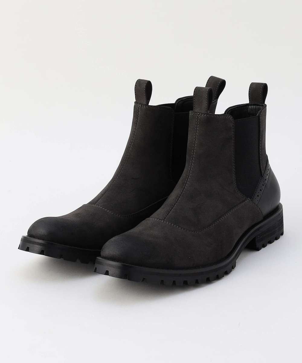 少し厚みのあるタンクソールのサイドゴアブーツ。トゥスプリングの効いたシャープなシルエットで少し細長いの綺麗なラスト(木型)を採用しています。履き口の形状や切り替えデザインなど曲線を意識した綺麗なラインが特徴的で、メダリオンを入れた牛革のヒールカウンターがアクセントです。インソールはフィット感の高いソフトなタイプを採用、タンクソールはコバを張り出し、中間に5?程のEVAを挟み、厚みのあるボリューム感を出しながら軽量感・クッション性を高めています。ブランドストーンなど機能性を重視したブランドに多い、履き口の前後にストラップを付けていますので履きやすいです。トゥ部分には手作業による仕上げ加工を強めに入れて重厚感のある雰囲気を出しました。綺麗めからカジュアルな組み合わせの相性も良いので冬のコーディネートの幅を広げてくれます。(※EVAとは、エチレンビニールアセテートの頭文字をとったソール素材の頭文字です。 EVA は自然に伸縮性のあるエラストマー ポリマー素材で、並外れた柔らかさと柔軟性を提供します。)