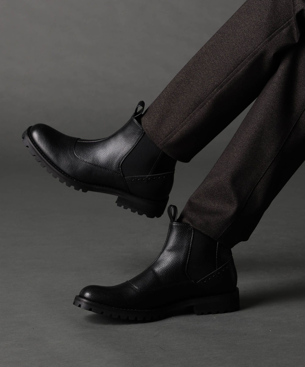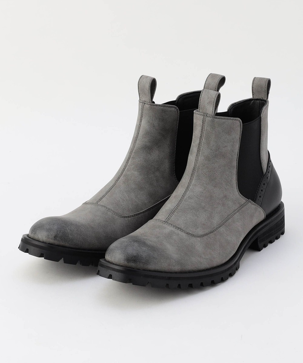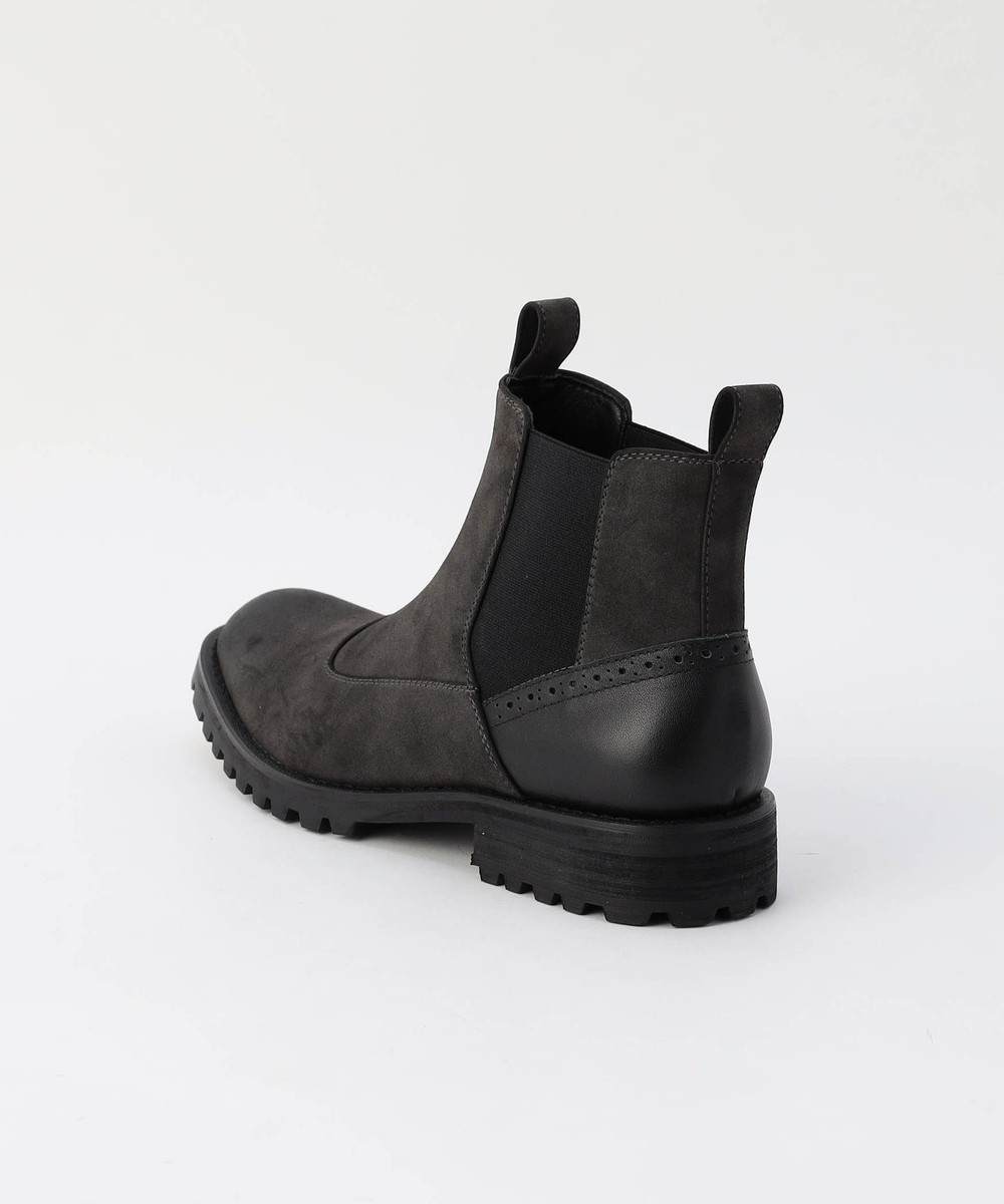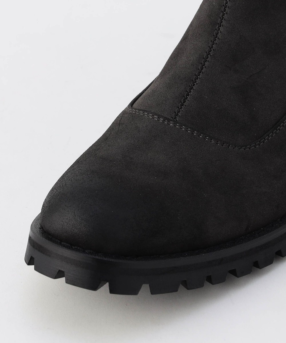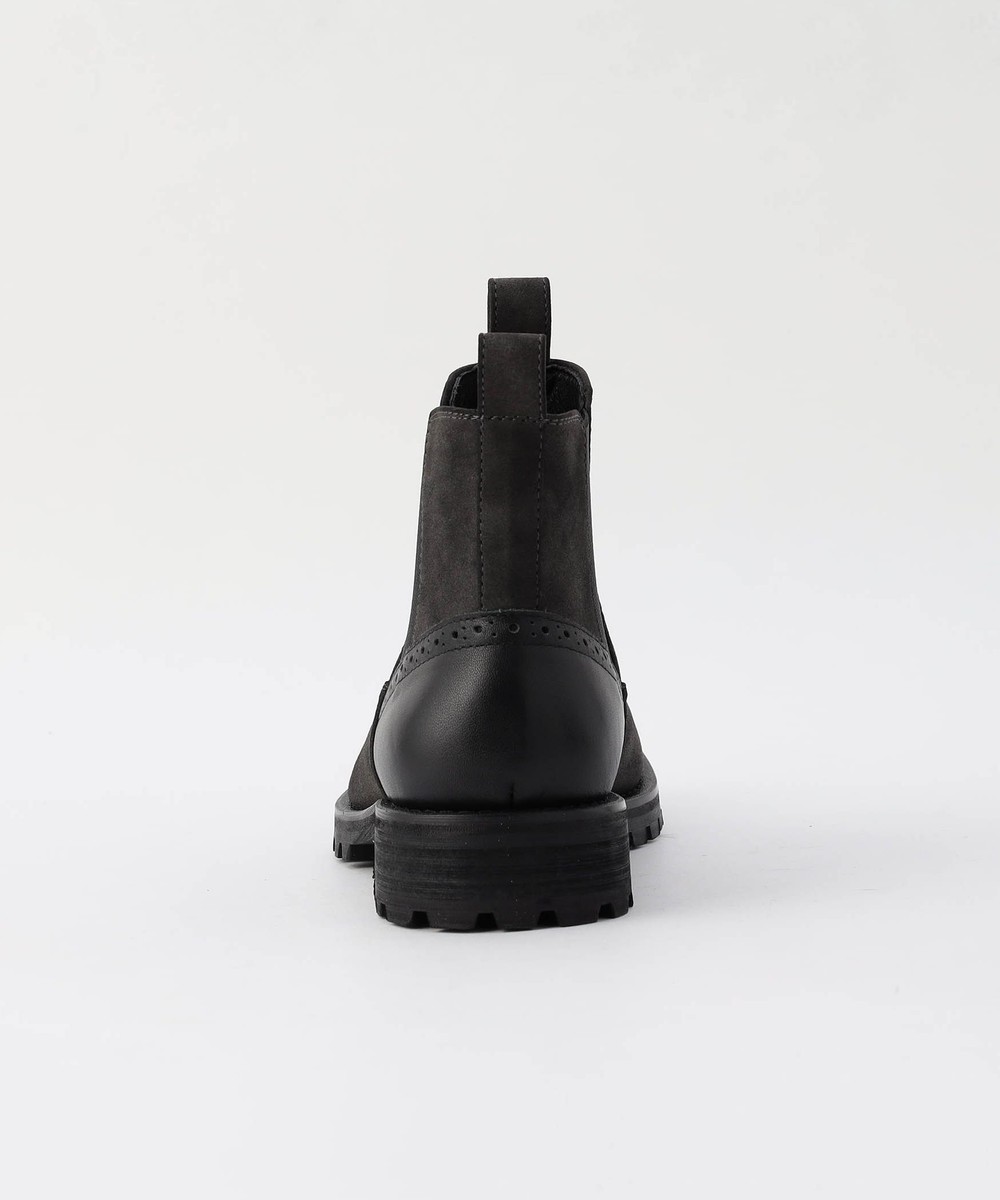少し厚みのあるタンクソールのサイドゴアブーツ。トゥスプリングの効いたシャープなシルエットで少し細長いの綺麗なラスト(木型)を採用しています。履き口の形状や切り替えデザインなど曲線を意識した綺麗なラインが特徴的で、メダリオンを入れた牛革のヒールカウンターがアクセントです。インソールはフィット感の高いソフトなタイプを採用、タンクソールはコバを張り出し、中間に5?程のEVAを挟み、厚みのあるボリューム感を出しながら軽量感・クッション性を高めています。ブランドストーンなど機能性を重視したブランドに多い、履き口の前後にストラップを付けていますので履きやすいです。トゥ部分には手作業による仕上げ加工を強めに入れて重厚感のある雰囲気を出しました。綺麗めからカジュアルな組み合わせの相性も良いので冬のコーディネートの幅を広げてくれます。(※EVAとは、エチレンビニールアセテートの頭文字をとったソール素材の頭文字です。 EVA は自然に伸縮性のあるエラストマー ポリマー素材で、並外れた柔らかさと柔軟性を提供します。)
