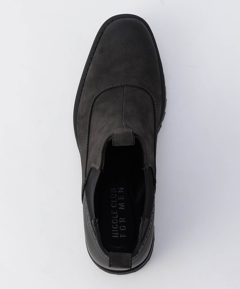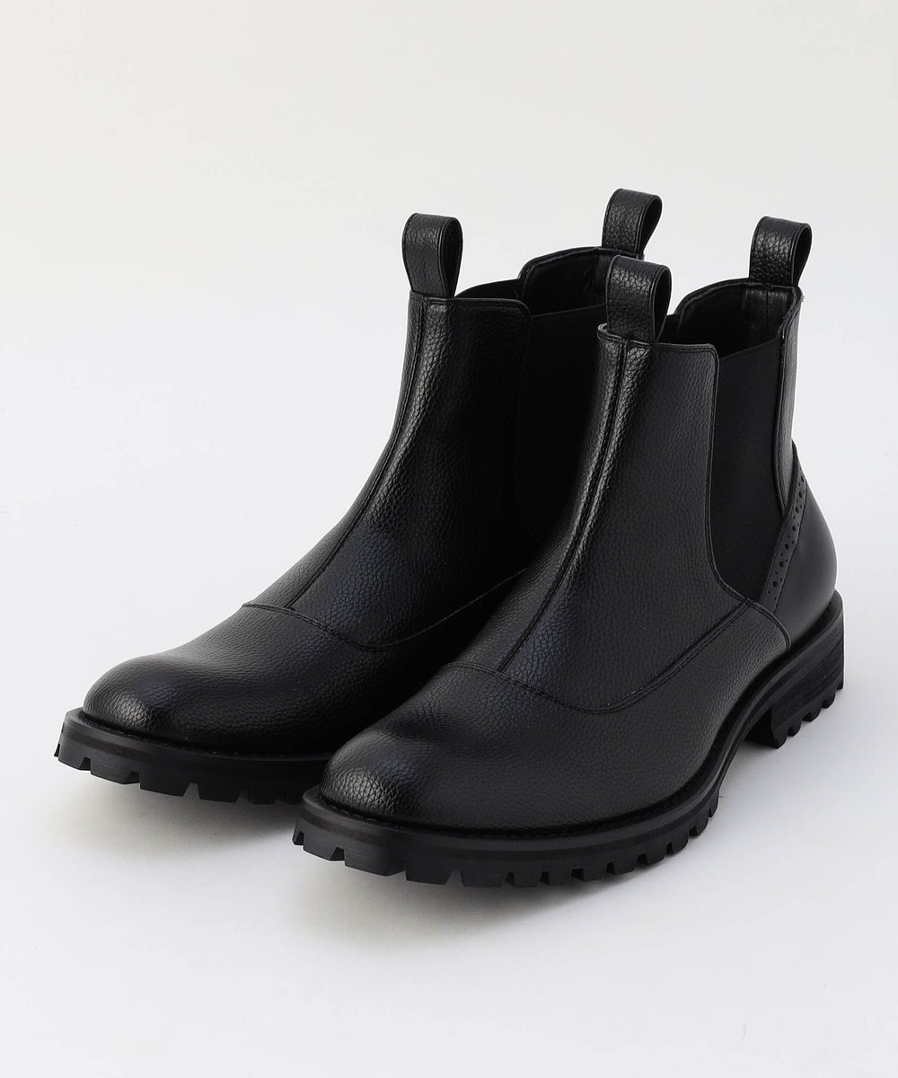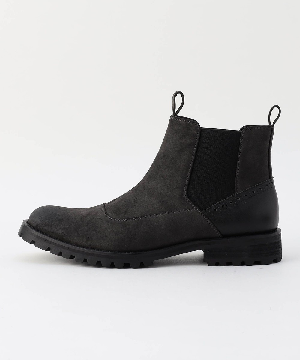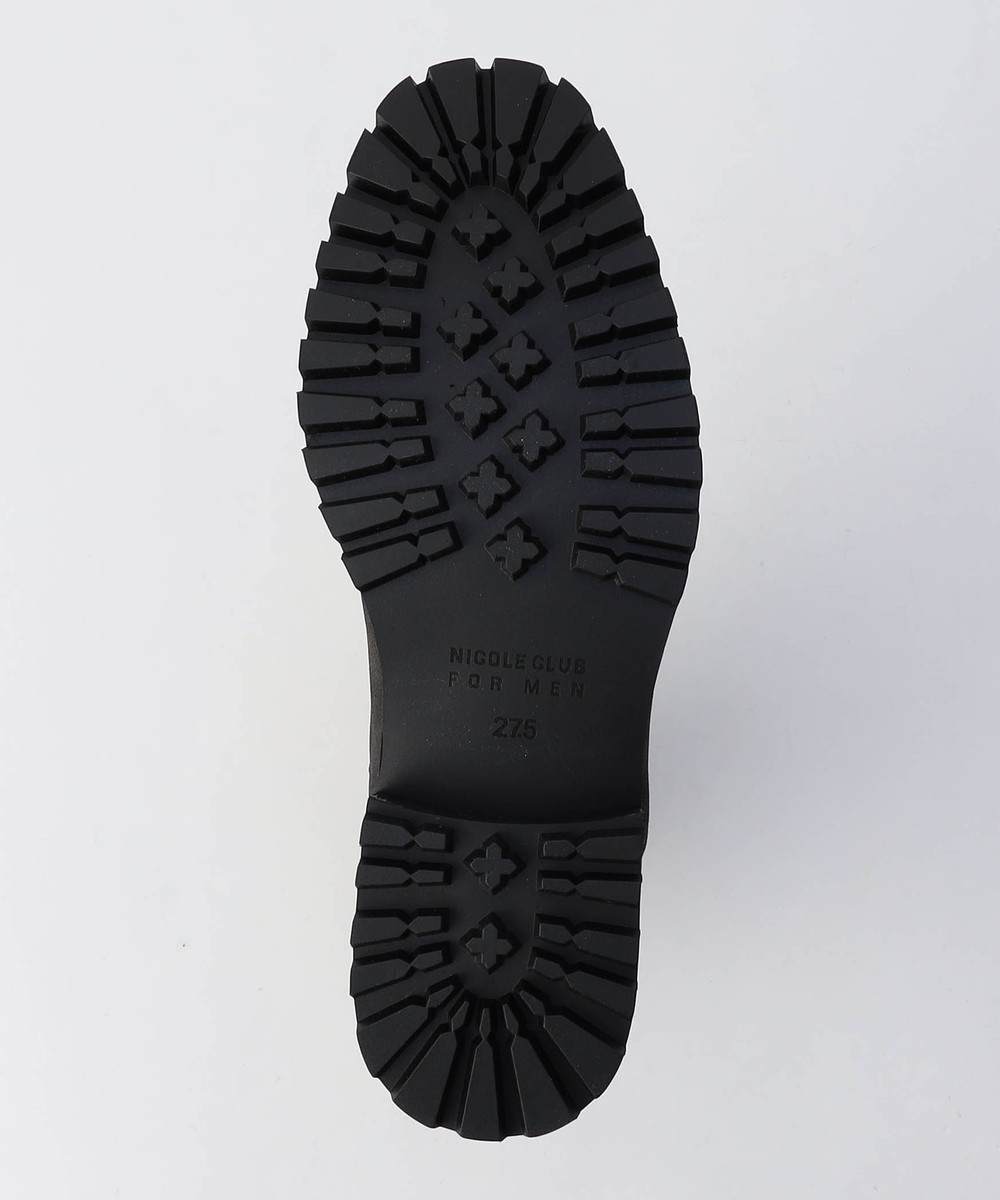 少し厚みのあるタンクソールのサイドゴアブーツ。トゥスプリングの効いたシャープなシルエットで少し細長いの綺麗なラスト(木型)を採用しています。履き口の形状や切り替えデザインなど曲線を意識した綺麗なラインが特徴的で、メダリオンを入れた牛革のヒールカウンターがアクセントです。インソールはフィット感の高いソフトなタイプを採用、タンクソールはコバを張り出し、中間に5?程のEVAを挟み、厚みのあるボリューム感を出しながら軽量感・クッション性を高めています。ブランドストーンなど機能性を重視したブランドに多い、履き口の前後にストラップを付けていますので履きやすいです。トゥ部分には手作業による仕上げ加工を強めに入れて重厚感のある雰囲気を出しました。綺麗めからカジュアルな組み合わせの相性も良いので冬のコーディネートの幅を広げてくれます。(※EVAとは、エチレンビニールアセテートの頭文字をとったソール素材の頭文字です。 EVA は自然に伸縮性のあるエラストマー ポリマー素材で、並外れた柔らかさと柔軟性を提供します。)
