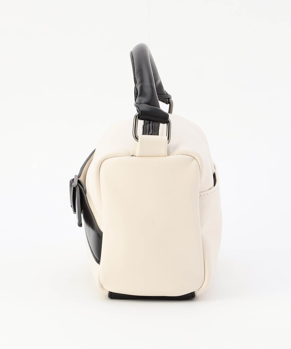 手持ち用のハンドルに加えて付属のショルダーベルトを取り付けて肩掛けも可能な2WAYバッグ。フロントのベルトデザインとブランドロゴがモードな印象を演出します。背面のセパレートポケットには小物やカード類を収納できるようにしました。更に内装にはファスナーポケットとパッチポケットを設けることでコンパクトながら物の仕分けも容易です。ブランドロゴ刻印入りのオリジナルファスナー引手をはじめ、金具類はブラックニッケルに統一して引き締めました。ジャケットスタイルにも合わせやすいシックな印象のバッグです。
