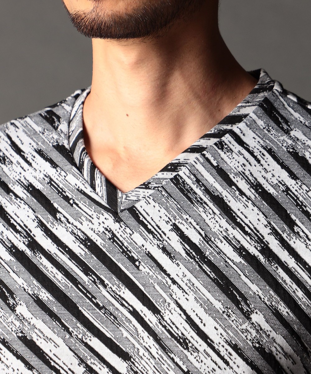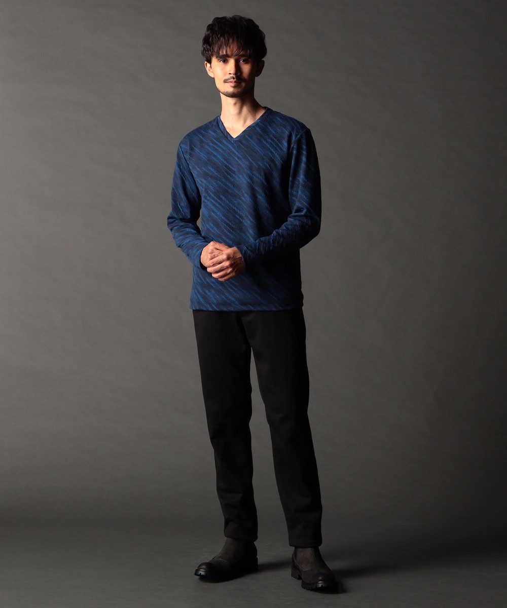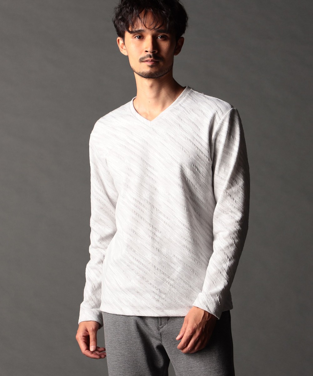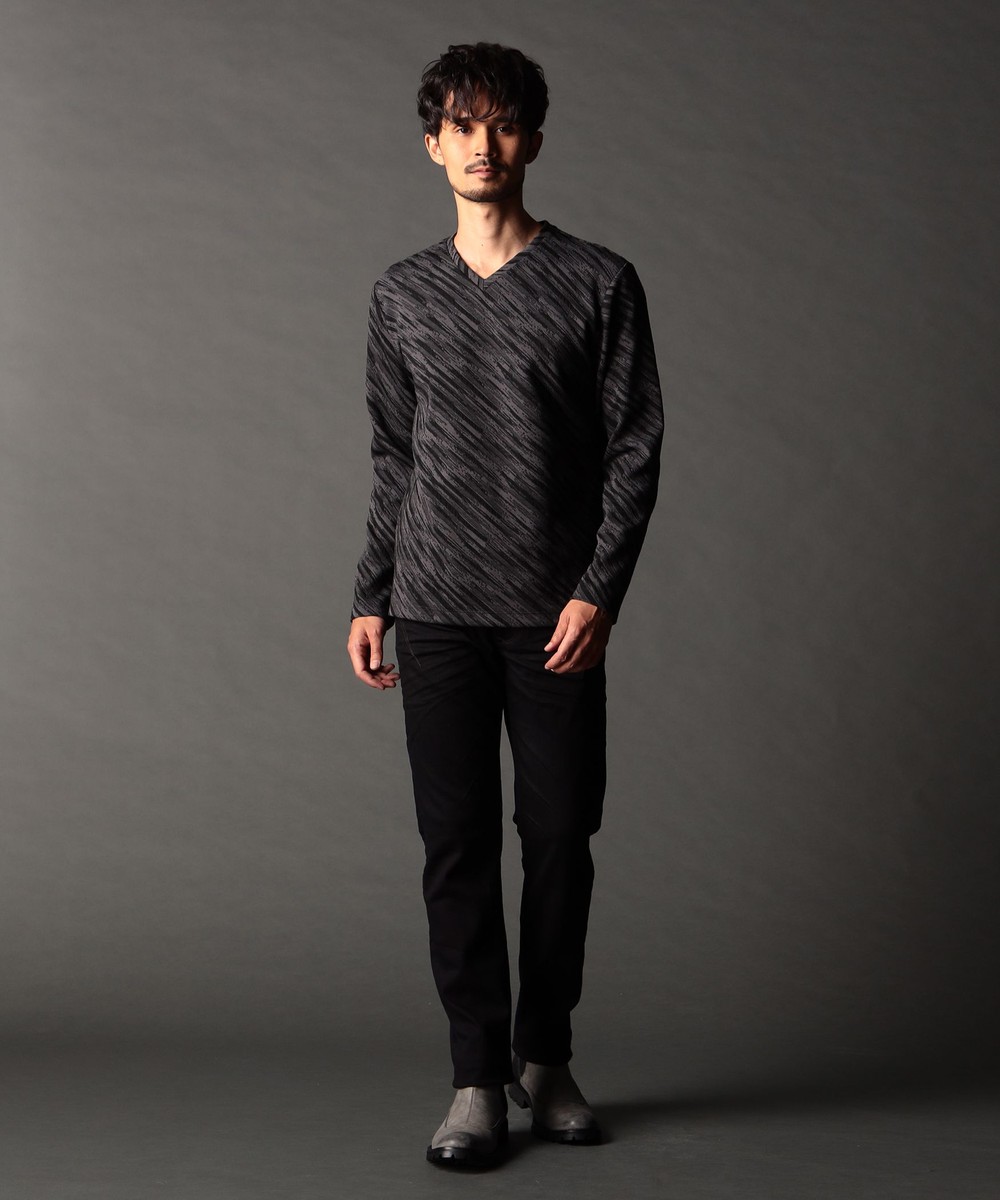 ストーム(嵐)のように流れるバイヤス柄をランダムな凹凸感のある膨れ編みで表現したVネックカットソー。