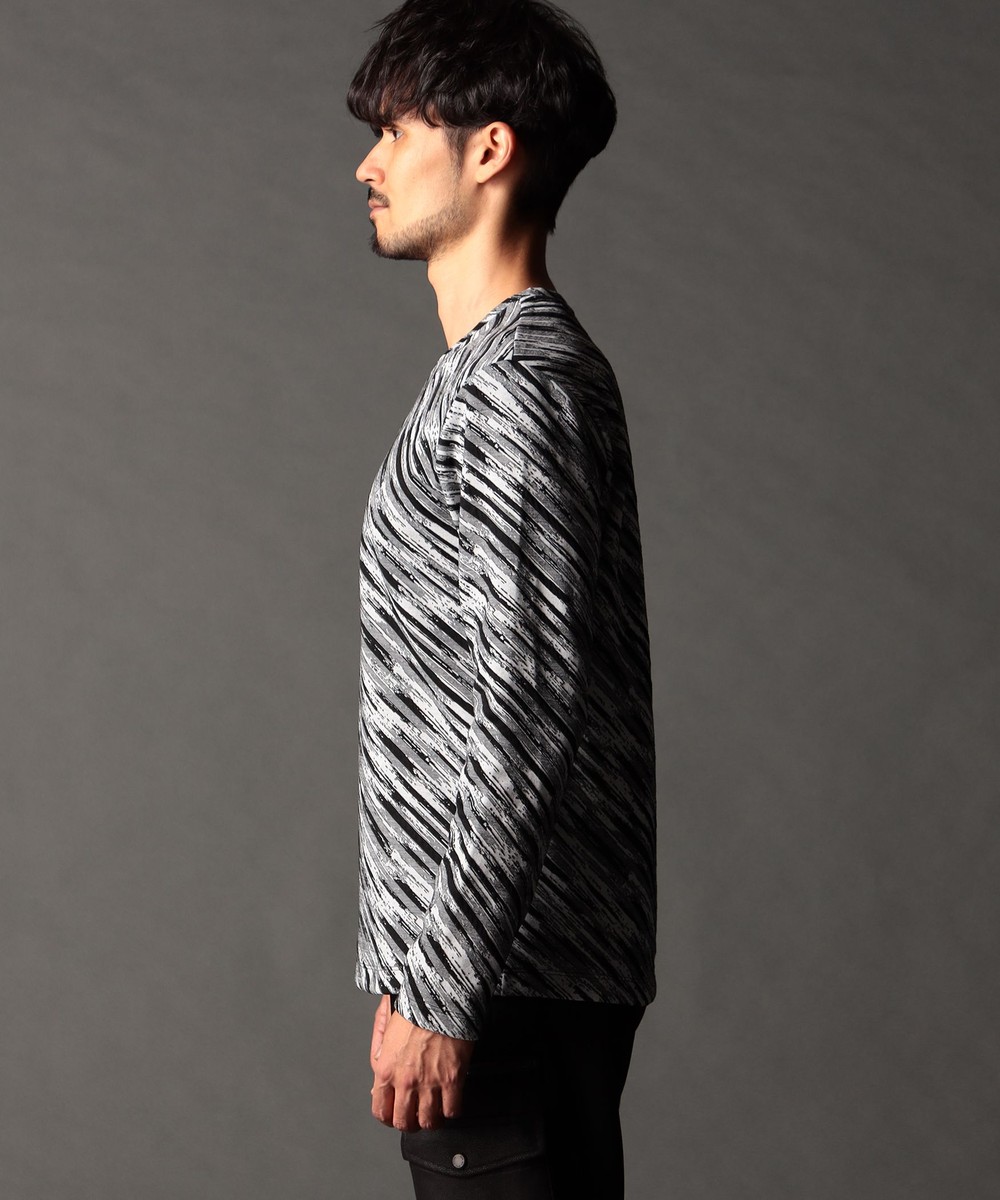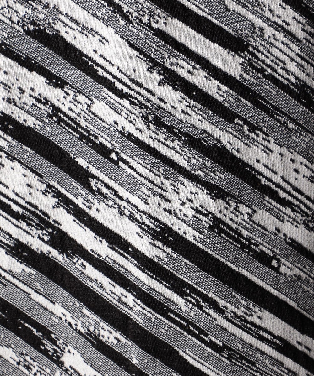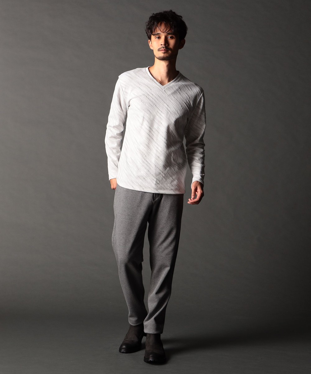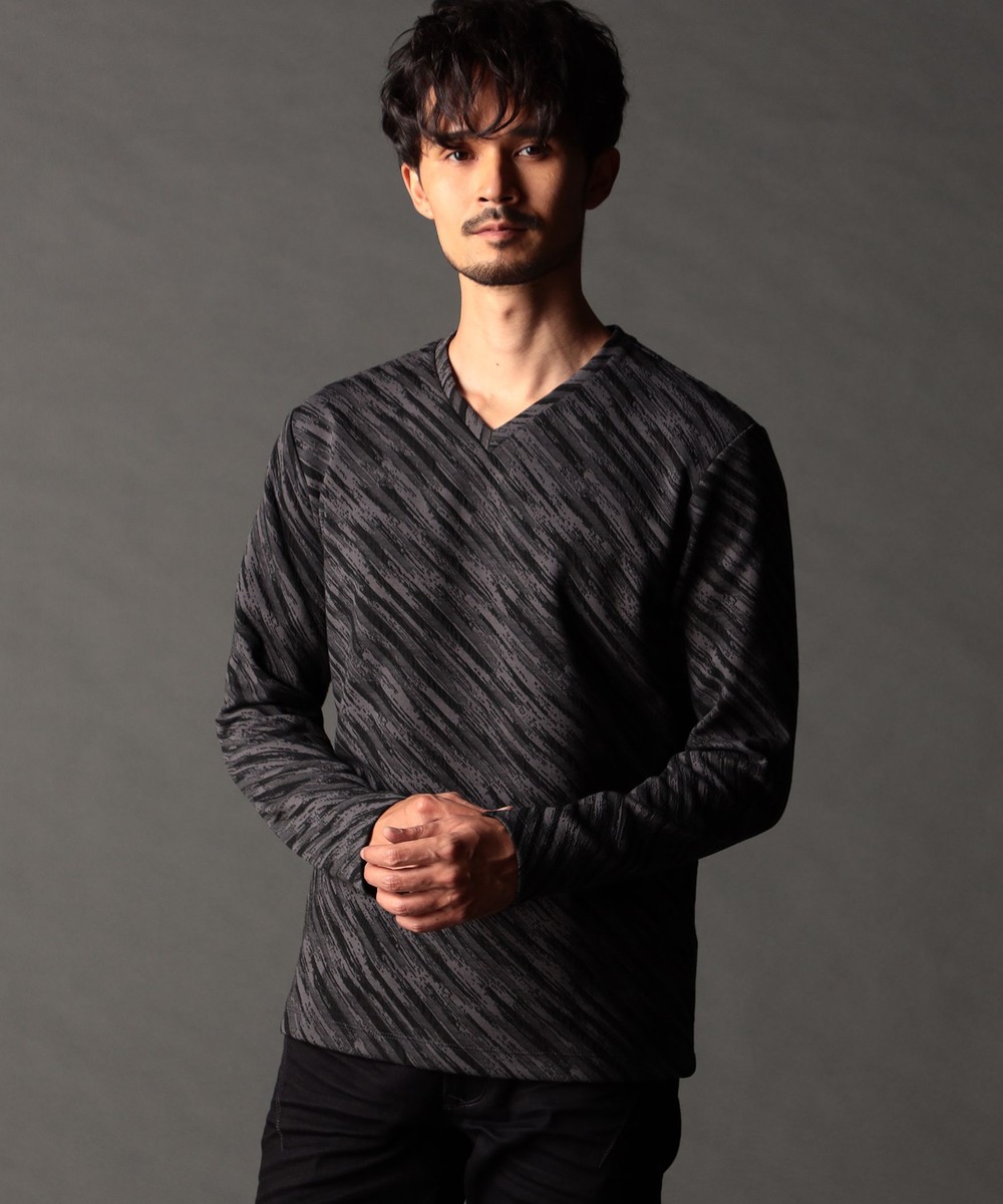 ストーム(嵐)のように流れるバイヤス柄をランダムな凹凸感のある膨れ編みで表現したVネックカットソー。