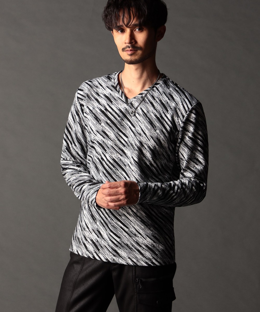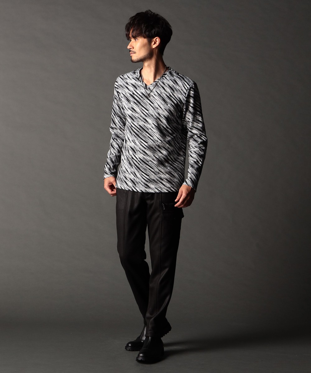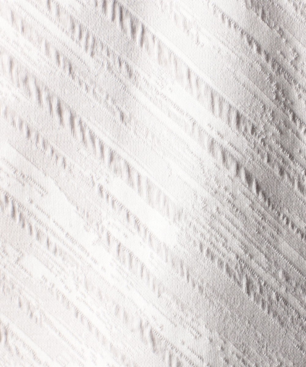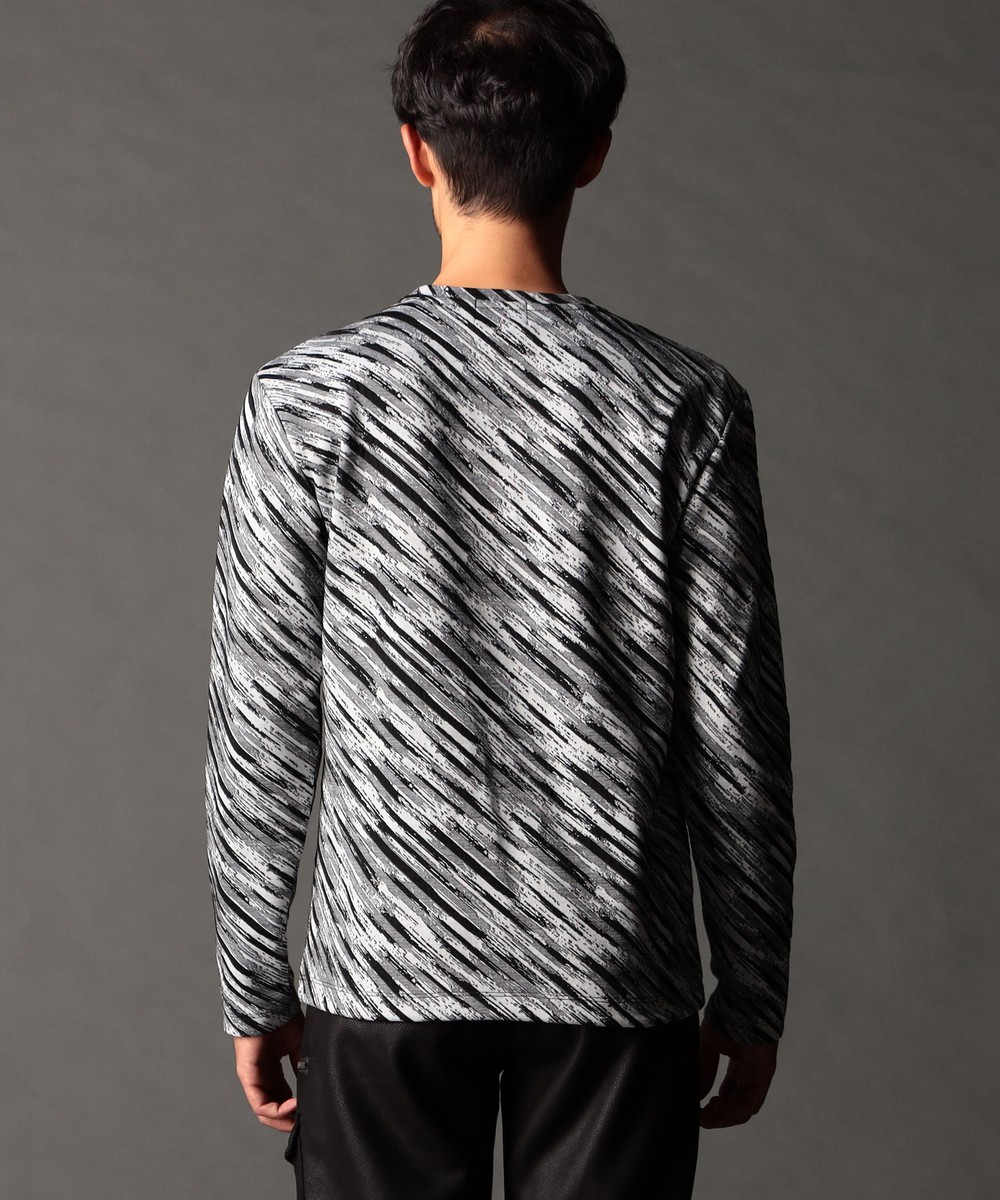 ストーム(嵐)のように流れるバイヤス柄をランダムな凹凸感のある膨れ編みで表現したVネックカットソー。