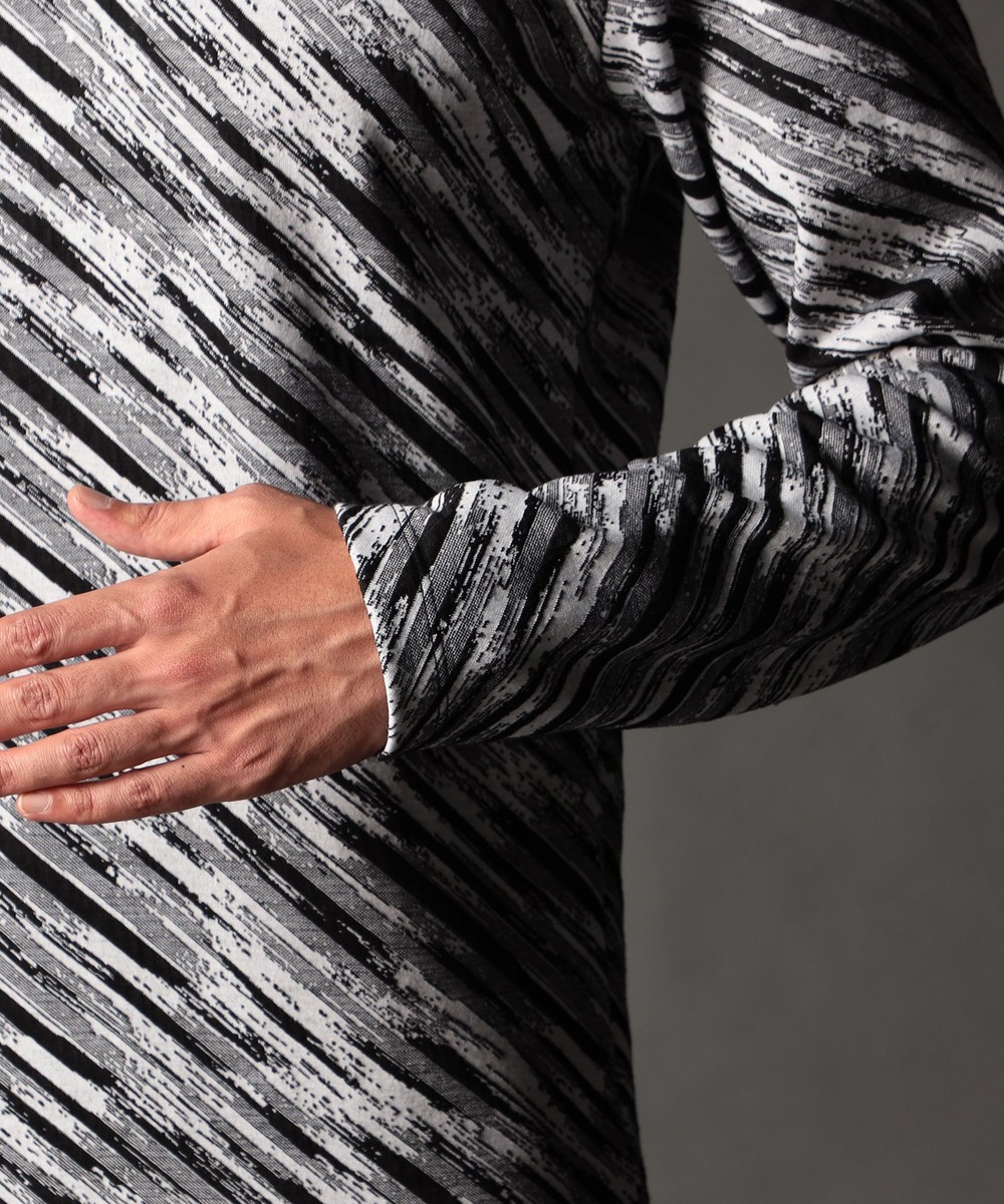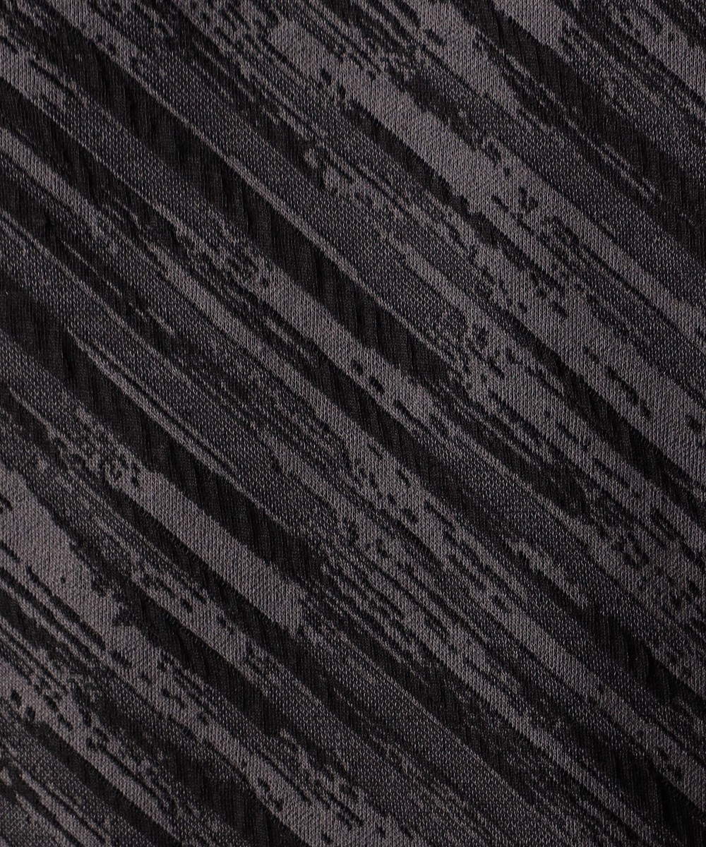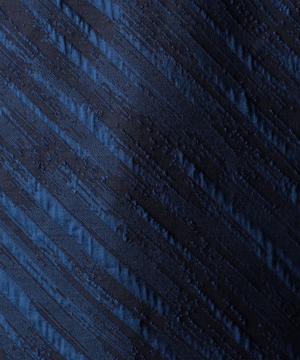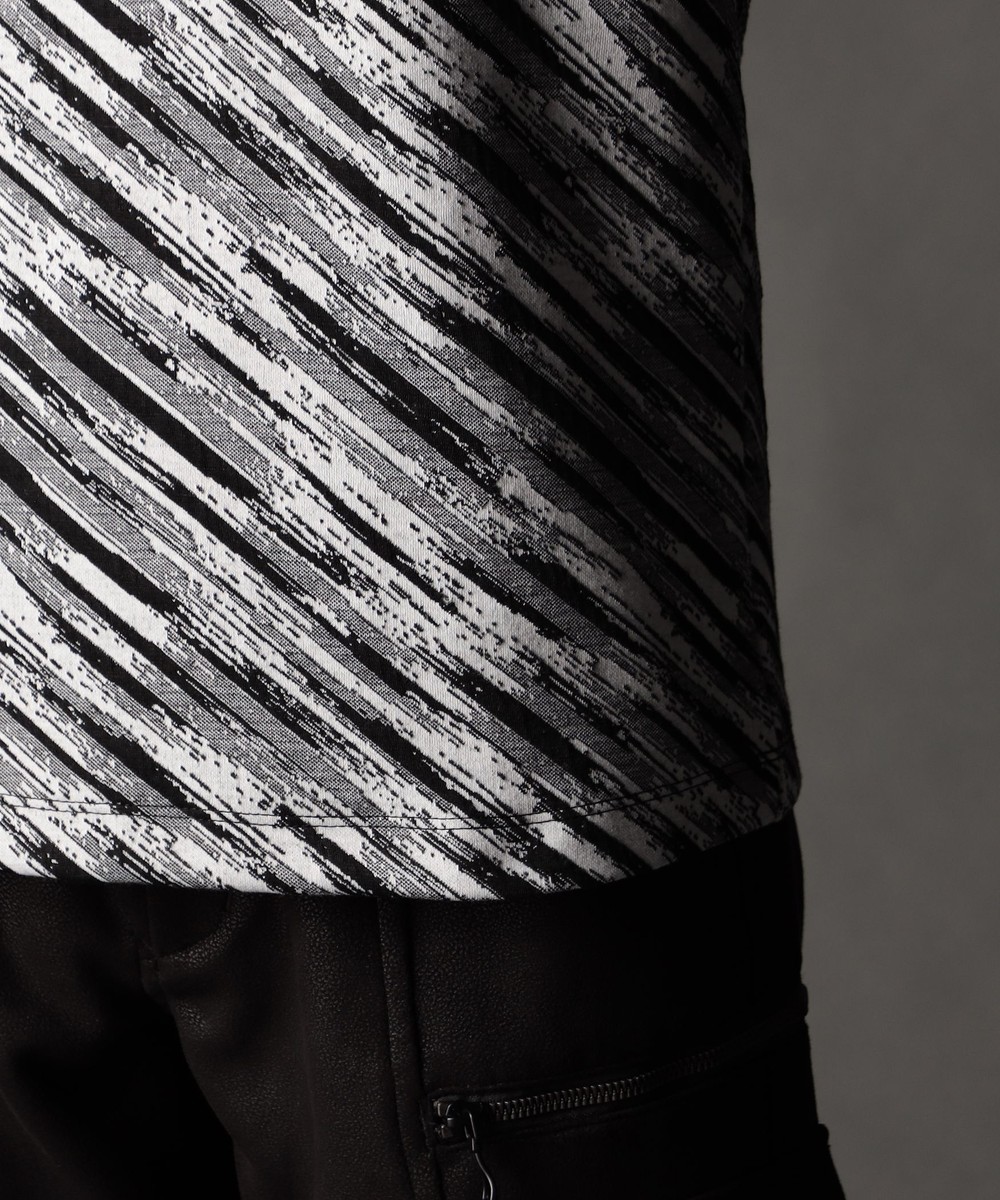ストーム(嵐)のように流れるバイヤス柄をランダムな凹凸感のある膨れ編みで表現したVネックカットソー。
