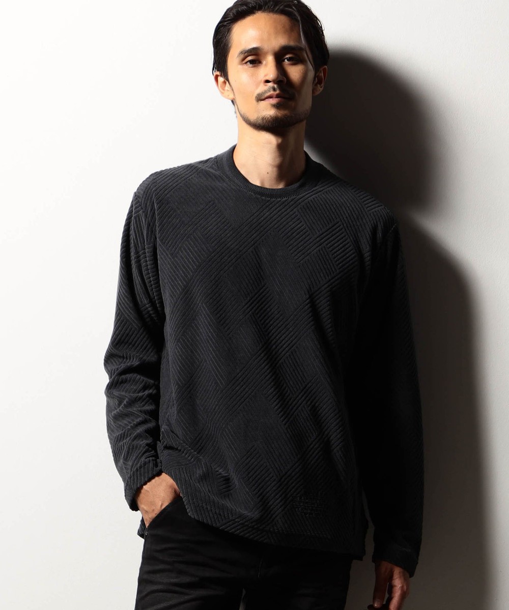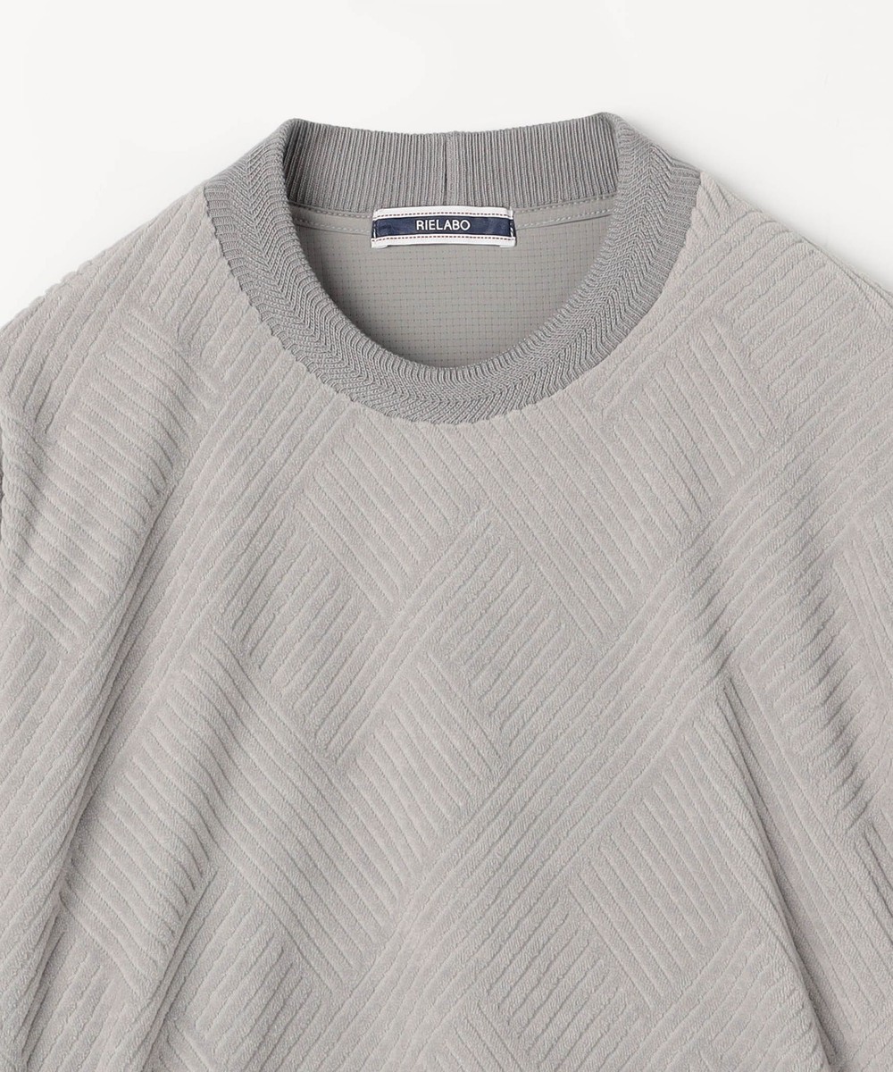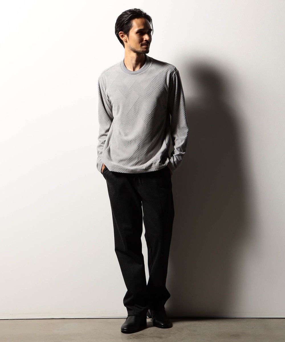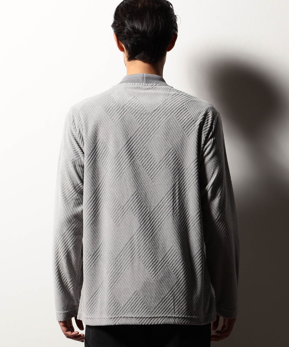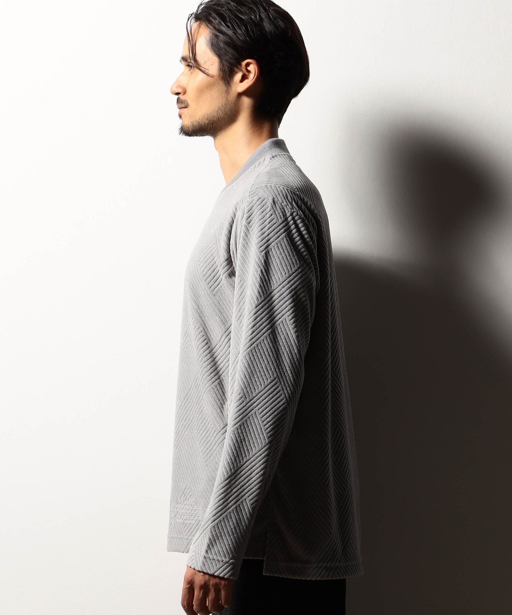 立体感のある幾何柄素材を使用したクルーネックカットソー。衿リブにはシェブロン(ヘリンボン)柄をジャカードで表現したデザインリブを採用しました。カットパイル特有の光沢感となめらかな手触りが季節感を高めます。脇前に入れた切り替えでシャープなシルエットを演出しつつ、接ぎ目にはシームポケットを設けて利便性を高めました。左裾のミルスペックタグ風刺繍をはじめ、肩から後衿にかけては別生地を使用したタコバインダー始末で型崩れを軽減、脇のスリット仕様や脇の縫い代には消臭抗菌テープを入れて機能性もプラスしたこだわりの仕上がりです。