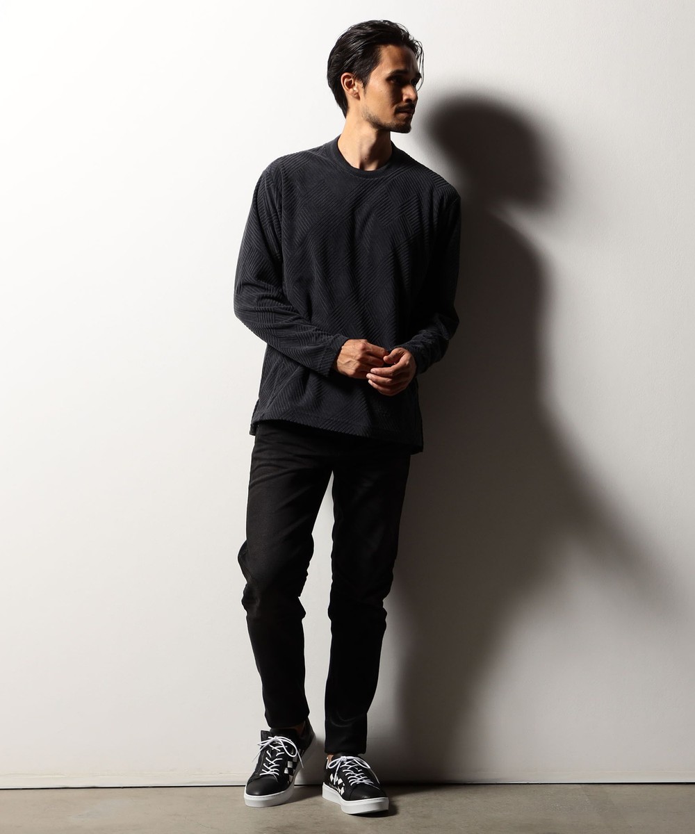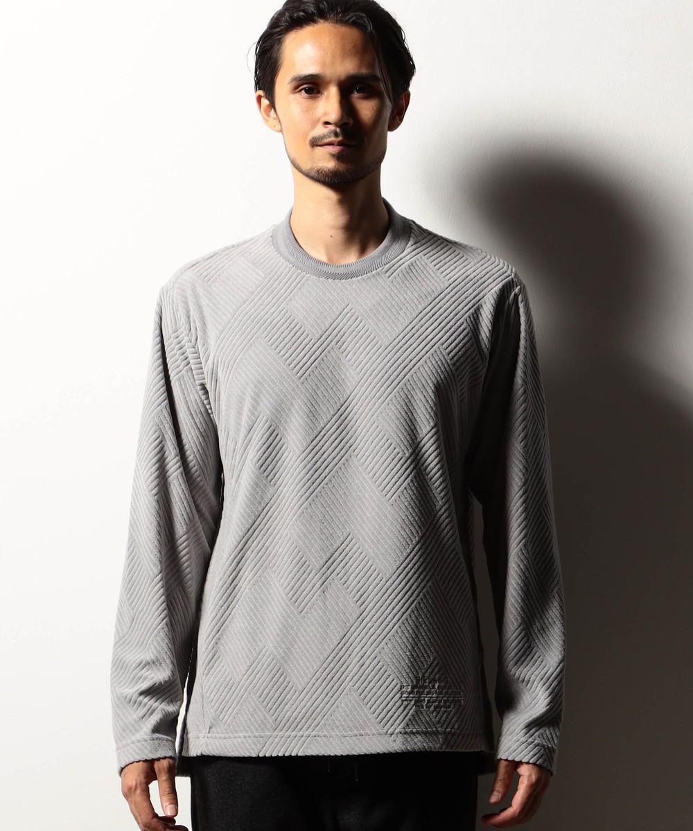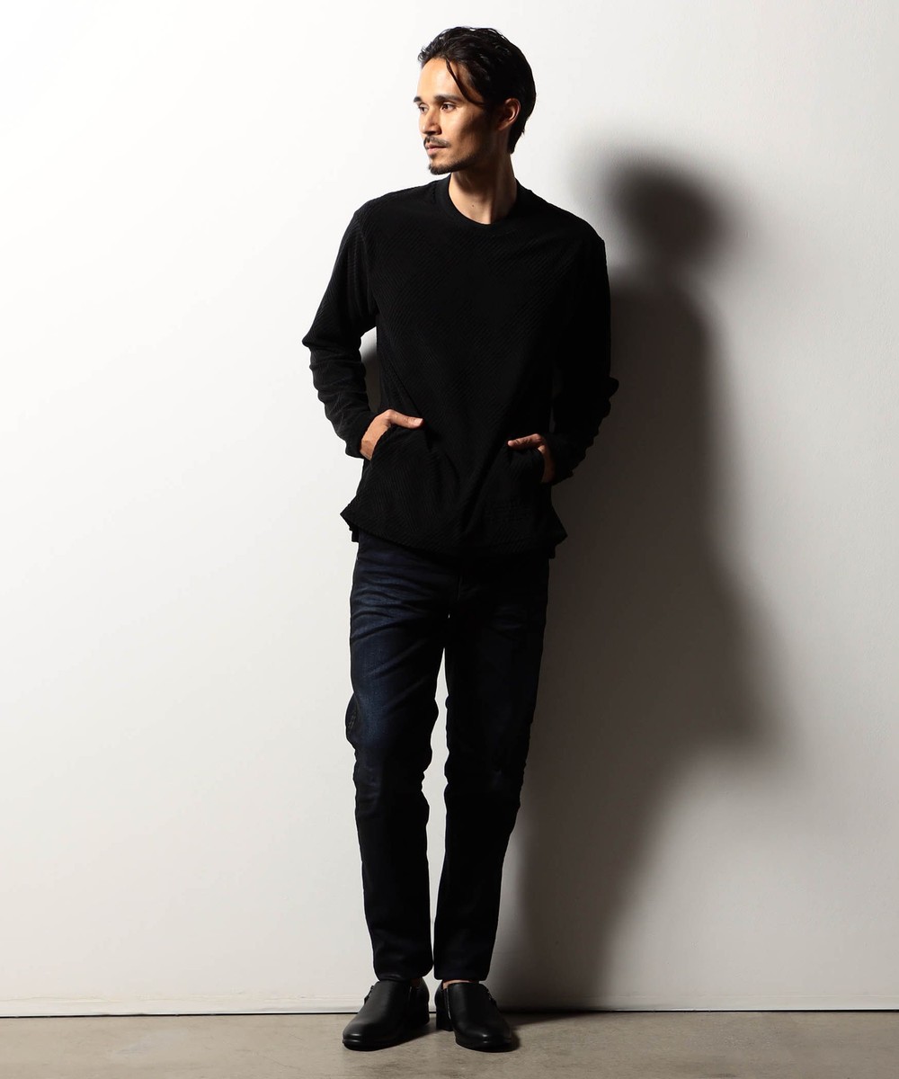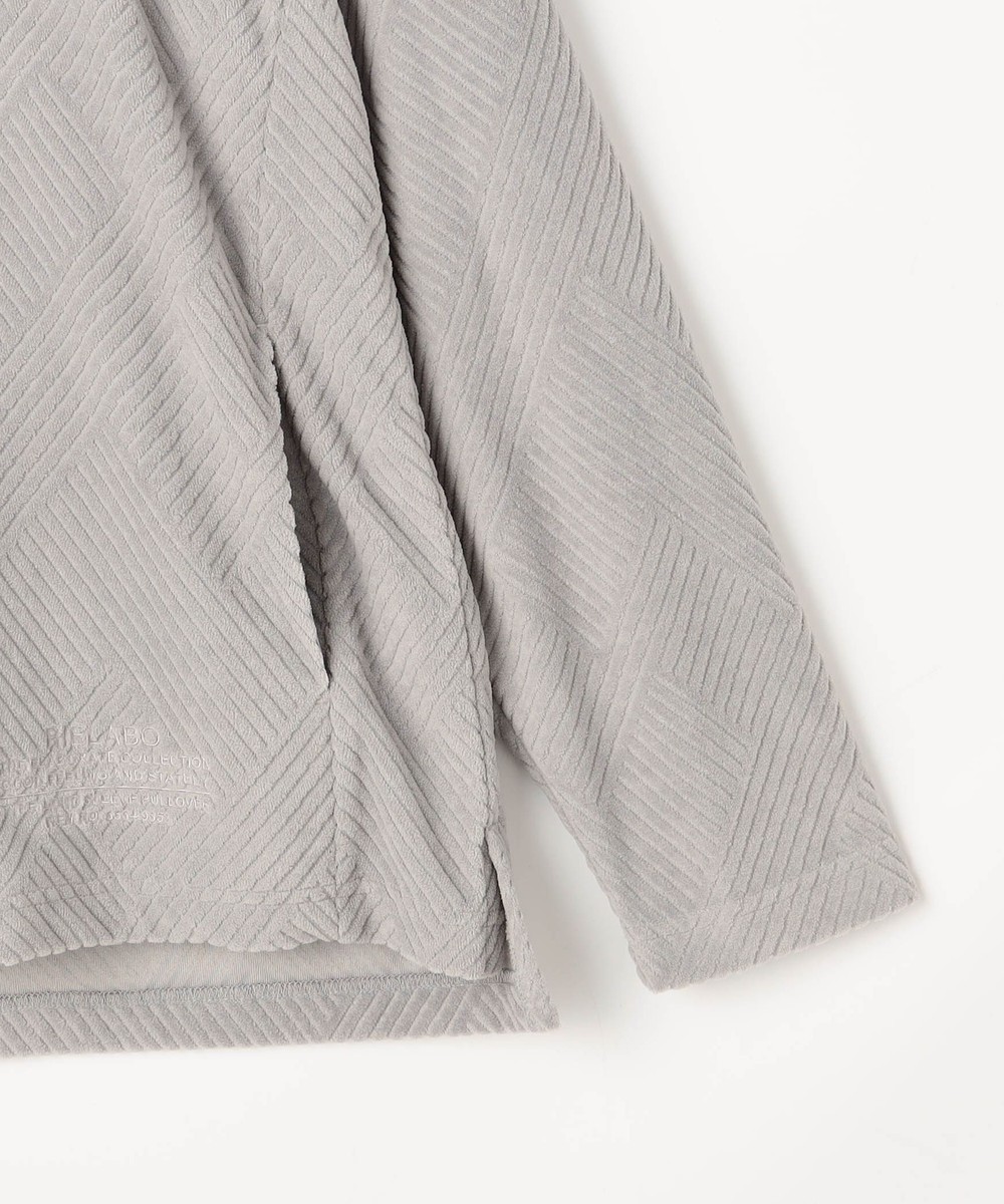 立体感のある幾何柄素材を使用したクルーネックカットソー。衿リブにはシェブロン(ヘリンボン)柄をジャカードで表現したデザインリブを採用しました。カットパイル特有の光沢感となめらかな手触りが季節感を高めます。脇前に入れた切り替えでシャープなシルエットを演出しつつ、接ぎ目にはシームポケットを設けて利便性を高めました。左裾のミルスペックタグ風刺繍をはじめ、肩から後衿にかけては別生地を使用したタコバインダー始末で型崩れを軽減、脇のスリット仕様や脇の縫い代には消臭抗菌テープを入れて機能性もプラスしたこだわりの仕上がりです。