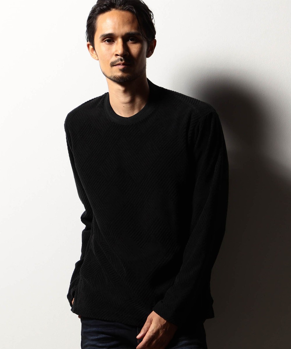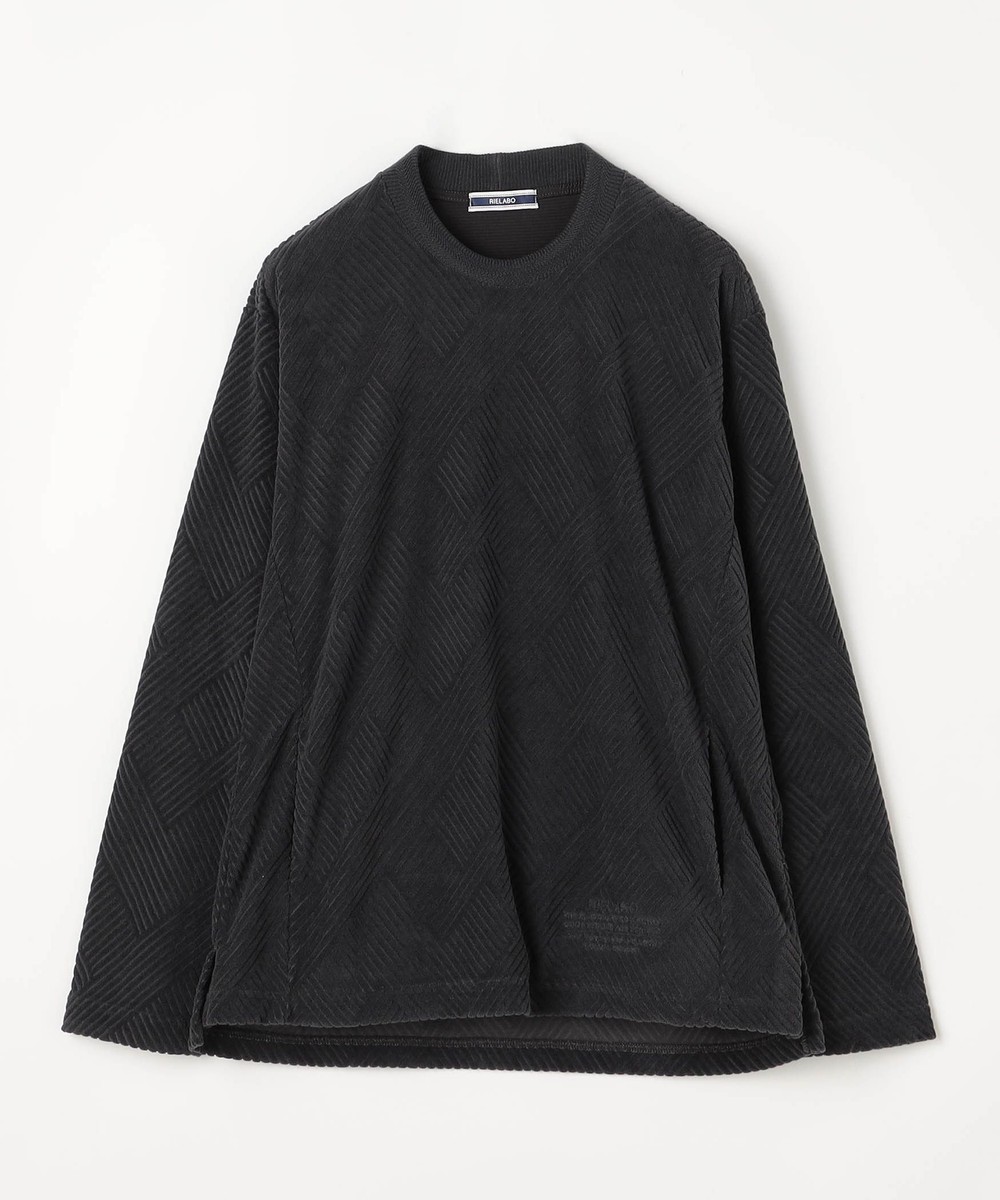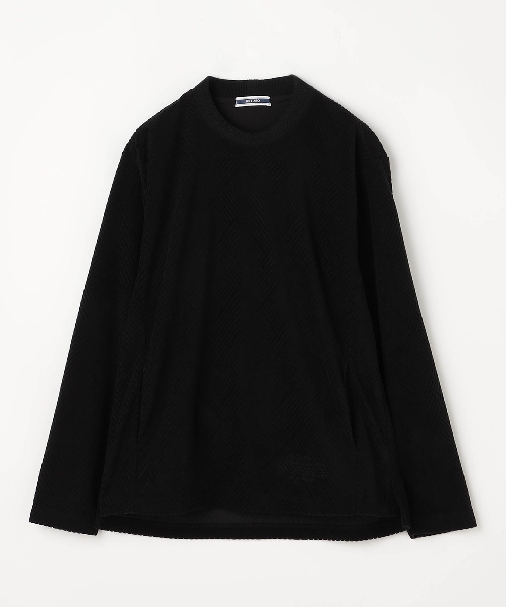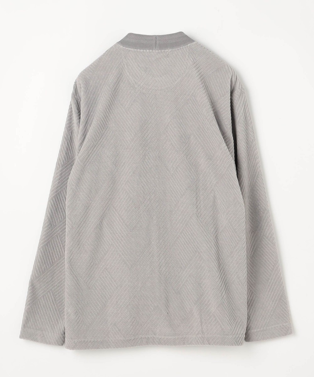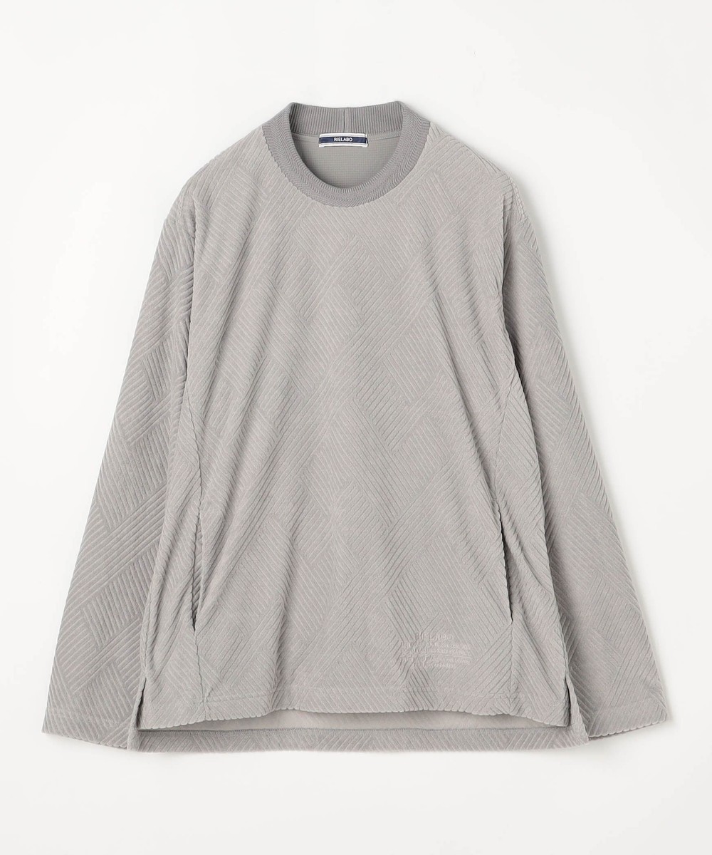 立体感のある幾何柄素材を使用したクルーネックカットソー。衿リブにはシェブロン(ヘリンボン)柄をジャカードで表現したデザインリブを採用しました。カットパイル特有の光沢感となめらかな手触りが季節感を高めます。脇前に入れた切り替えでシャープなシルエットを演出しつつ、接ぎ目にはシームポケットを設けて利便性を高めました。左裾のミルスペックタグ風刺繍をはじめ、肩から後衿にかけては別生地を使用したタコバインダー始末で型崩れを軽減、脇のスリット仕様や脇の縫い代には消臭抗菌テープを入れて機能性もプラスしたこだわりの仕上がりです。