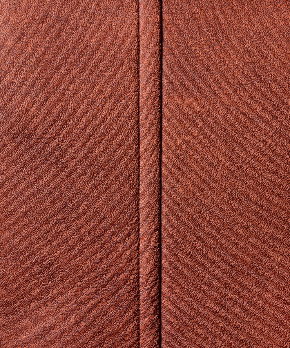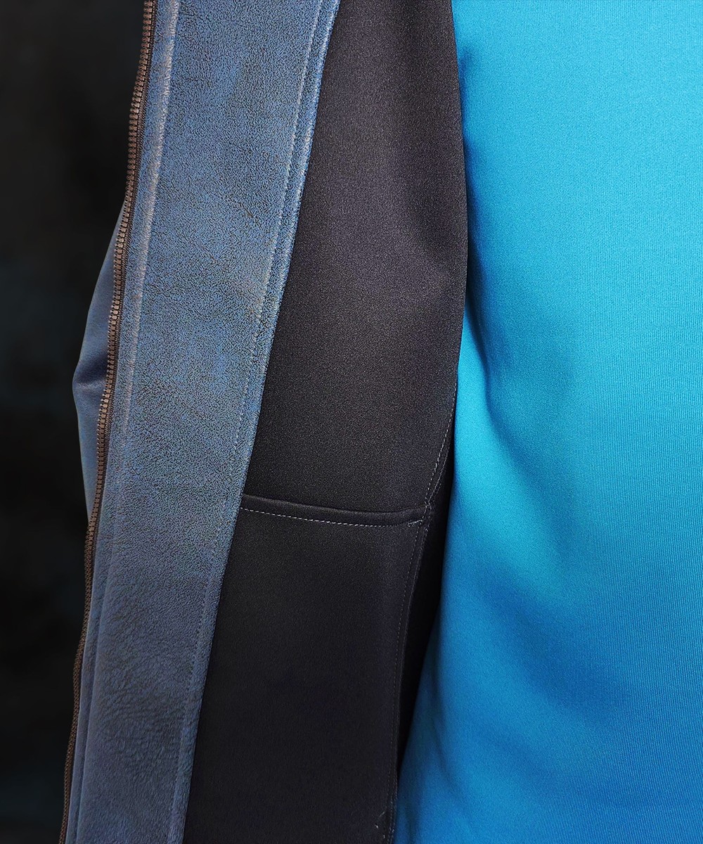 ジャージ素材ならではの横張り感・ストレッチ性はそのままに、マイクロファイバーを起毛したソフトな風合いに同色系のプリントを施す事でレザー調の質感を高めています。