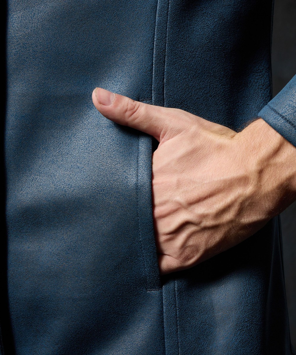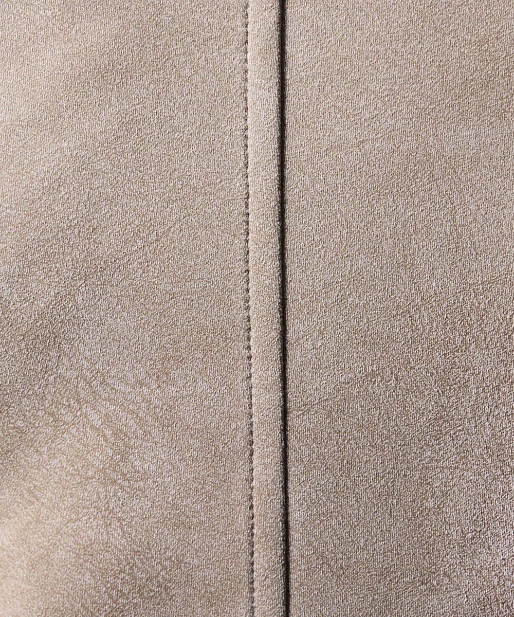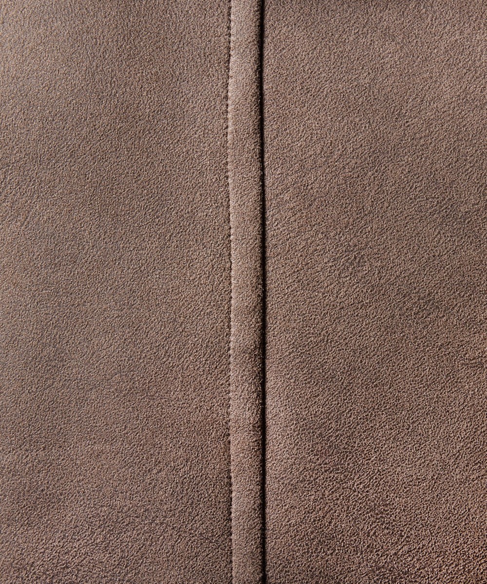 ポリエステルのマイクロファイバーで織られたカットソーポンチ素材をスウェード調に起毛し、更に細かいムラ柄のプリントを施しています。