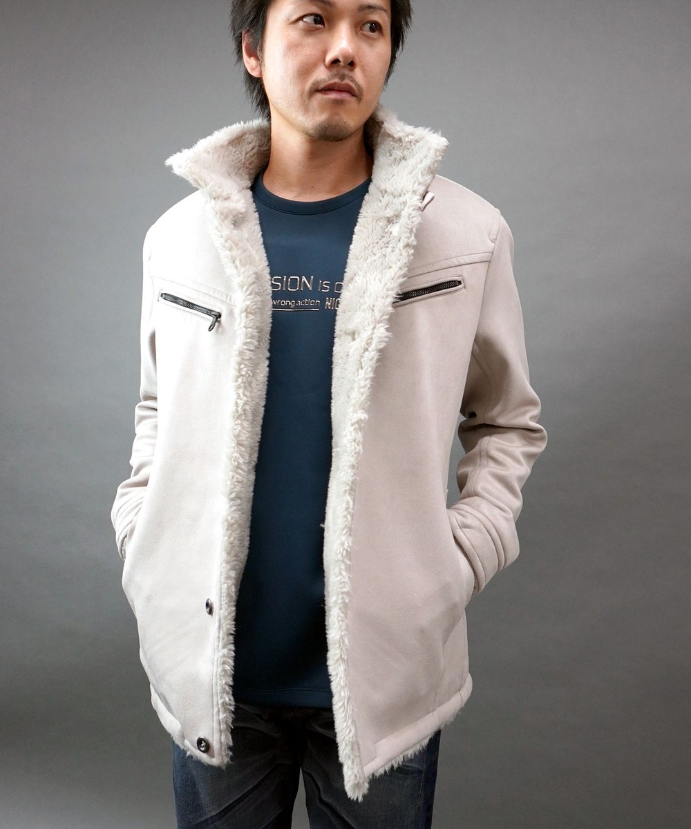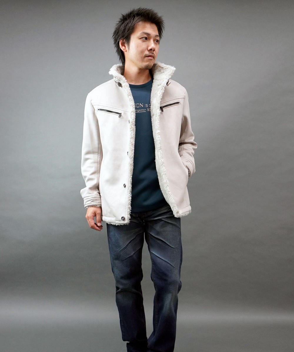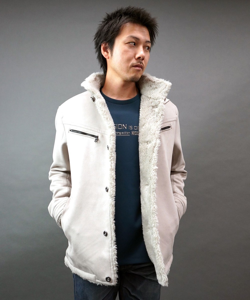 スウェードポンチ素材を表地を使用し、身頃裏全面にファーを配したデザインブルゾン。