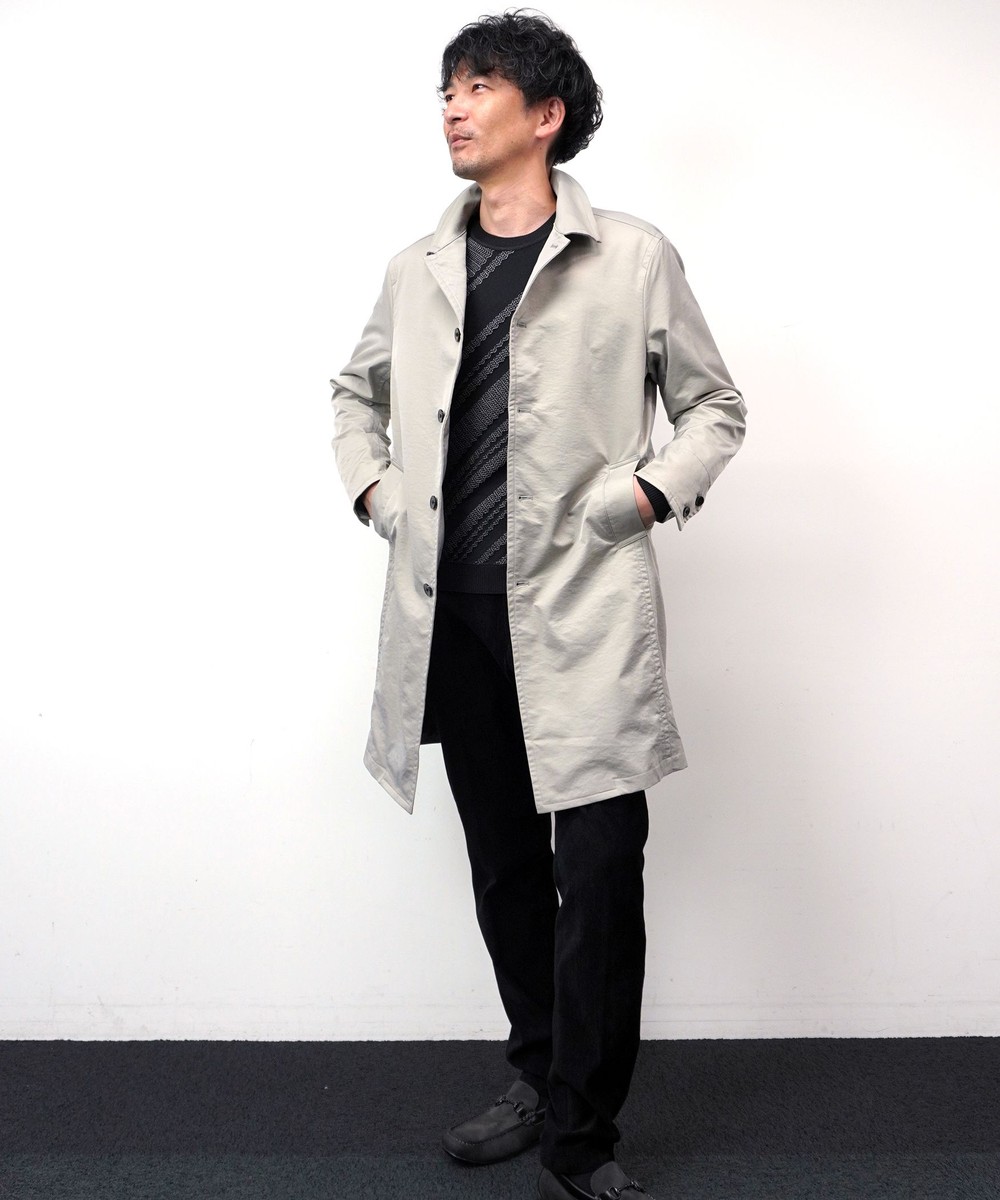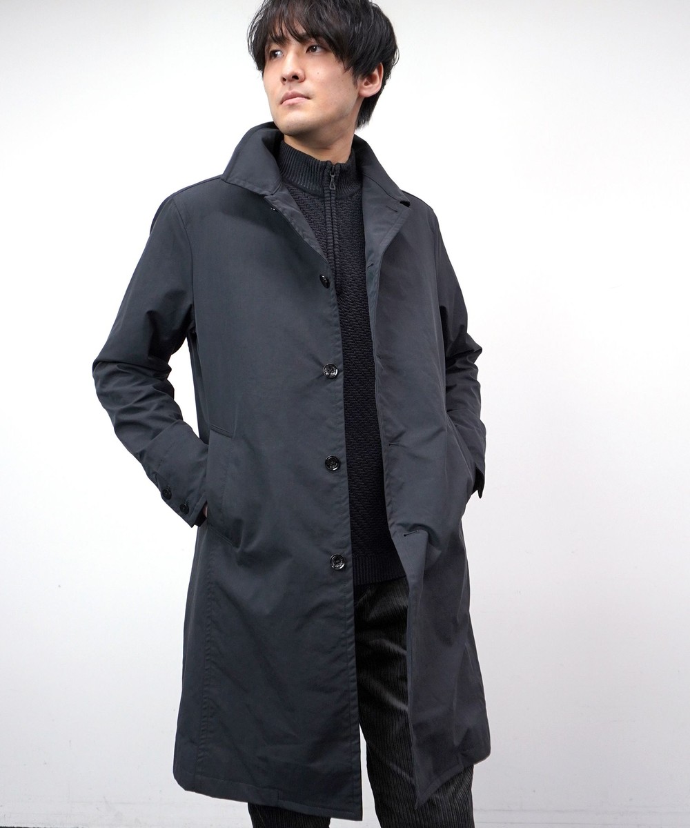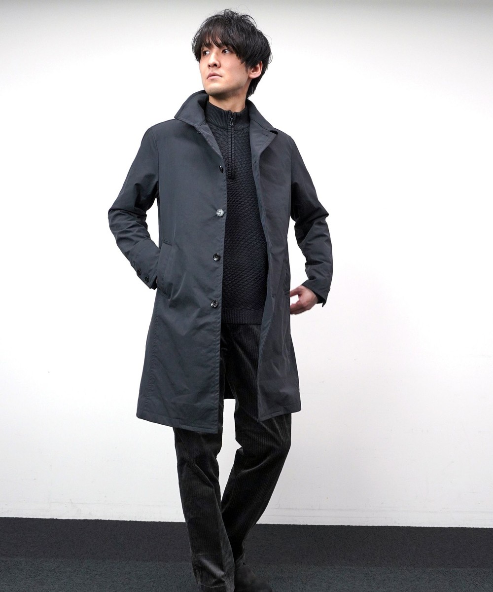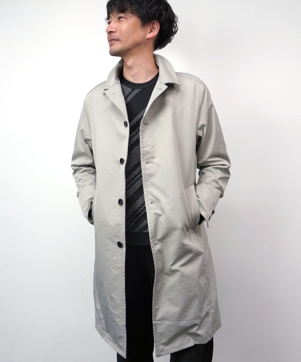 衿を立てても着れるようにした2way仕様のステンカラーコート。