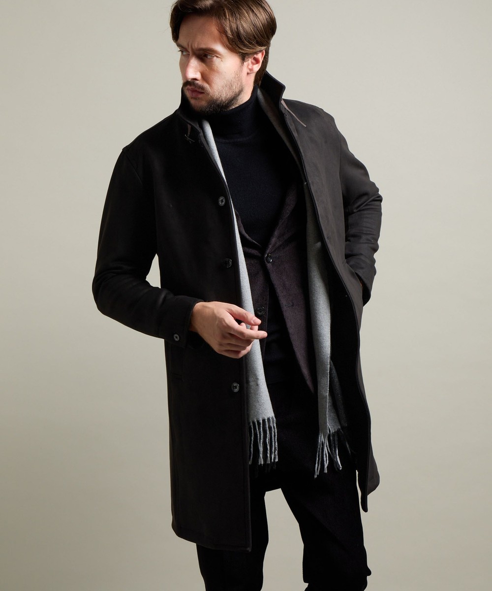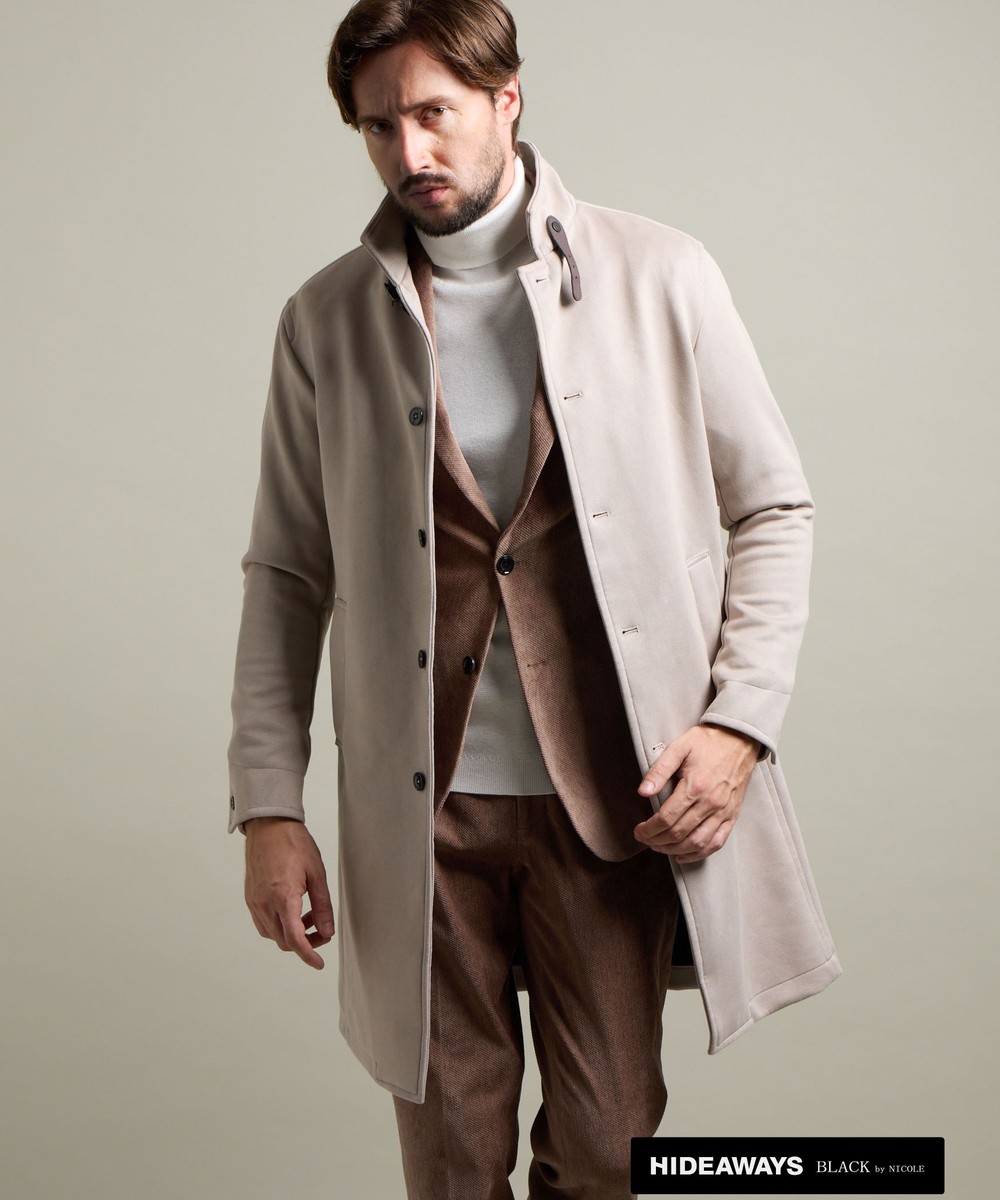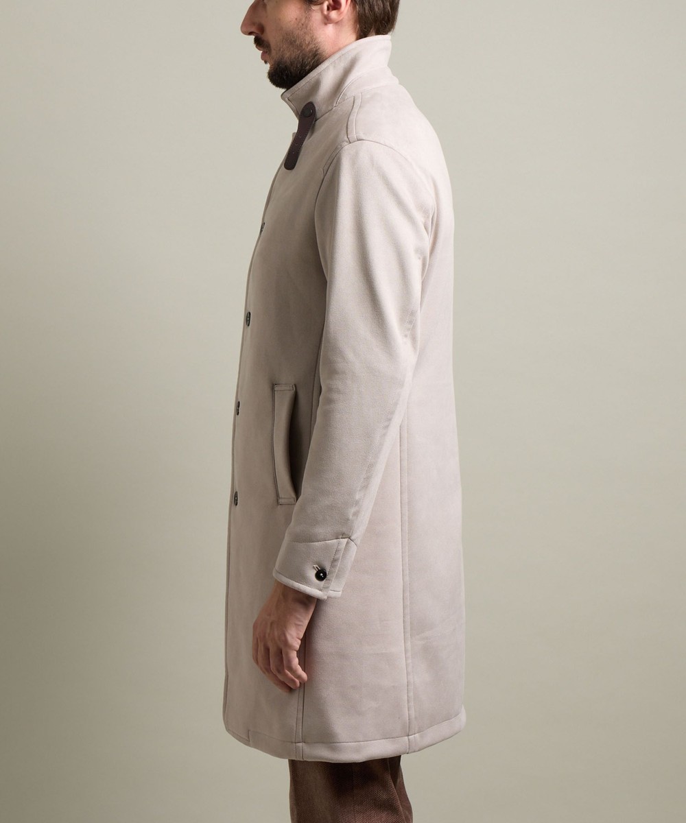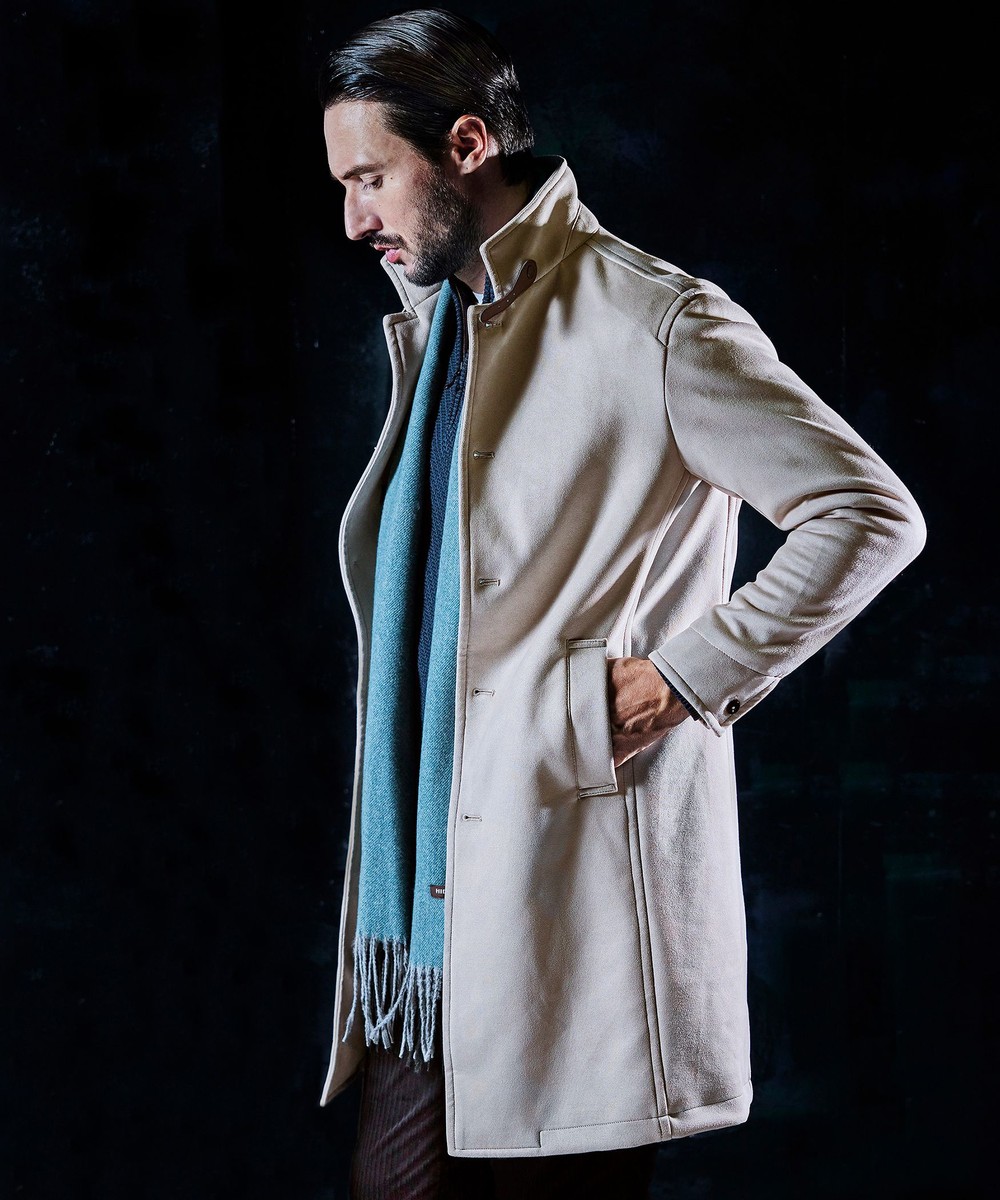衿は立てても、畳んでチェスターコートのようにも着れる2way仕様。表地のストレッチ性を損なわせない為、裏地には全面ストレッチ裏地を使用。