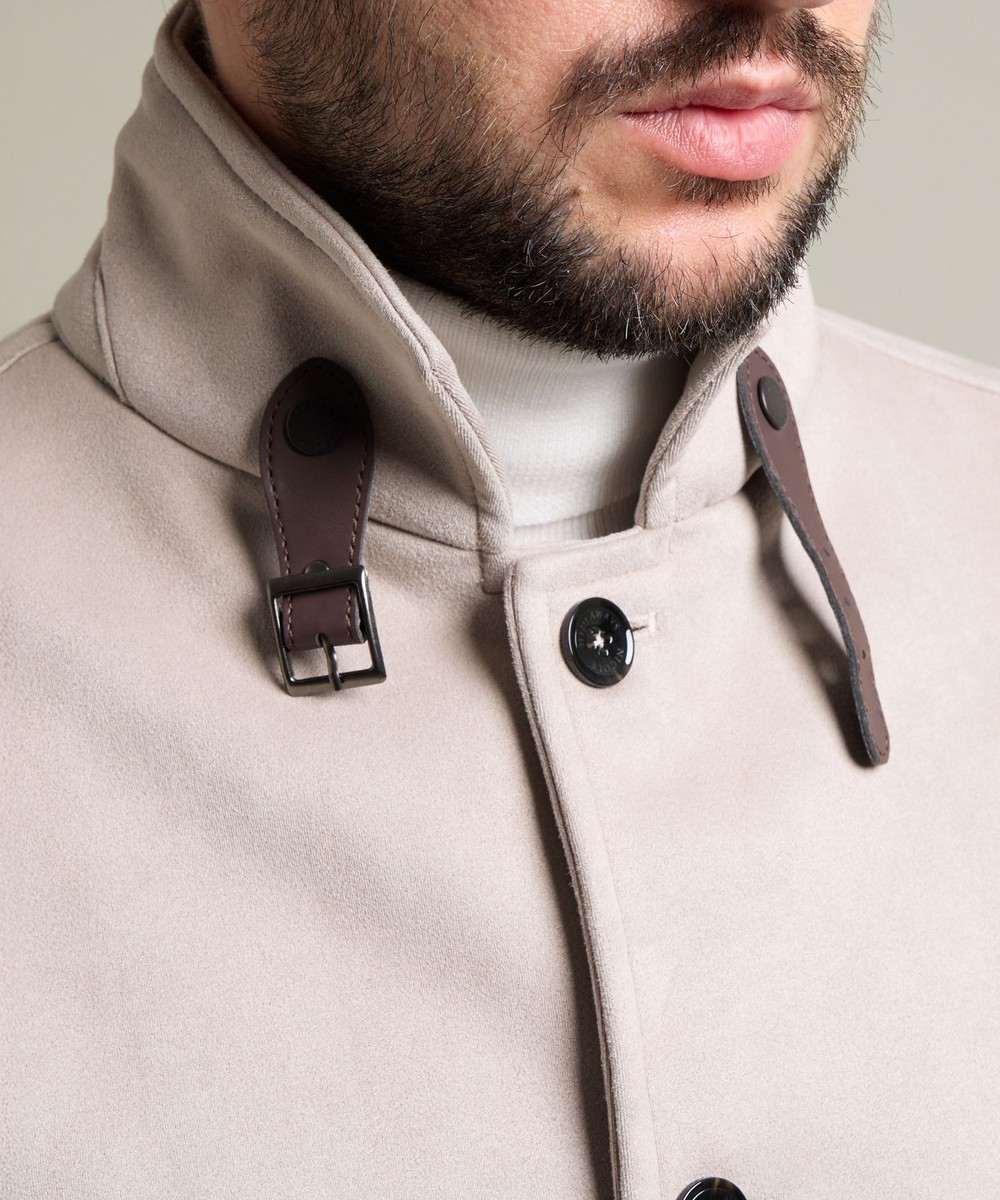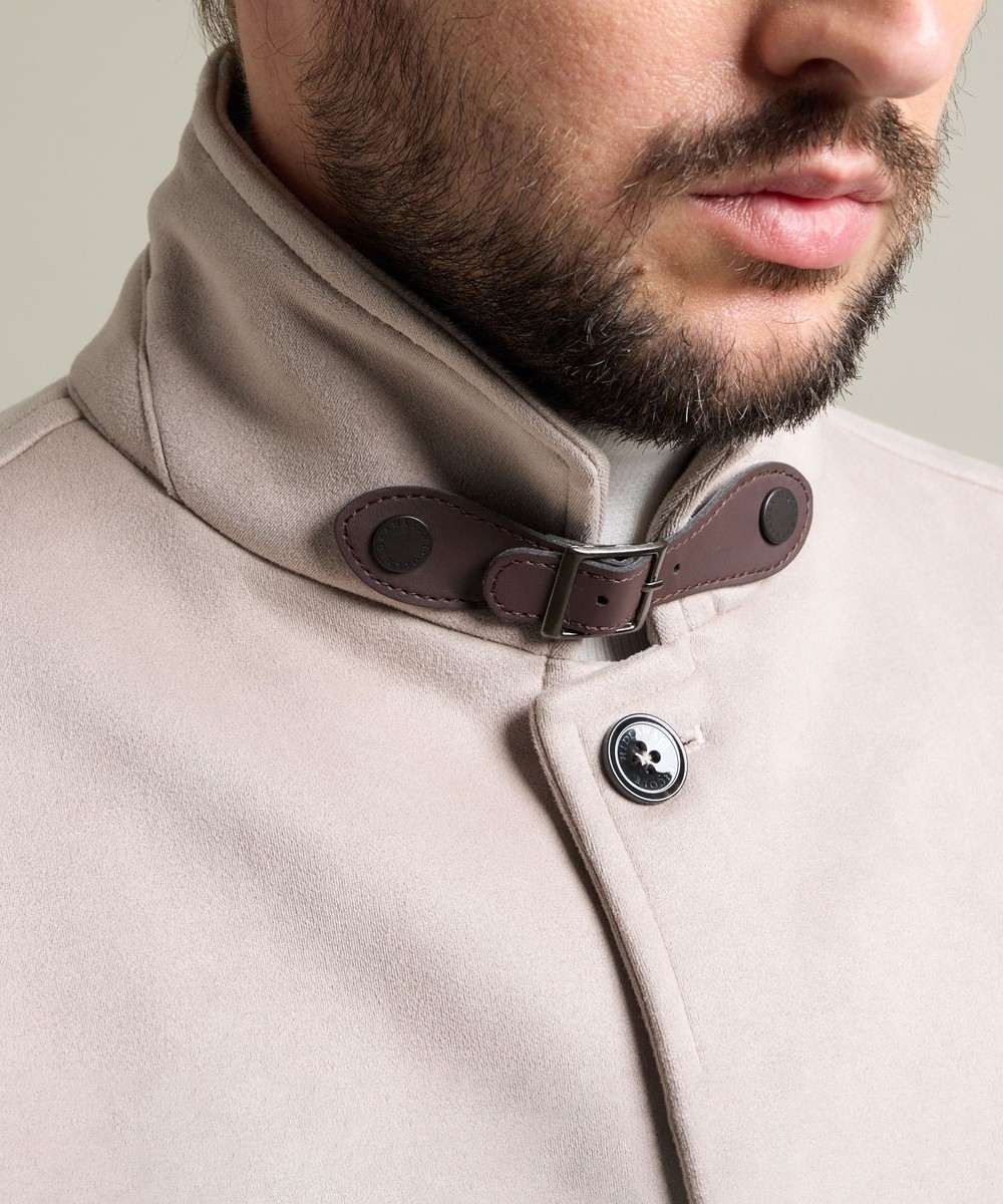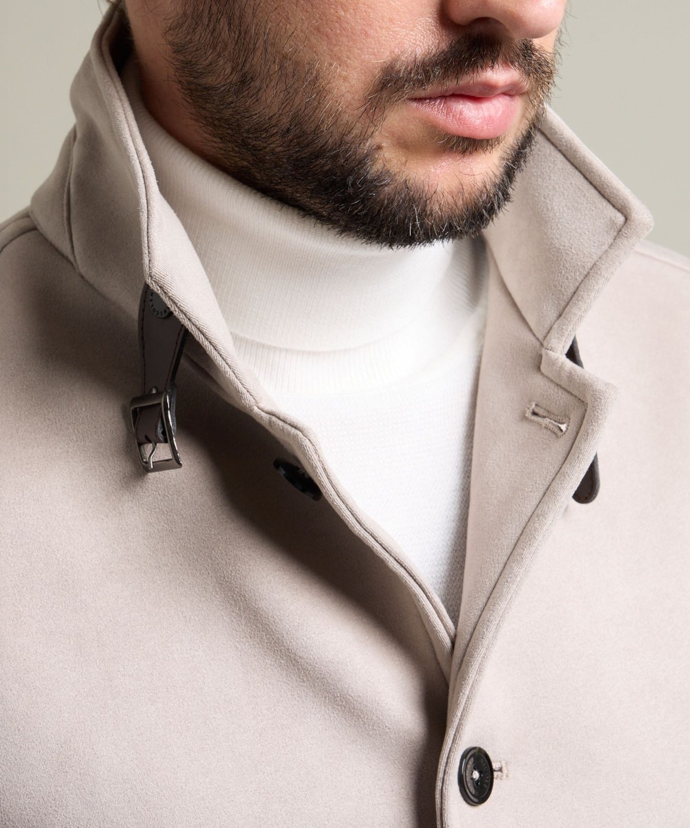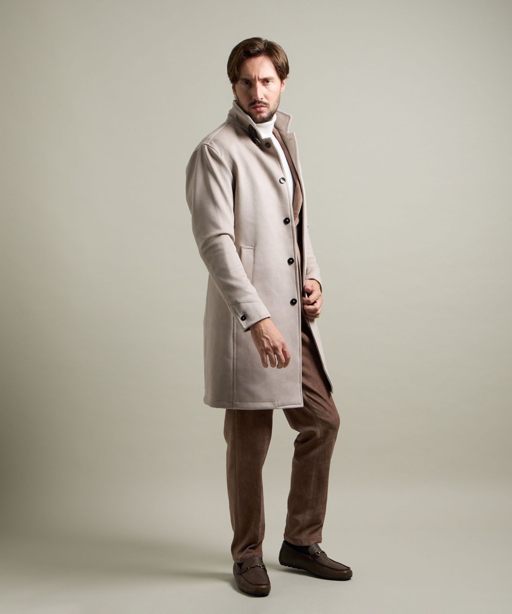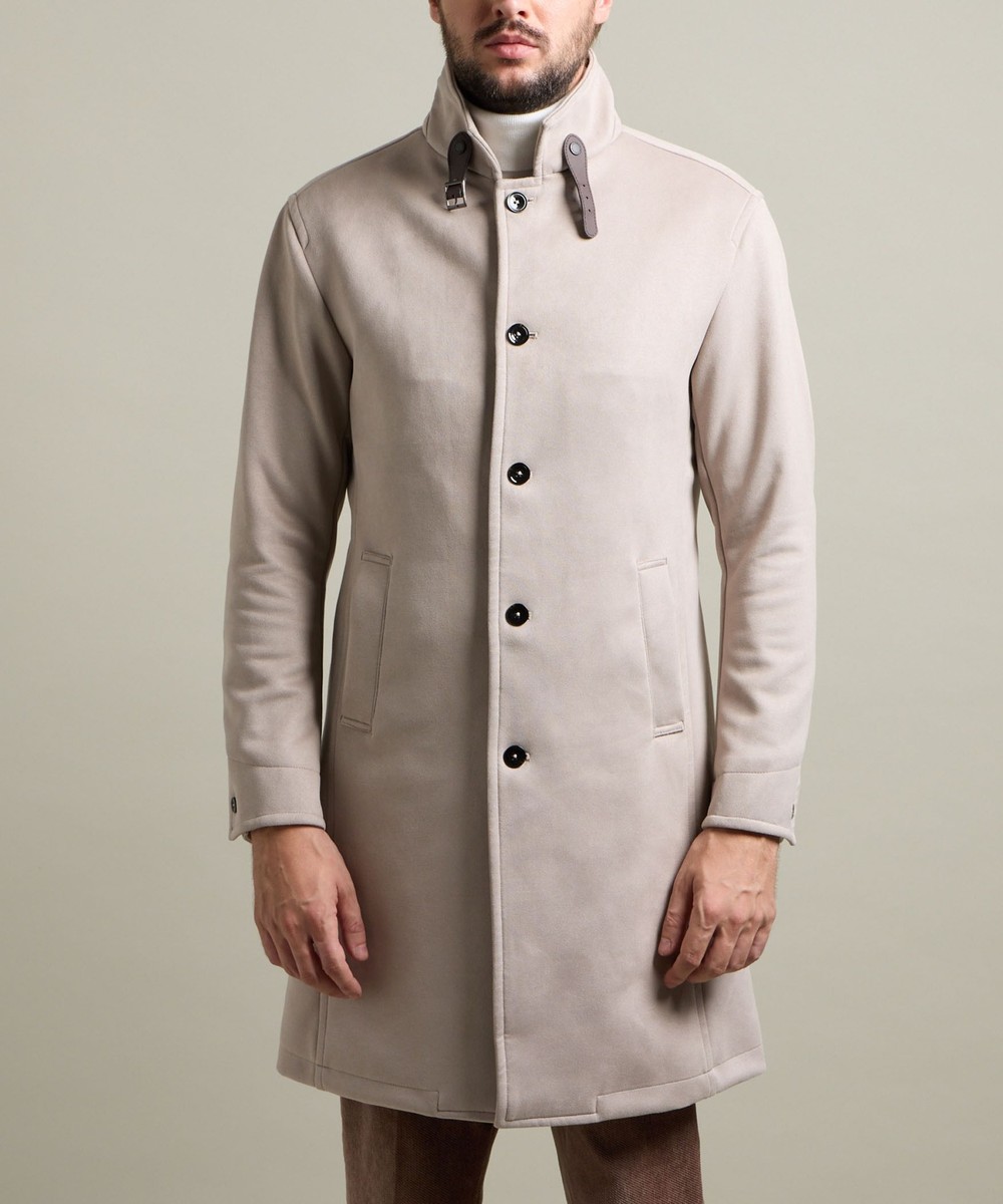 ドット釦で脱着可能な衿ベルト付きのスタンドコート。