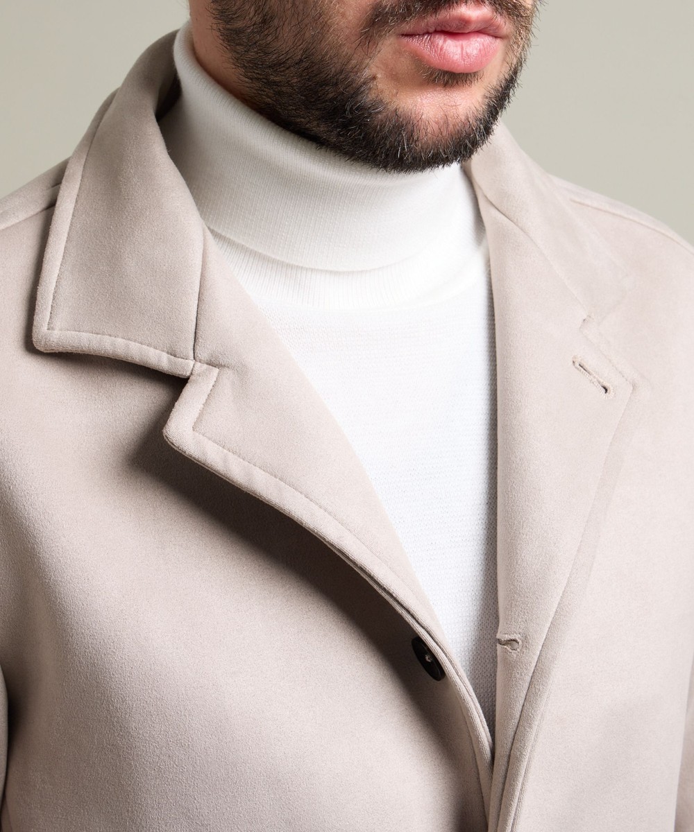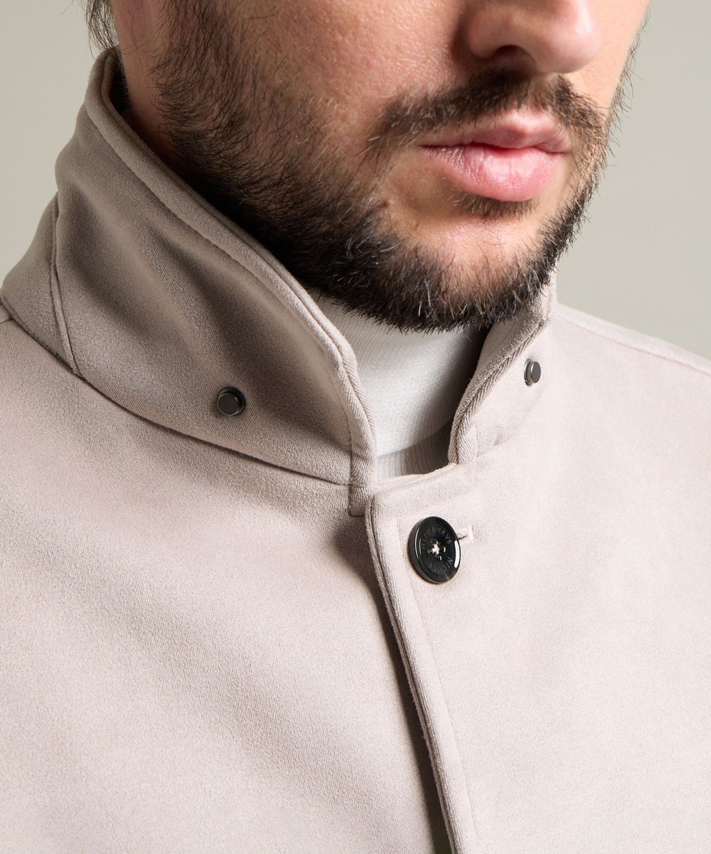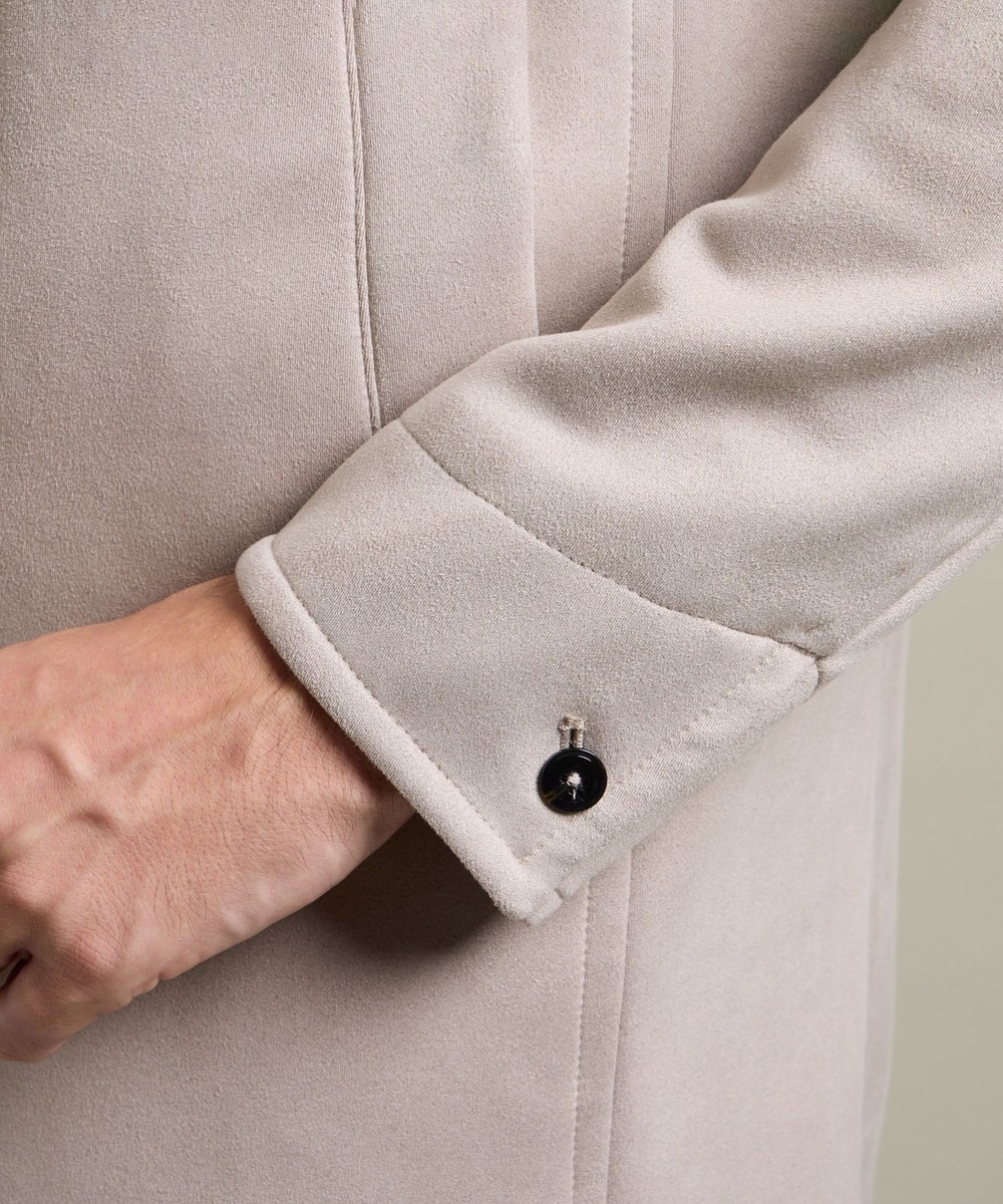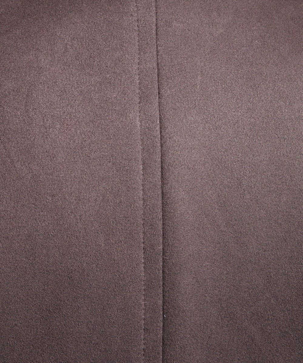 マイクロファイバ-を起毛したスウェ-ド調ならではの滑らかなタッチと上品な光沢、更にジャ-ジ素材なのでヨコ張り感もあり、シルエットを綺麗に作ります。