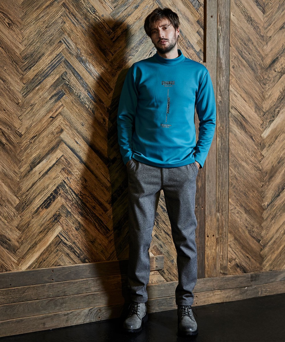 ポリエステル糸を使用したダブルフェイスのジャガードカットソー素材に起毛をかけたウールライクなハイブリット素材。