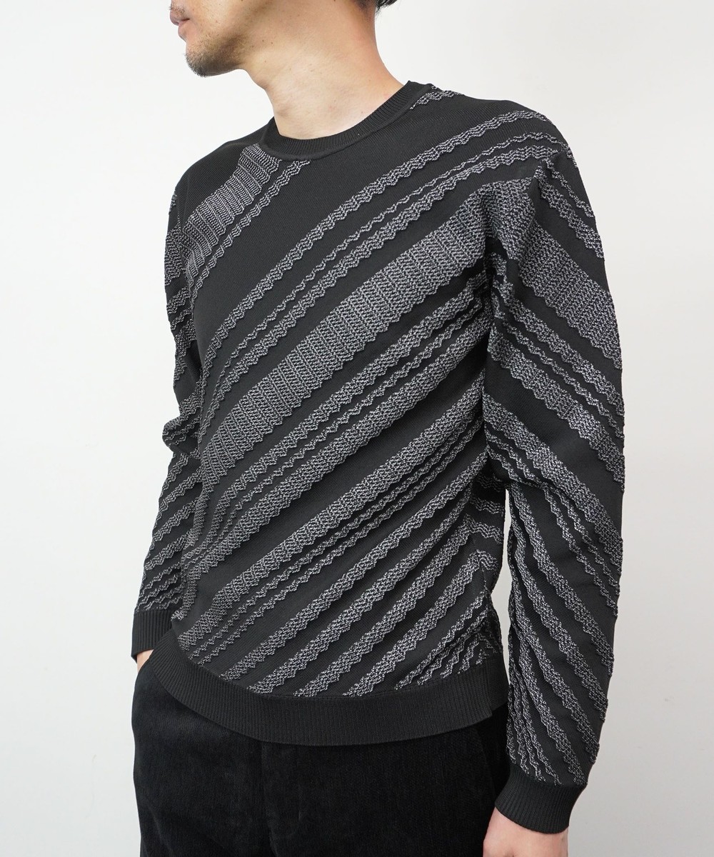 インパクトのあるバイヤス柄が目を惹く、リンクスジャカードクルーネックニットになります。