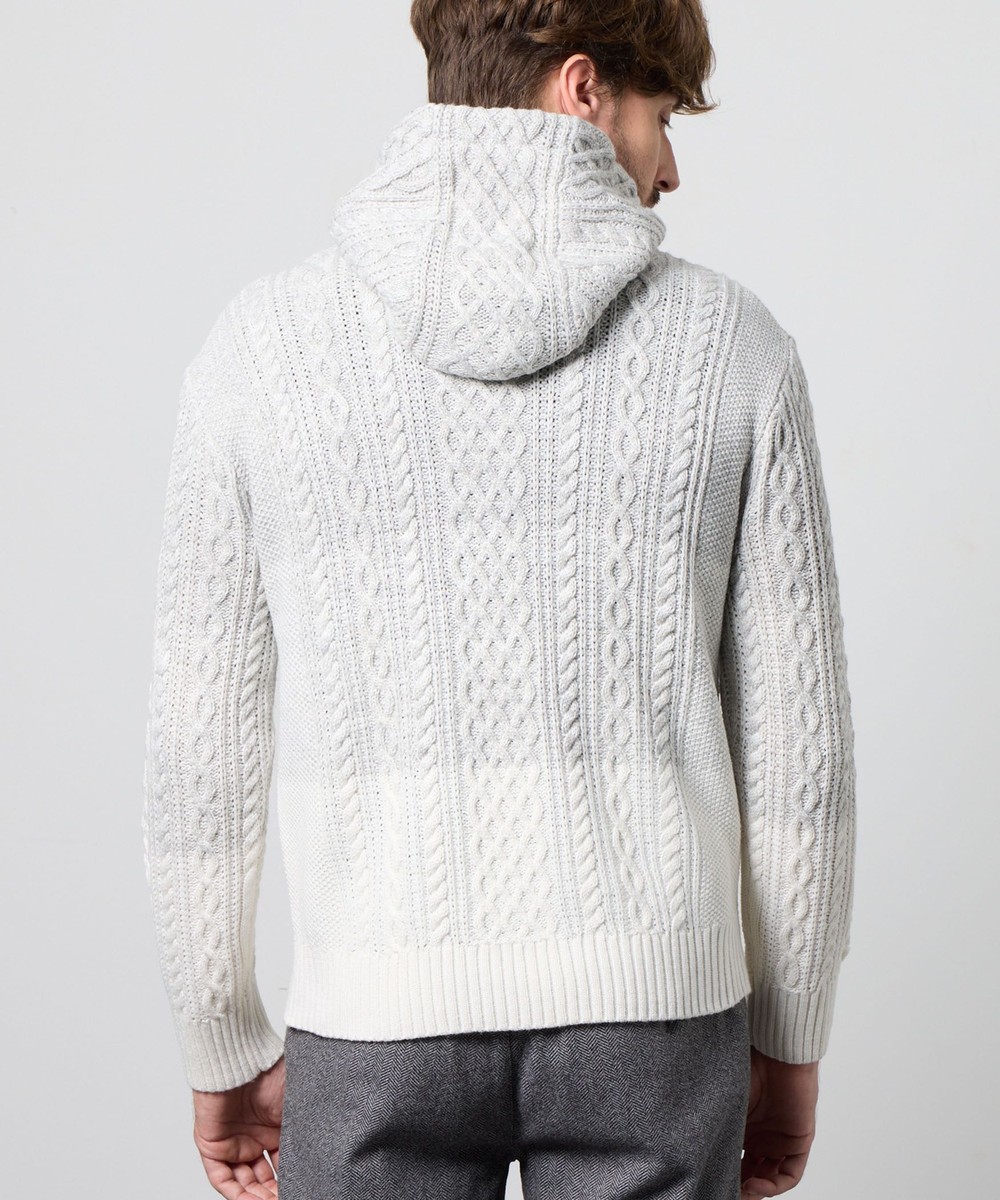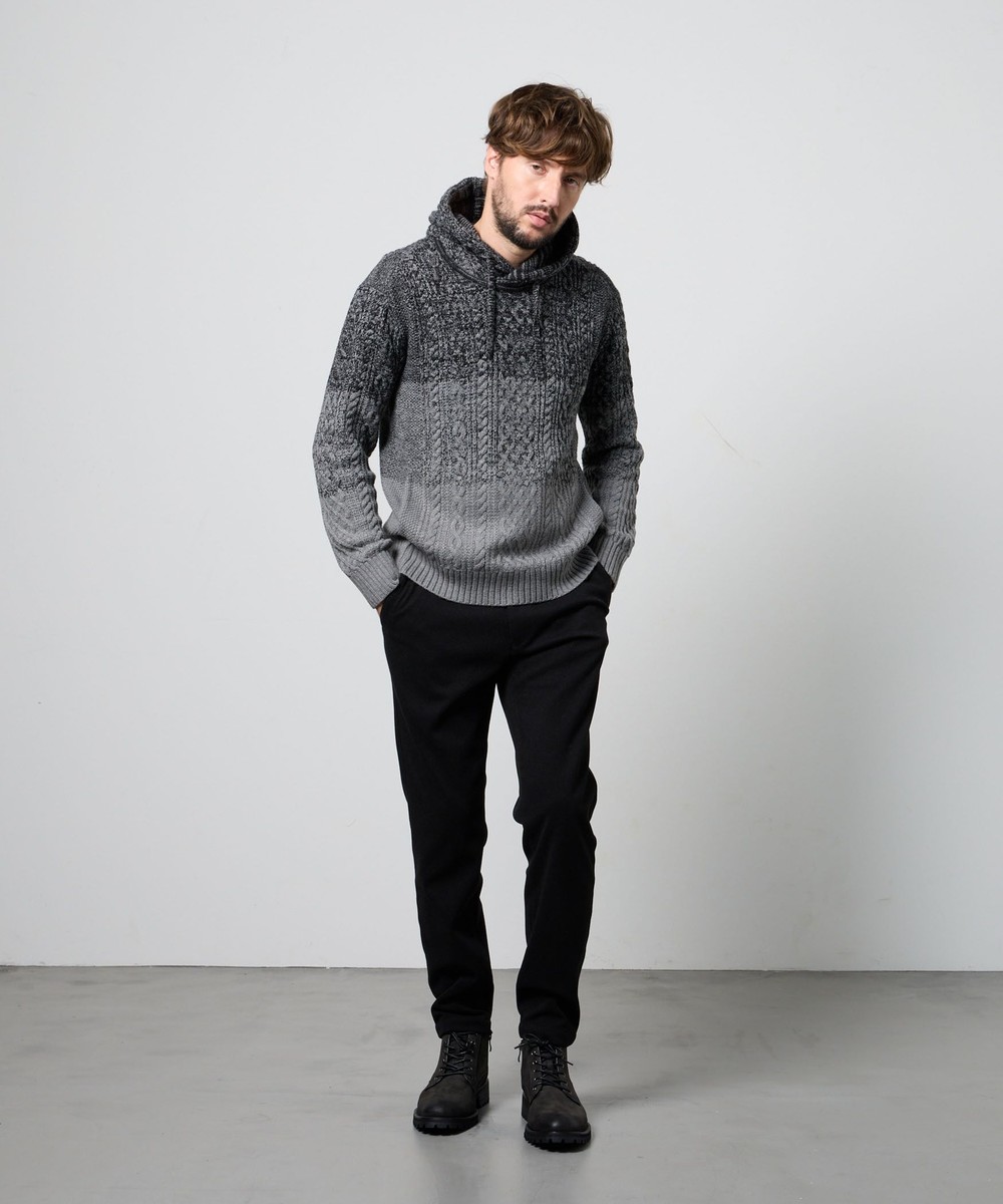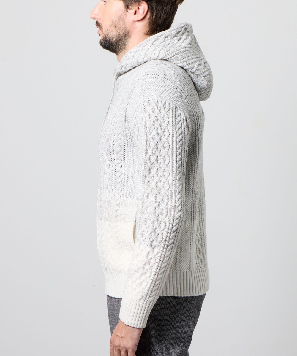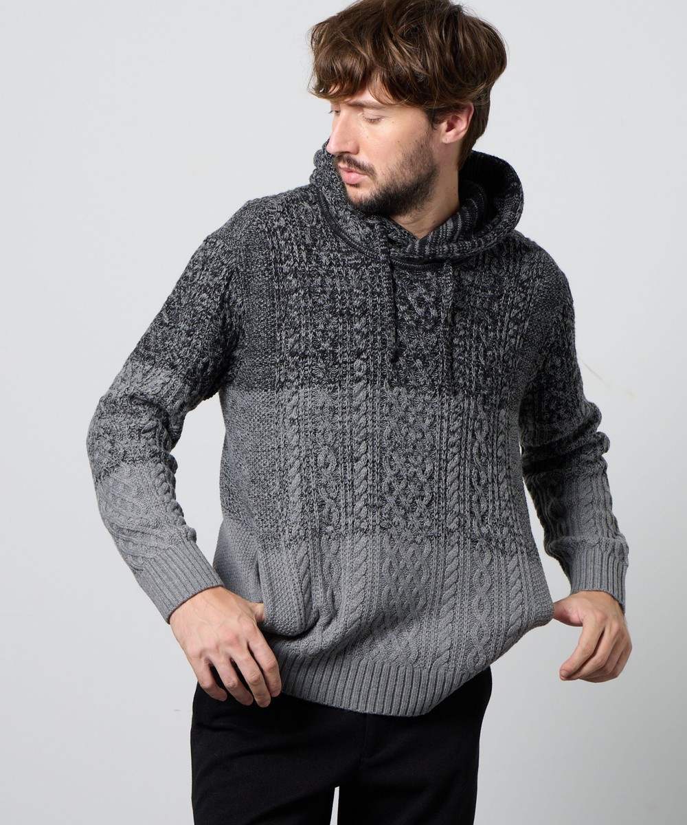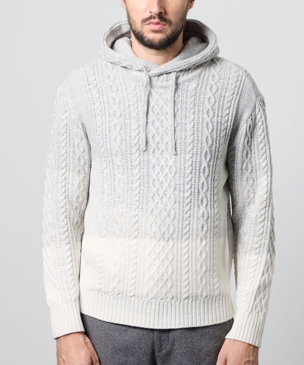 2色の糸を引き揃えてグラデーションになるよう編みたてたケーブルフーテッドプルオーバーニットになります。