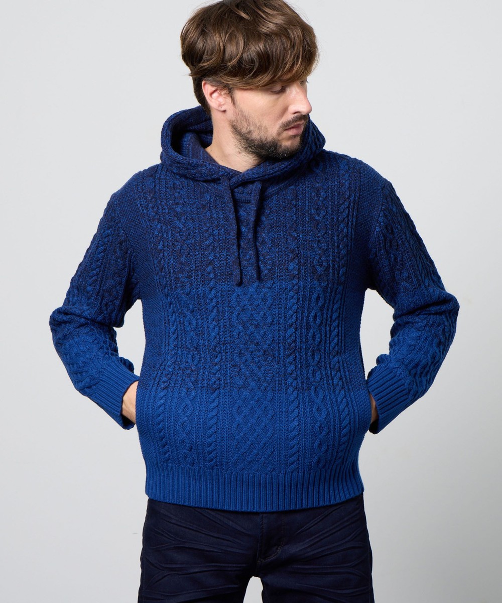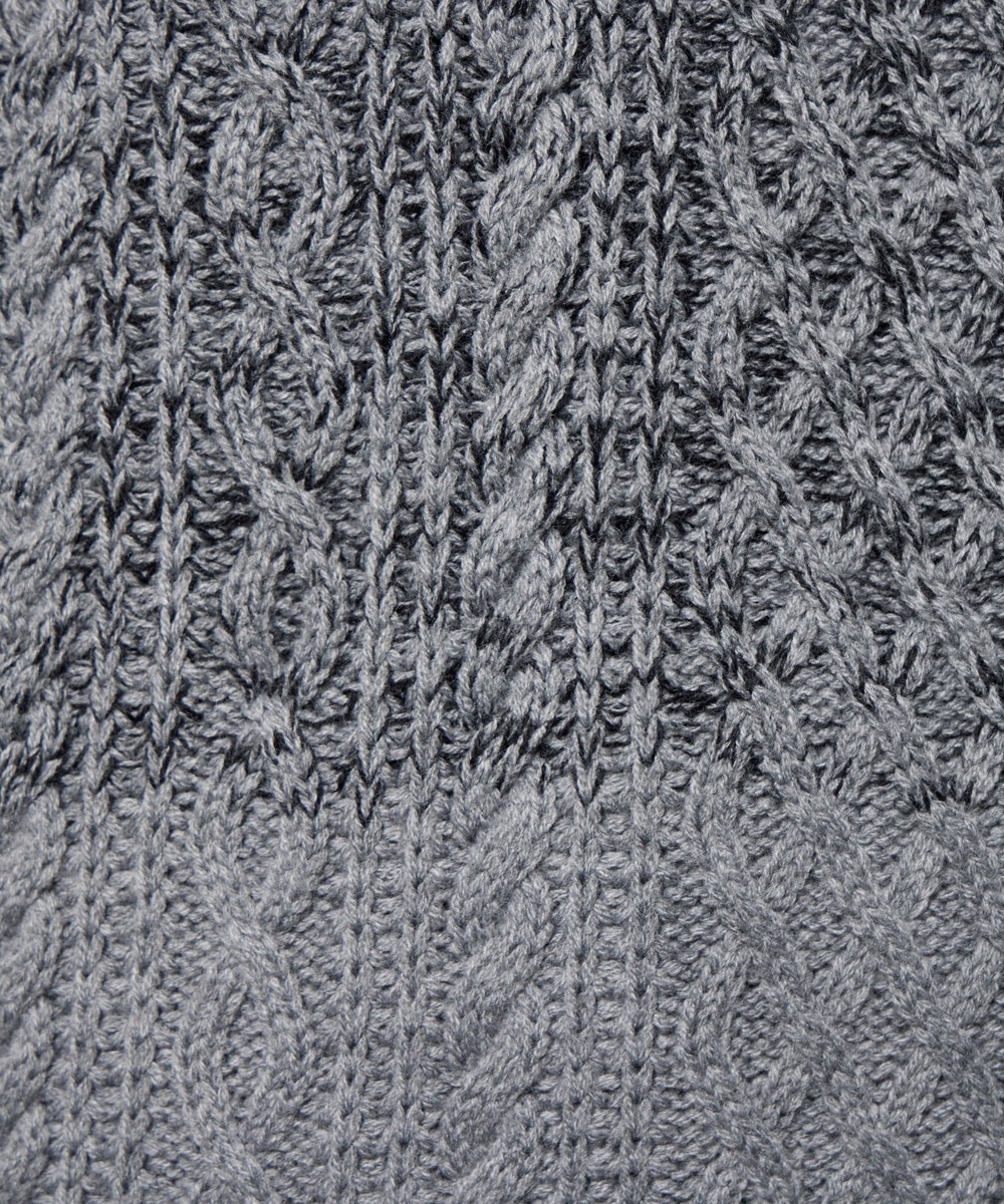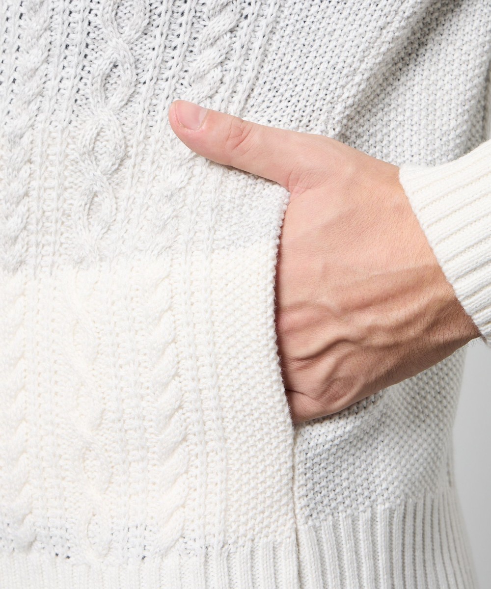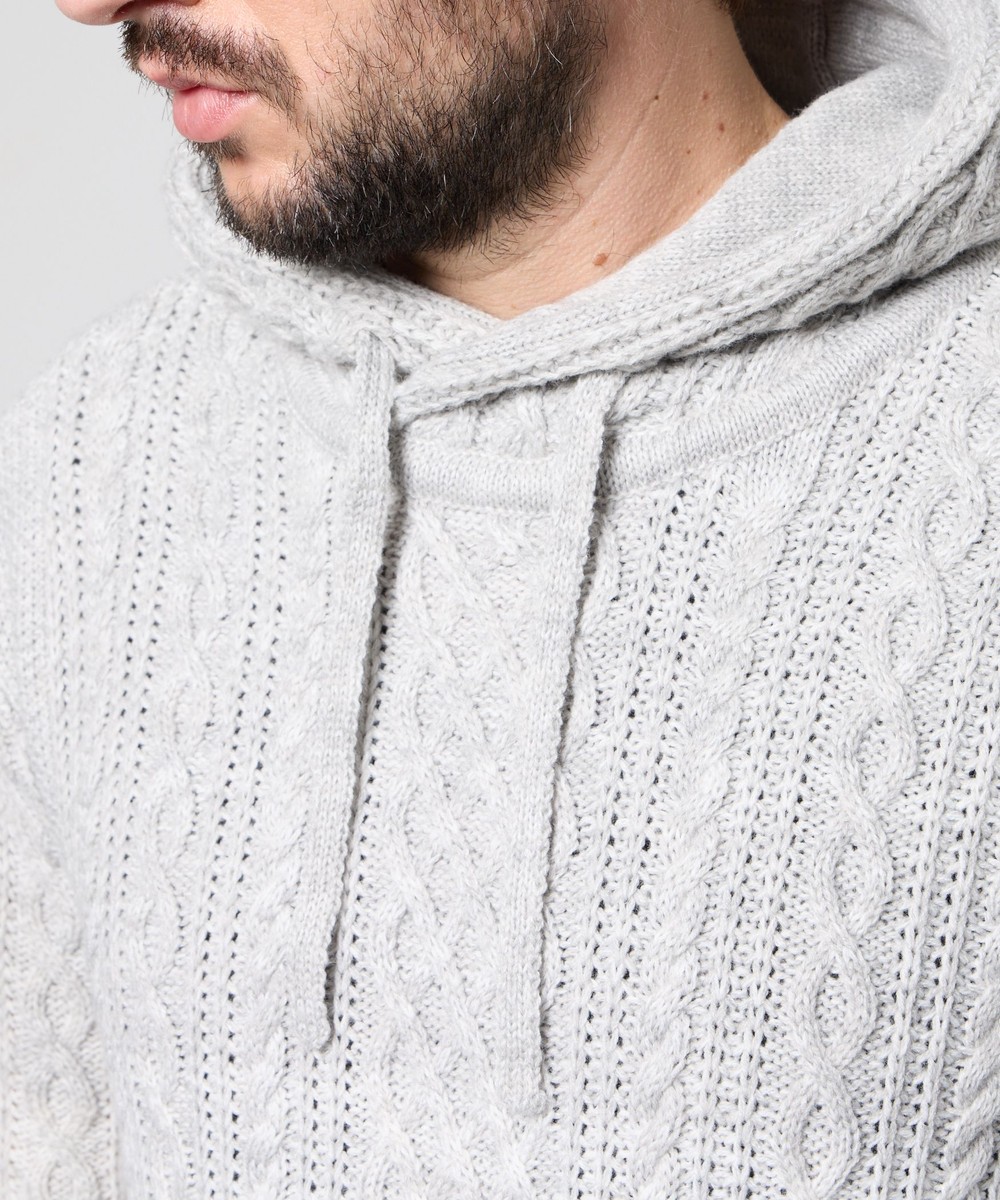 2色の糸を引き揃えてグラデーションになるよう編みたてたケーブルフーテッドプルオーバーニットになります。