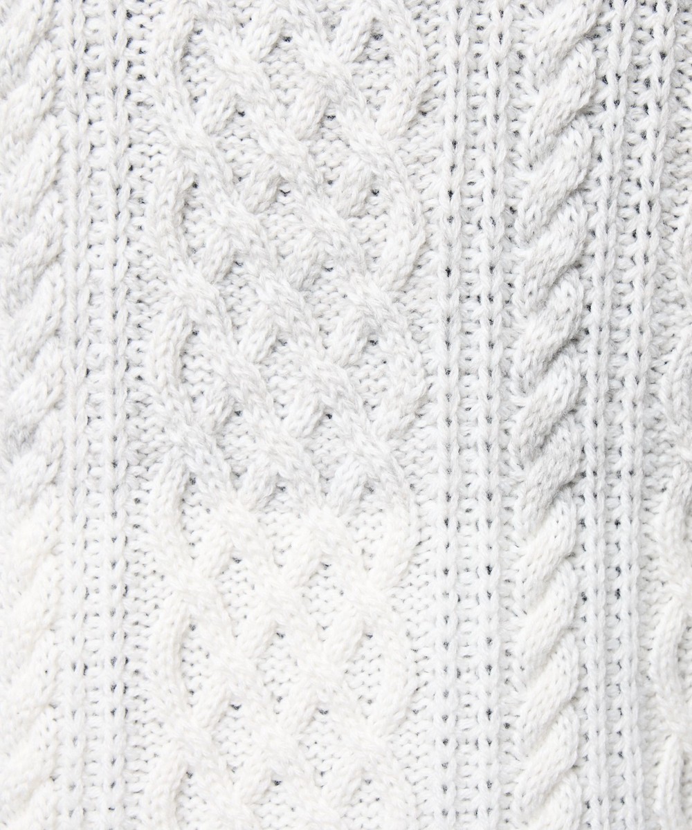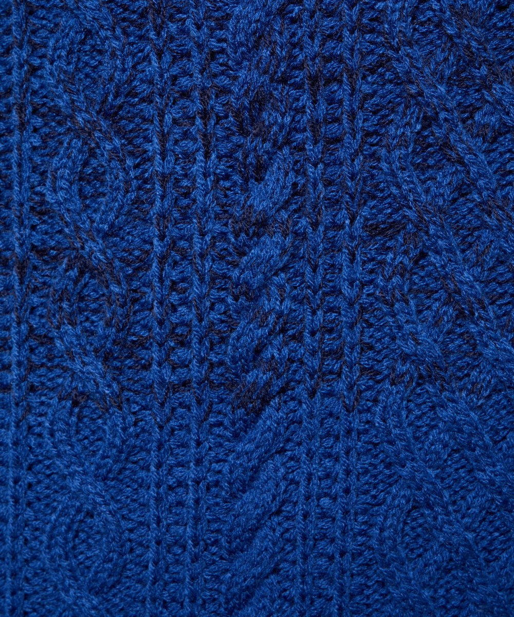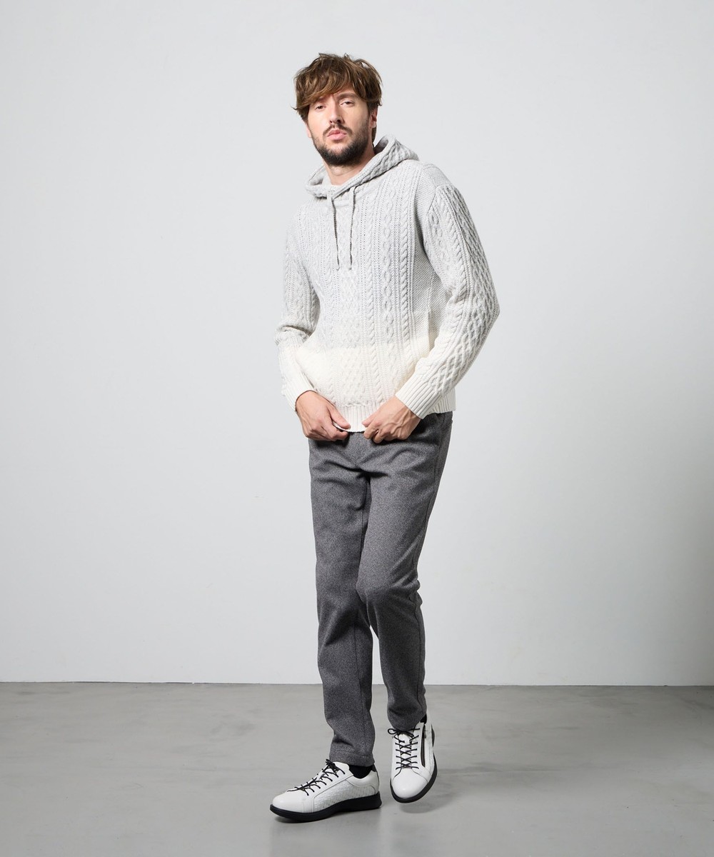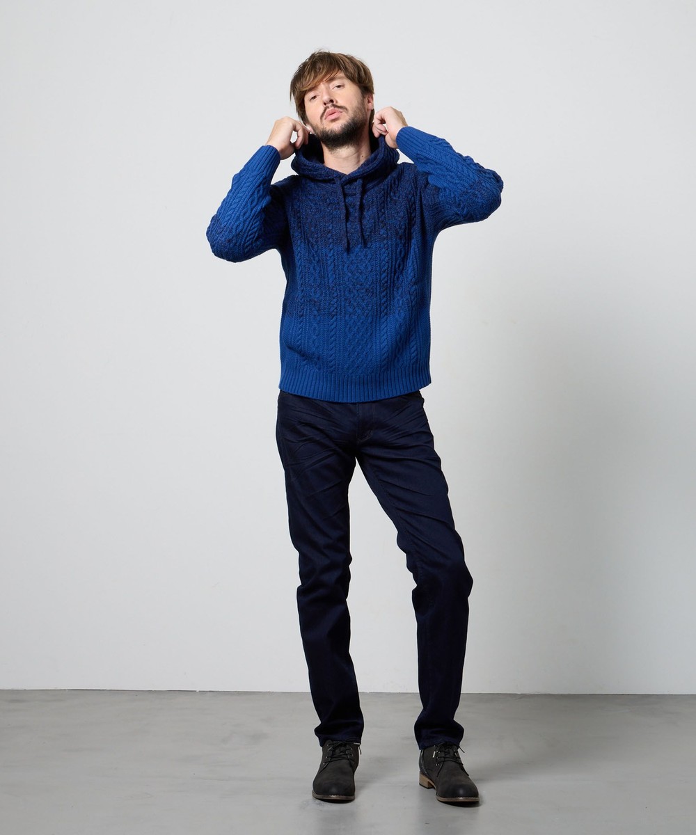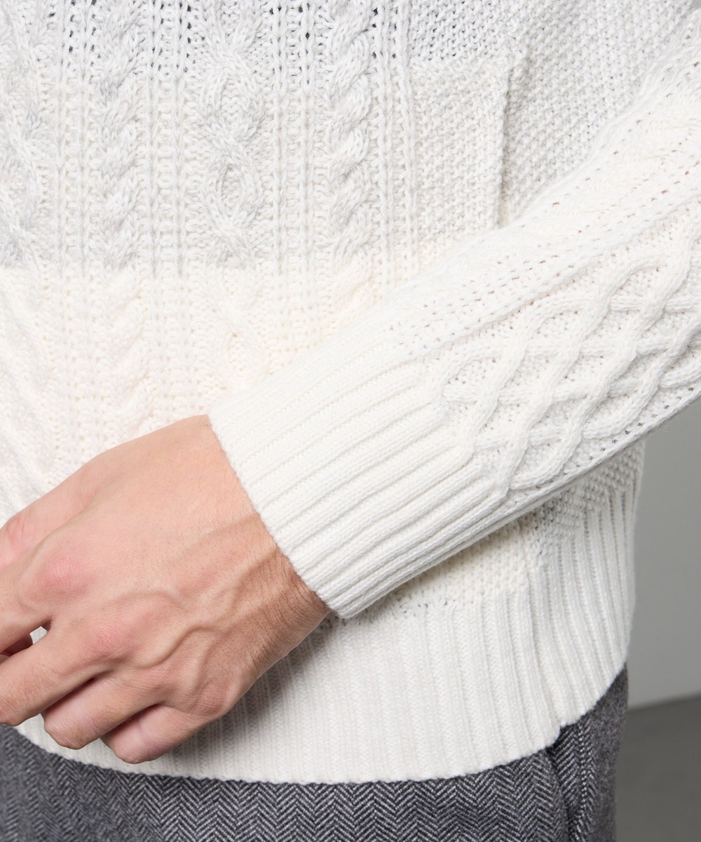 2色の糸を引き揃えてグラデーションになるよう編みたてたケーブルフーテッドプルオーバーニットになります。