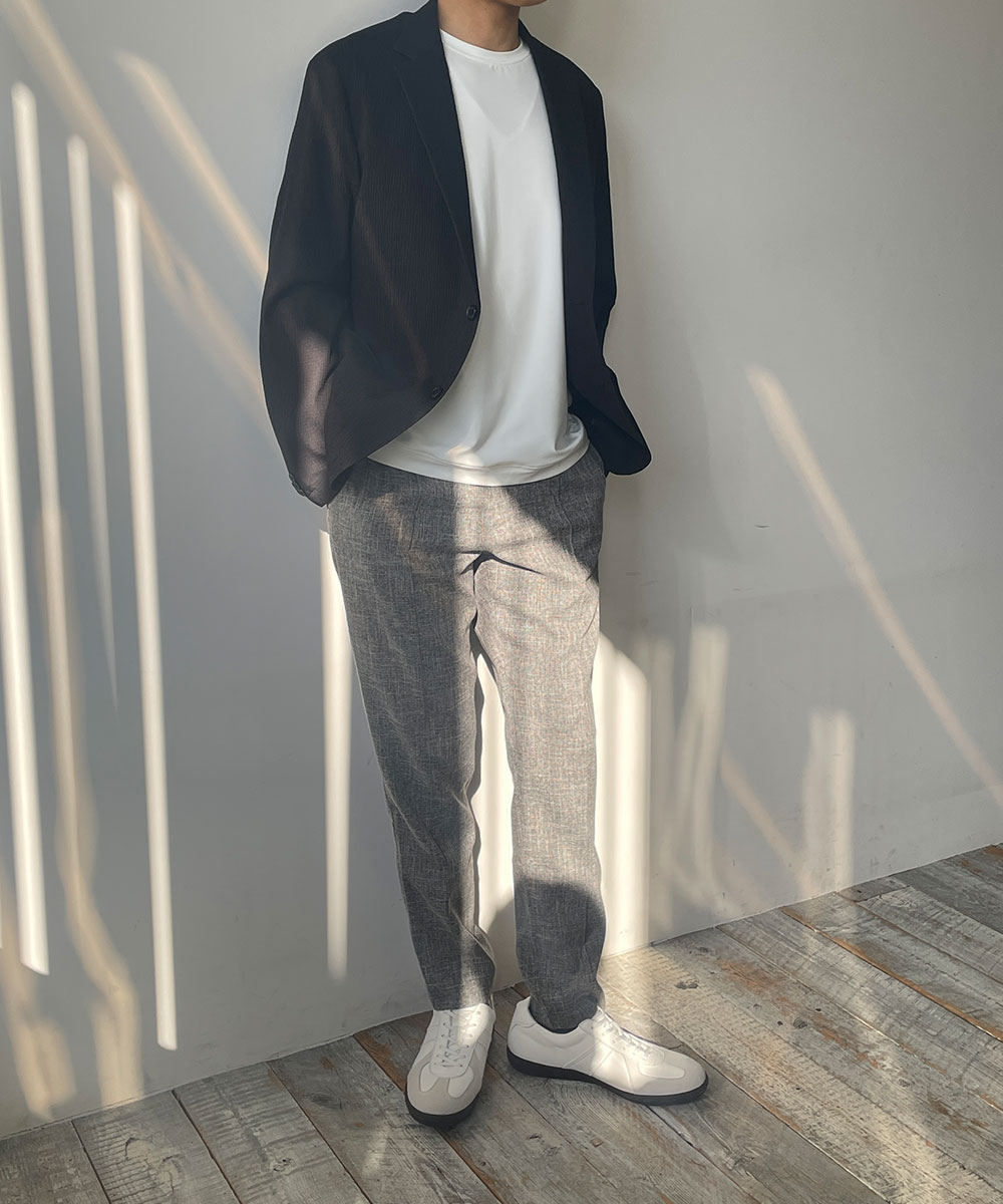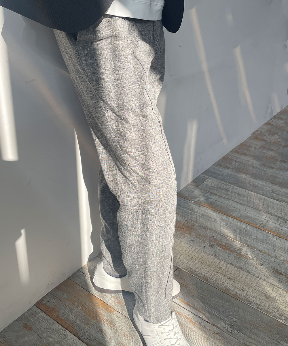 程よくゆとりを持たせたウエスト回りから、裾にかけてテーパード。センタープリーツを配置しオフィスカジュアルにも対応。