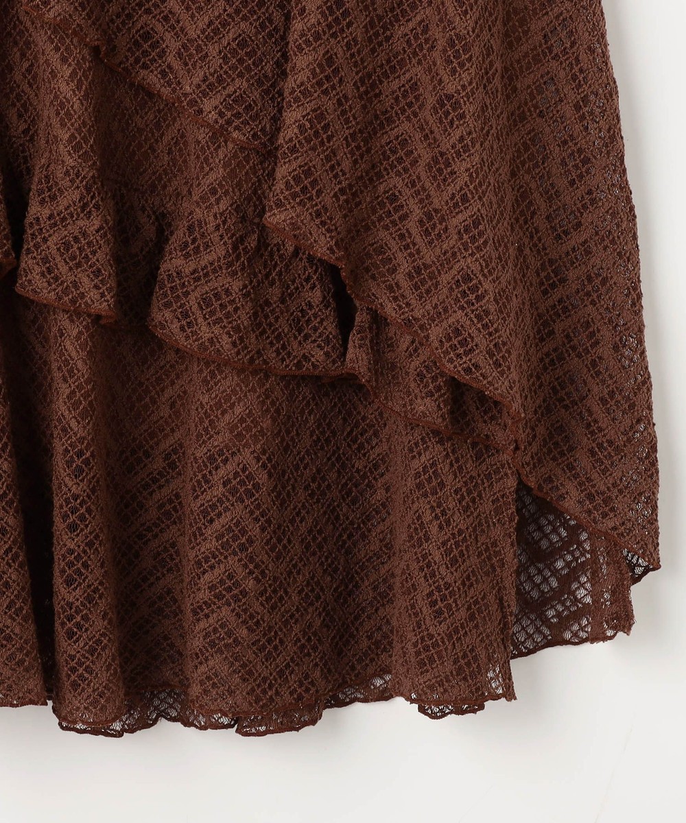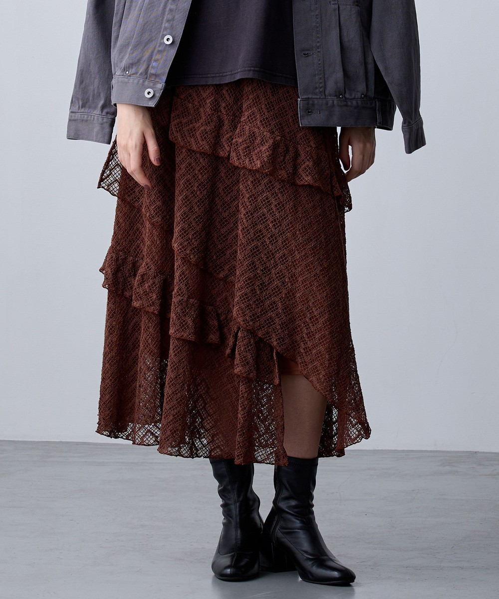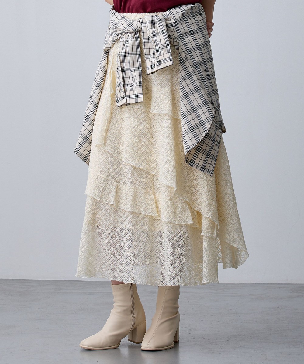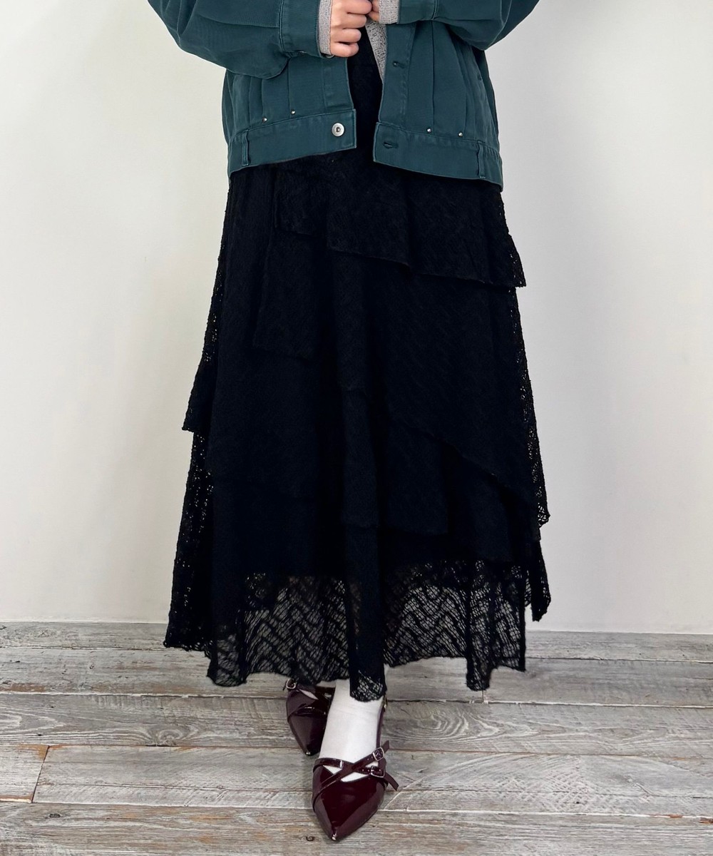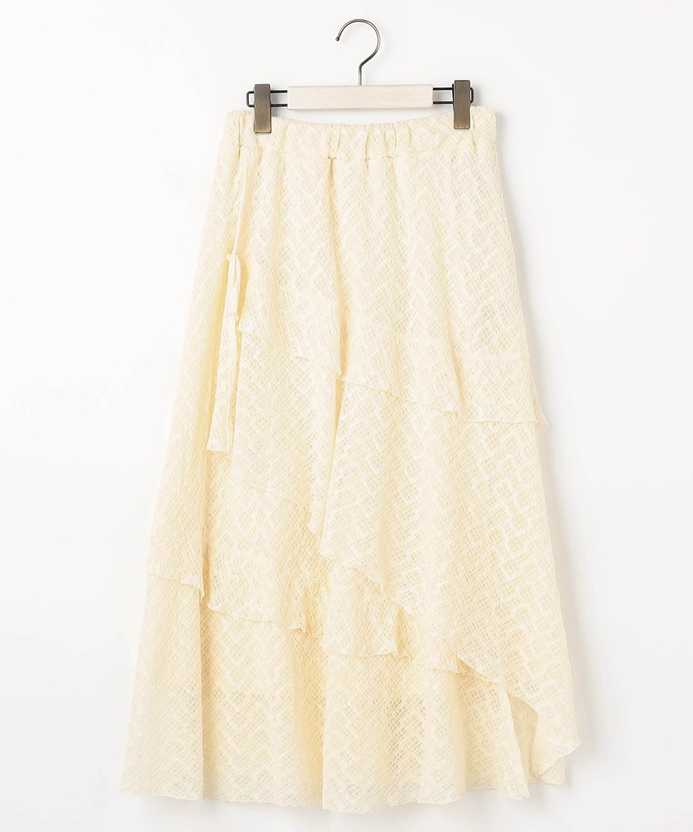 アシンメトリーなヘムデザインがレースの重なりを際立たせ、立体感のあるスカート。