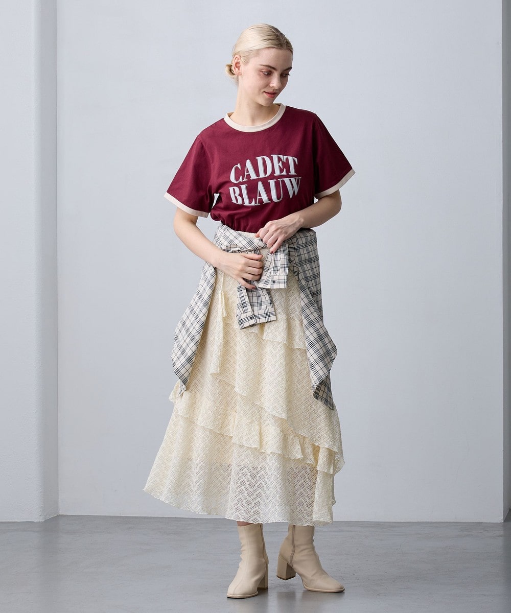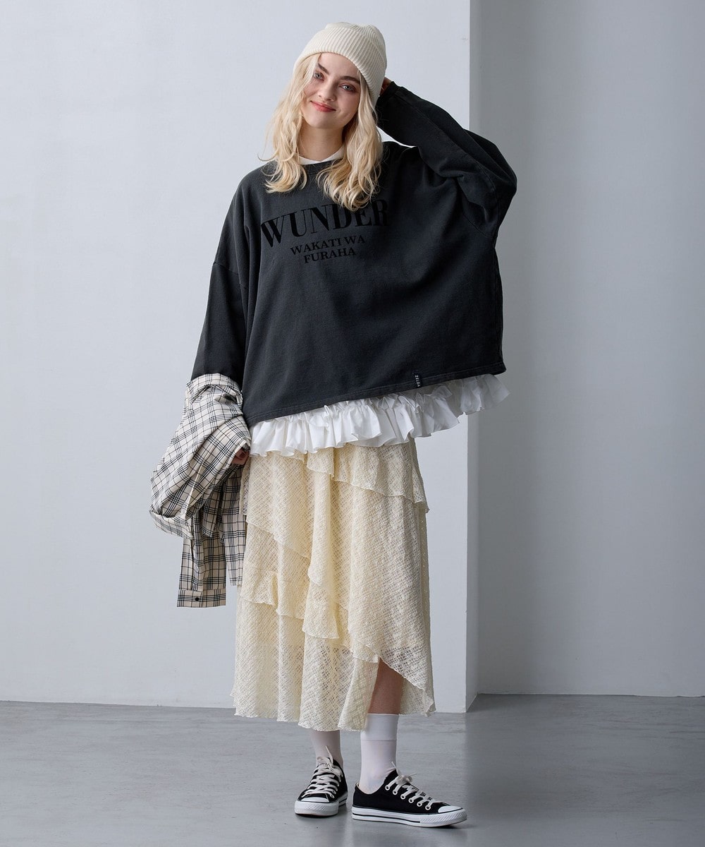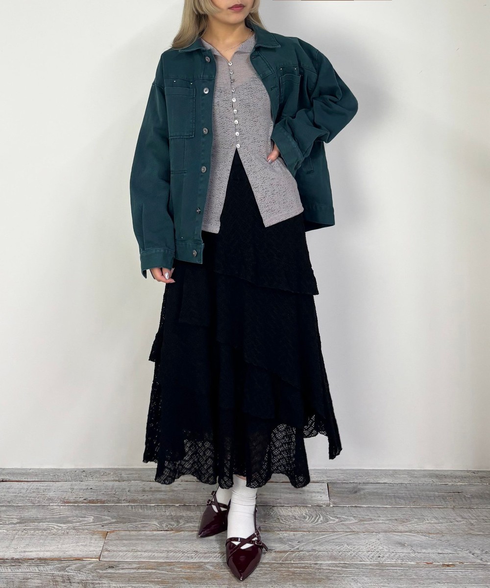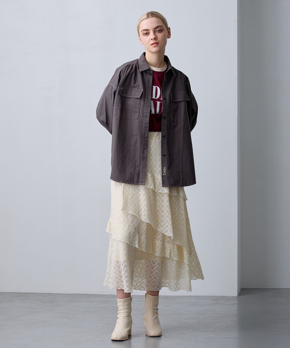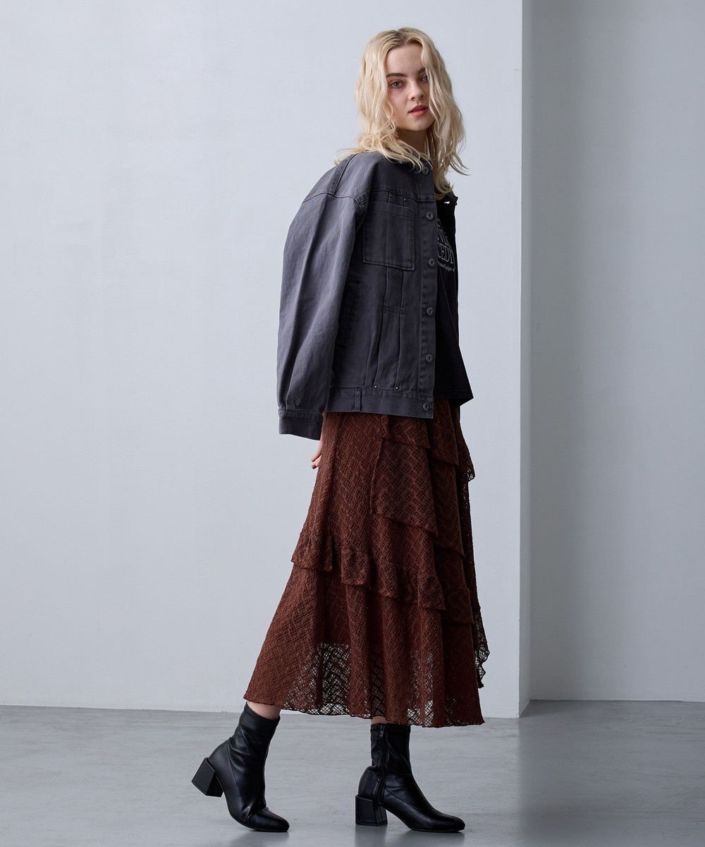 アシンメトリーなヘムデザインがレースの重なりを際立たせ、立体感のあるスカート。
