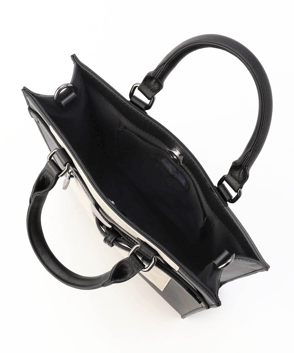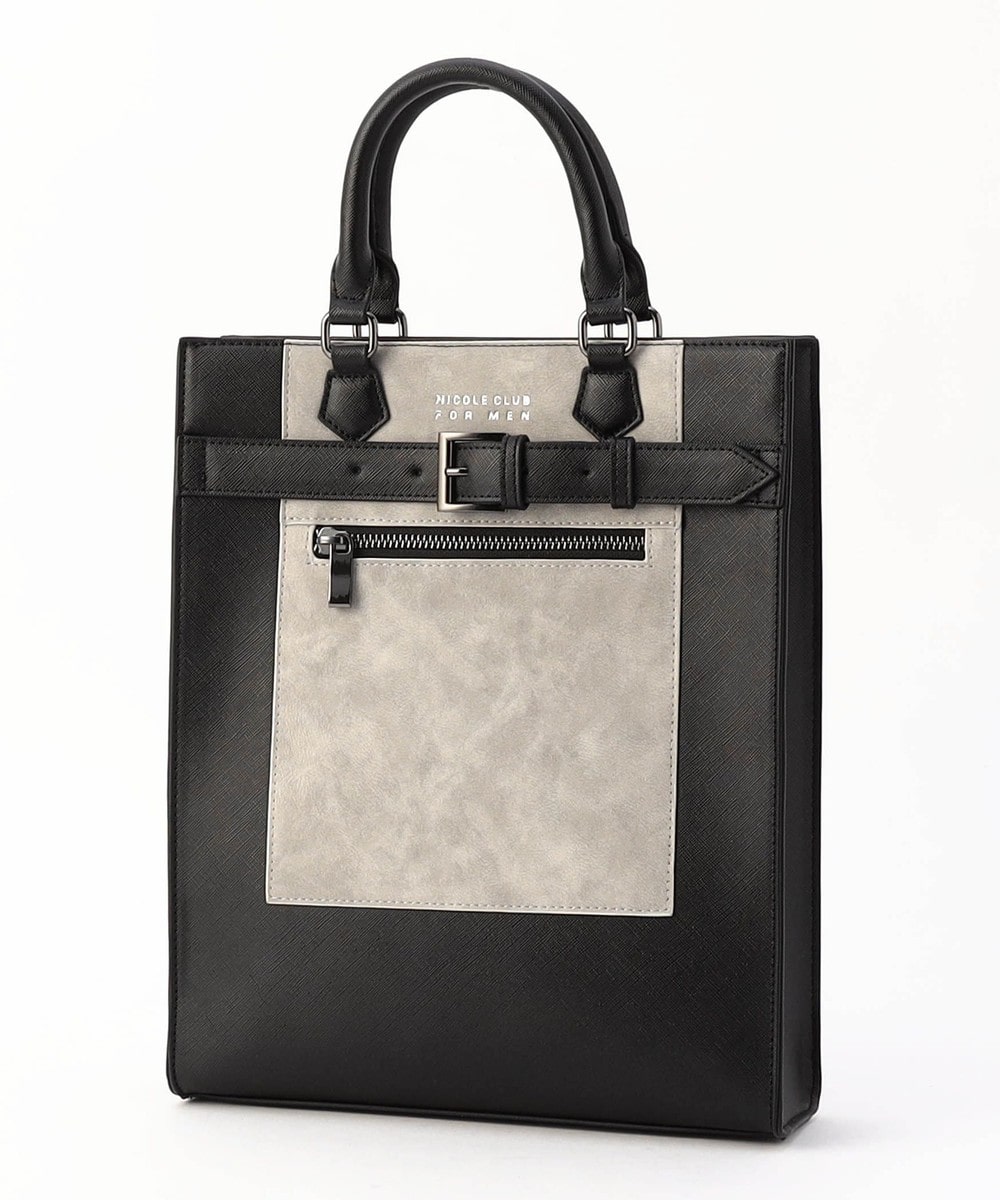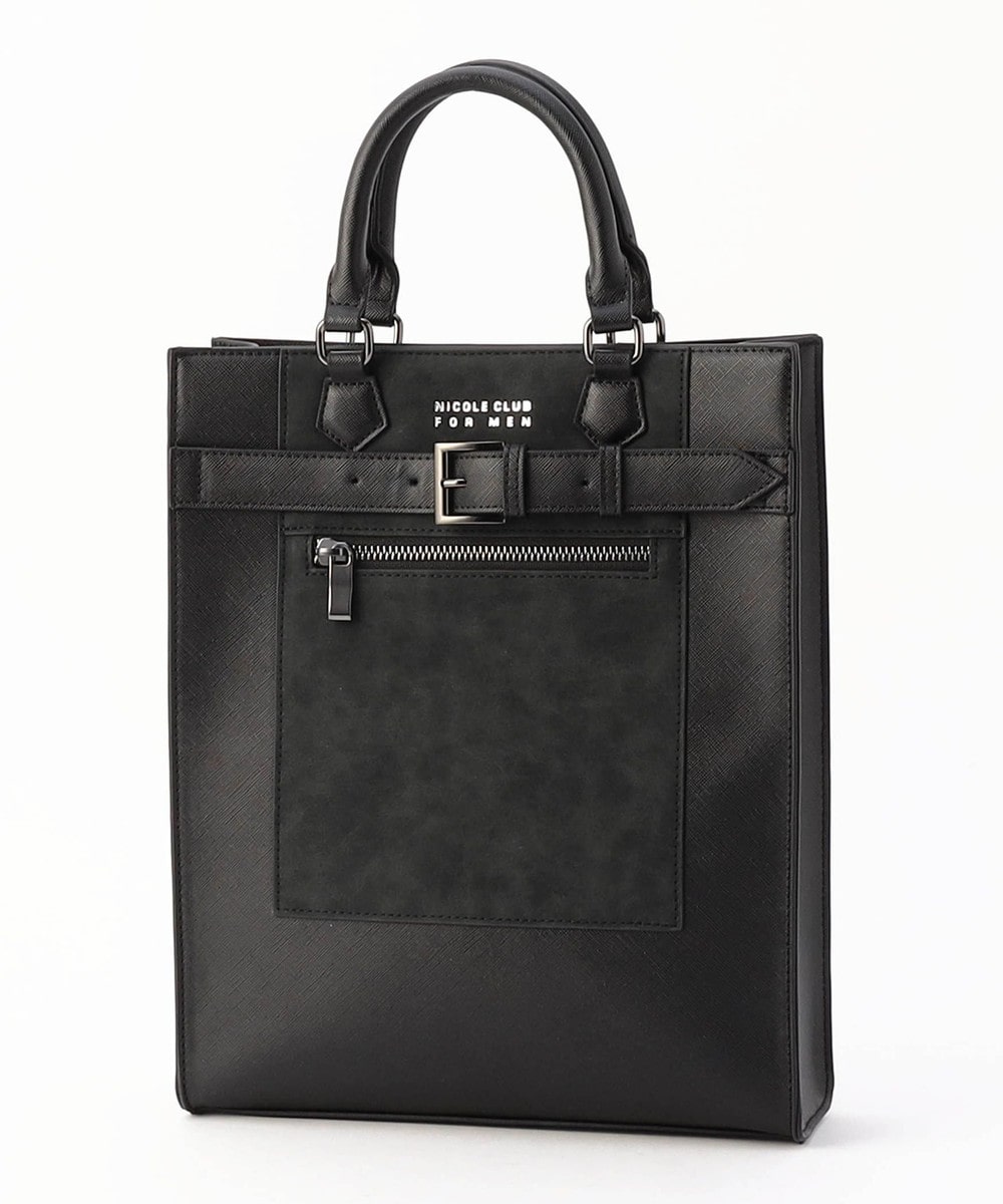 ソリッドな素材感が特徴のスクエア型ショルダーバッグ。手持ち用のハンドルと脱着式のショルダーベルトが付属した2WAY仕様です。フロントのファスナーポケットと異素材合皮切り替えに加え、今季はメタルバックルを使用したベルトデザインをあしらい一層洗練された印象に。内装にはパッチポケットを設けて荷物の仕分けも容易です。モードスタイリングにもピッタリなトレンド感満載のバッグです。