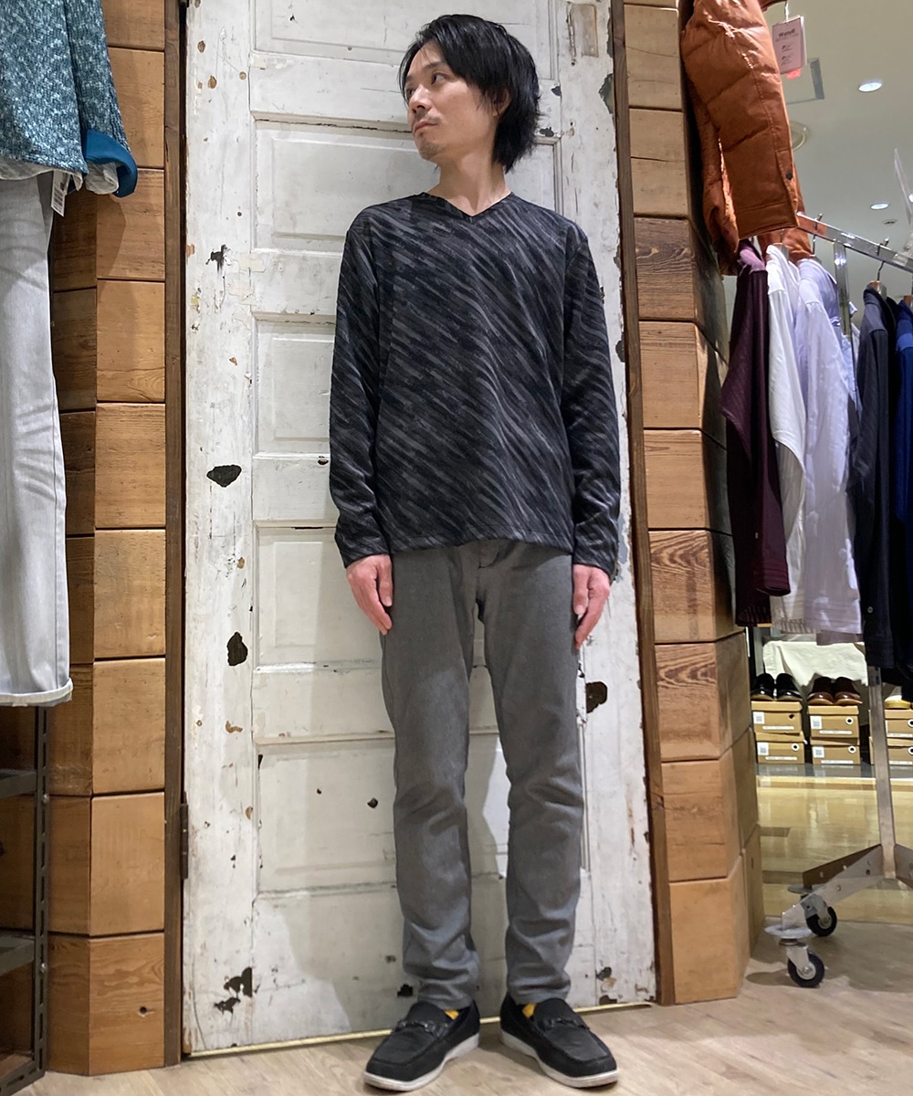 ゼブラ柄をスプレー風ボカシプリントで表現したクルーネックロンT。クラック系の接結ブリスタージャカードとマッチした艶感のある仕上がりです。
