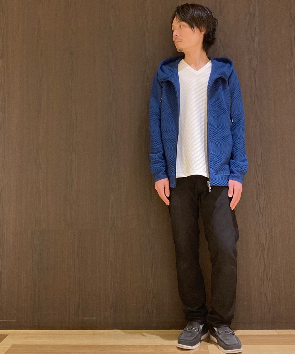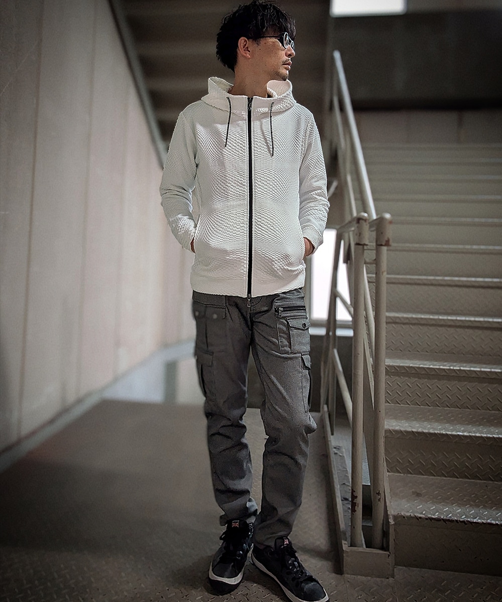 インパクトの強い幾何学柄を無地とモノト-ンで表現する事で大人綺麗目なモ-ドテイストに仕上げています。切替を生かしたシームポケット、ブランドロゴを繊細にプリントしたスピンドルがデザインポイントのフルZIPフーデッドパーカ。冬はコートの下に着用しても着ぶくれせず、春先にはTシャツの上に羽織るのに丁度よい肉厚感とサイズ感に仕上げました。