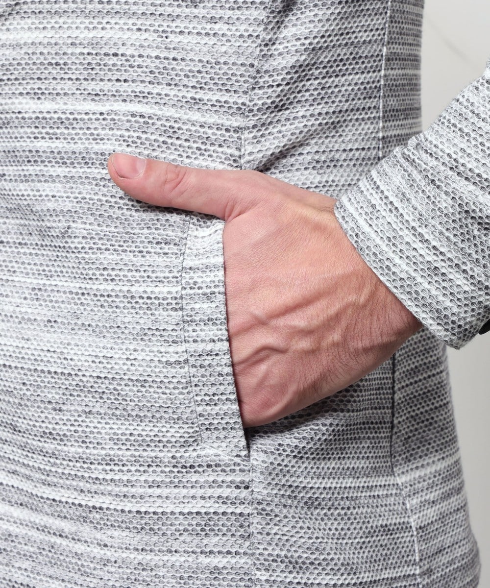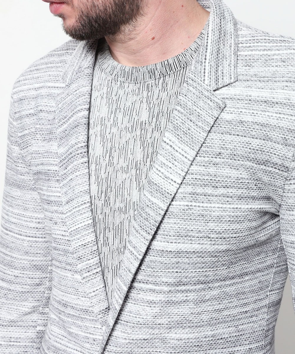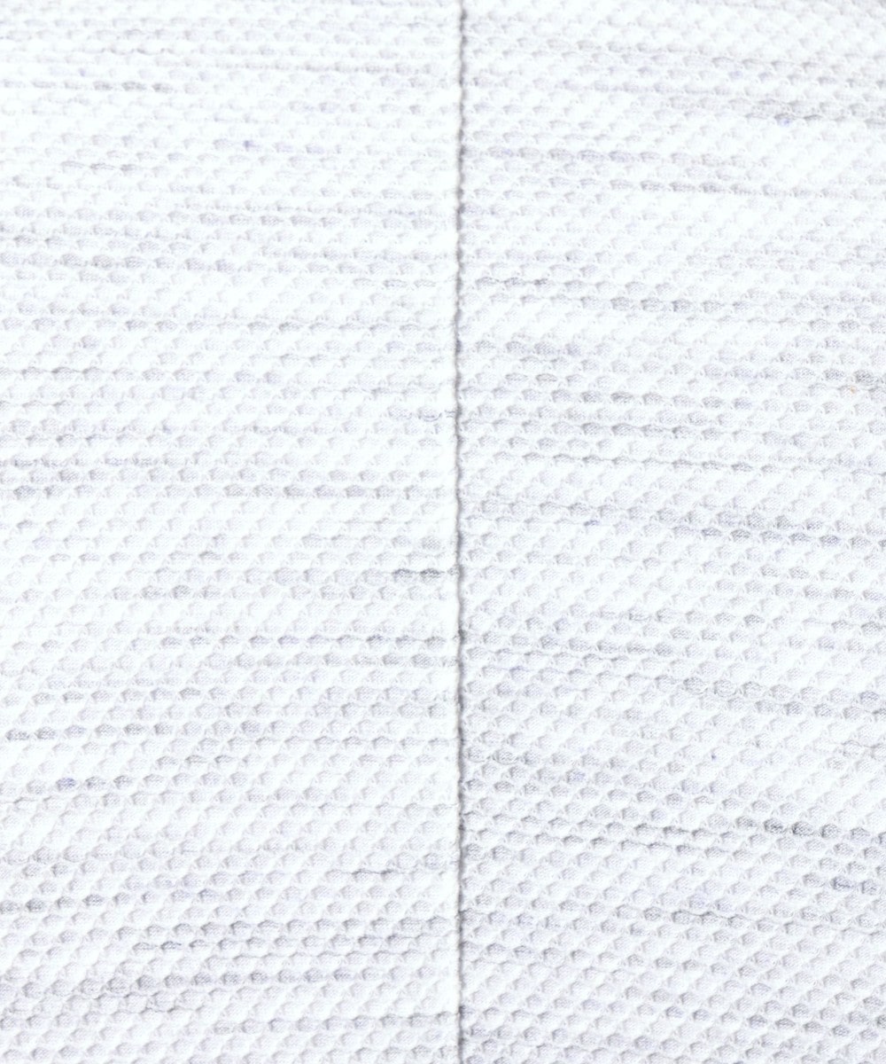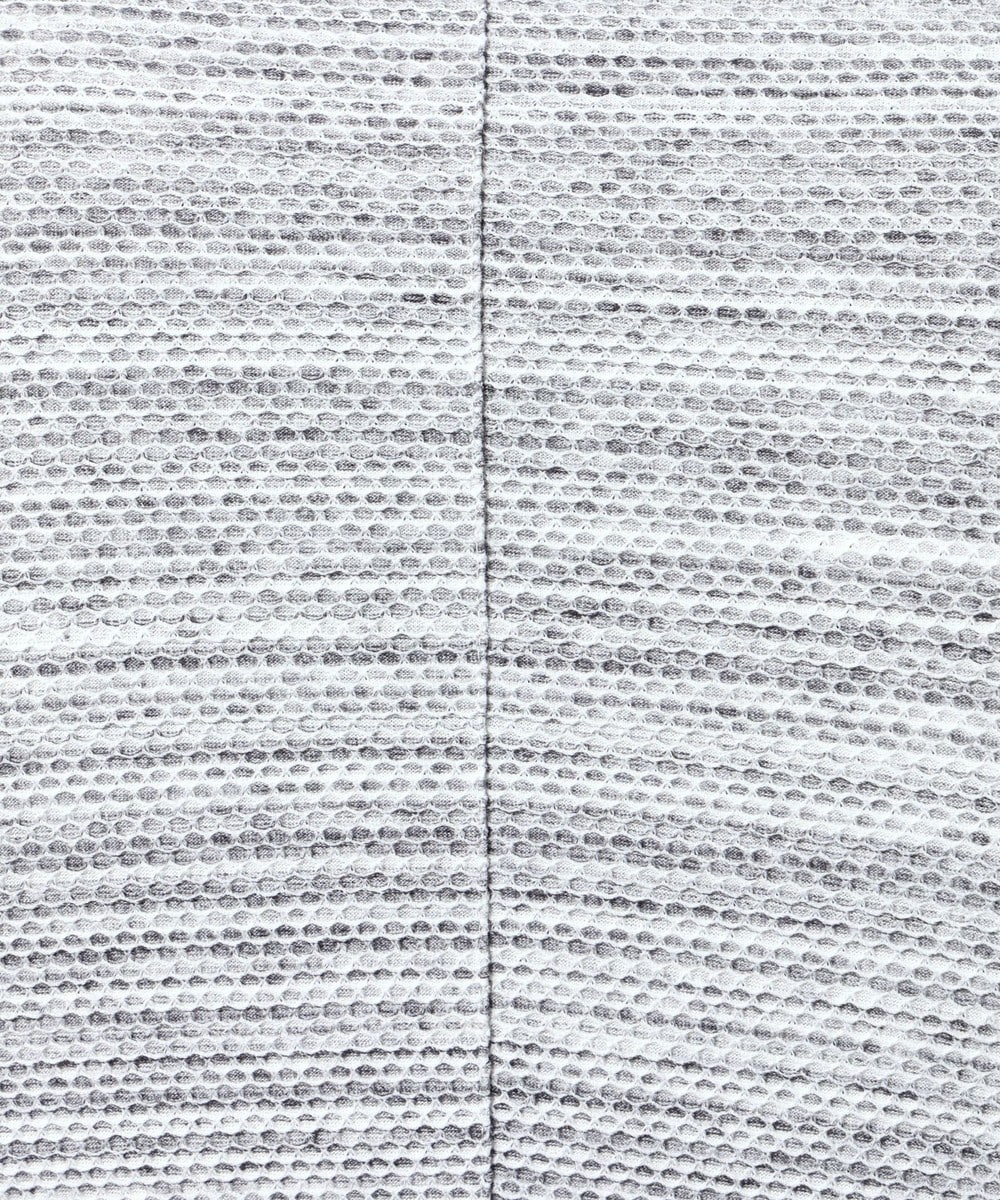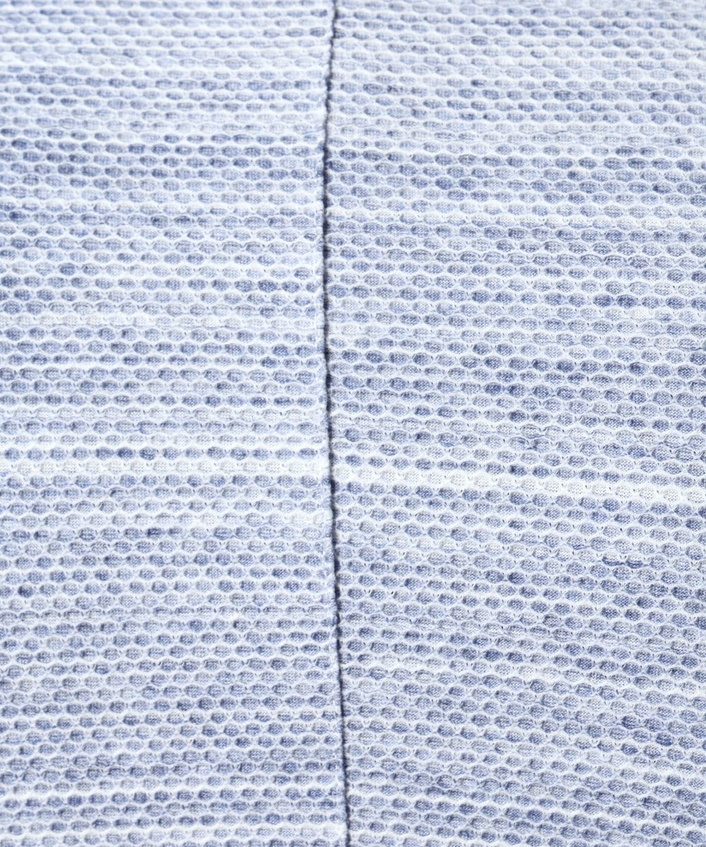 ポリエステルと綿糸の不規則な引き揃えと片染めにより、独特なメランジ感を表現したハニカムジャカ-ド生地になります。