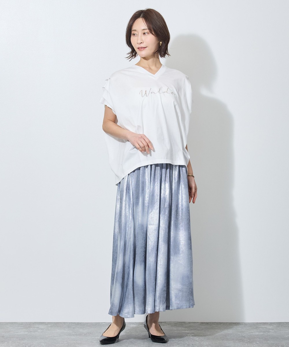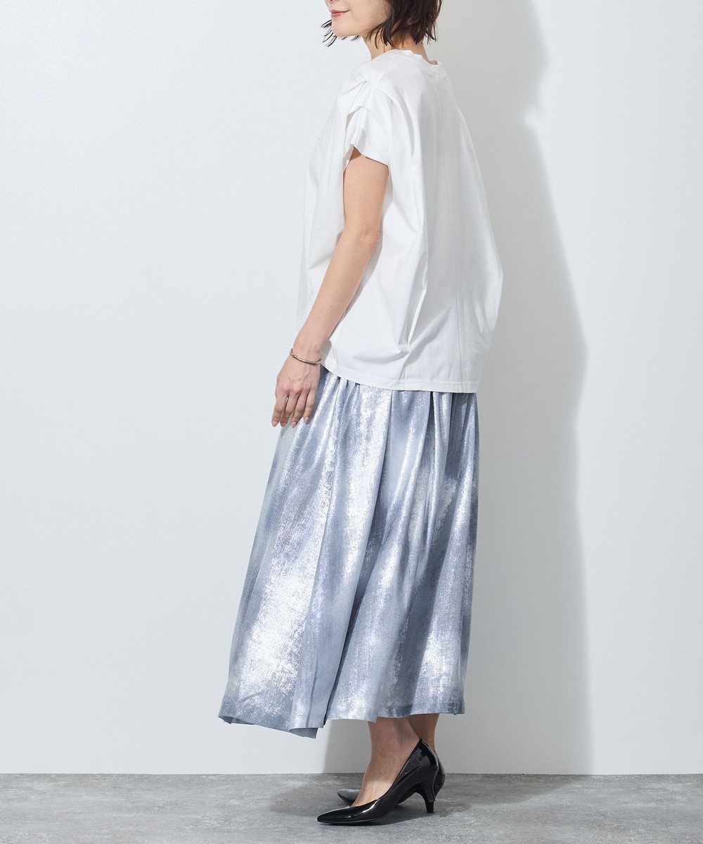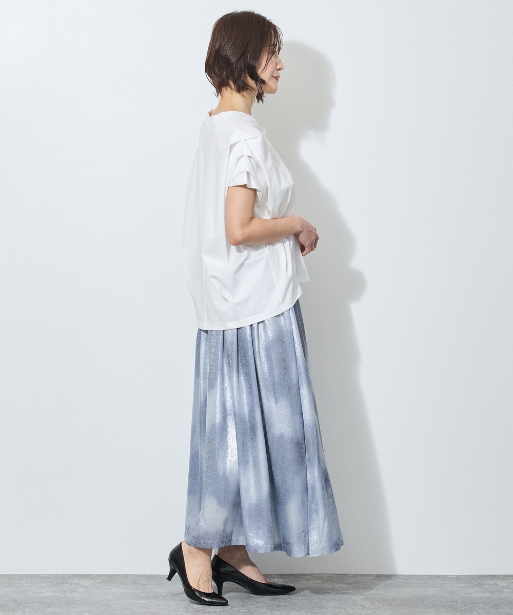 シンプルなトップスを合わせていただくことで、落ち着いた光沢と水彩のようなムラ染めのエレガントさが一層引き立ちます。