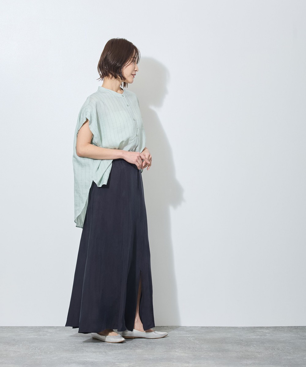 左前の切替えにスリットを入れることで、細身のラインでも歩きやすく、ウエストゴム仕様がリラックスした着心地も叶えます。