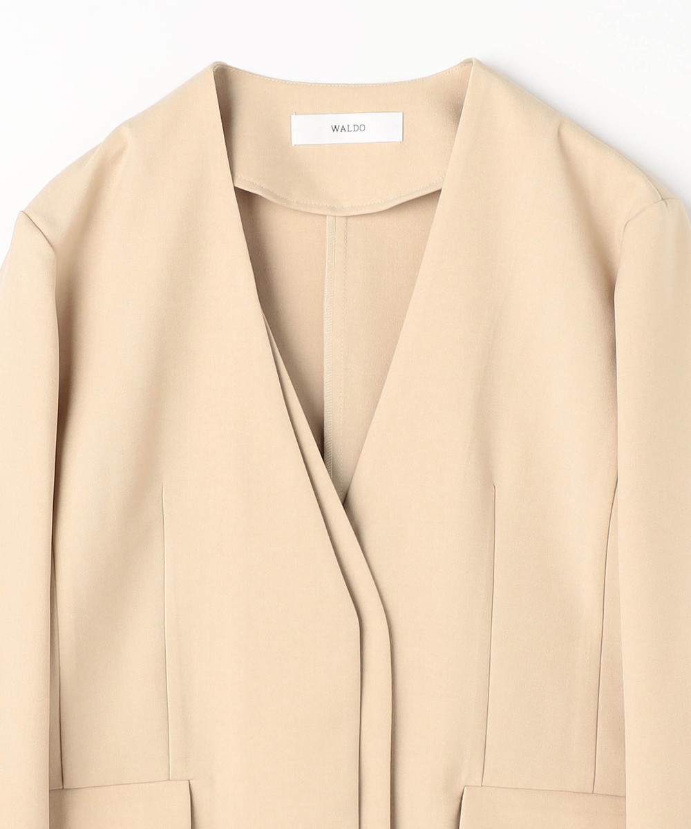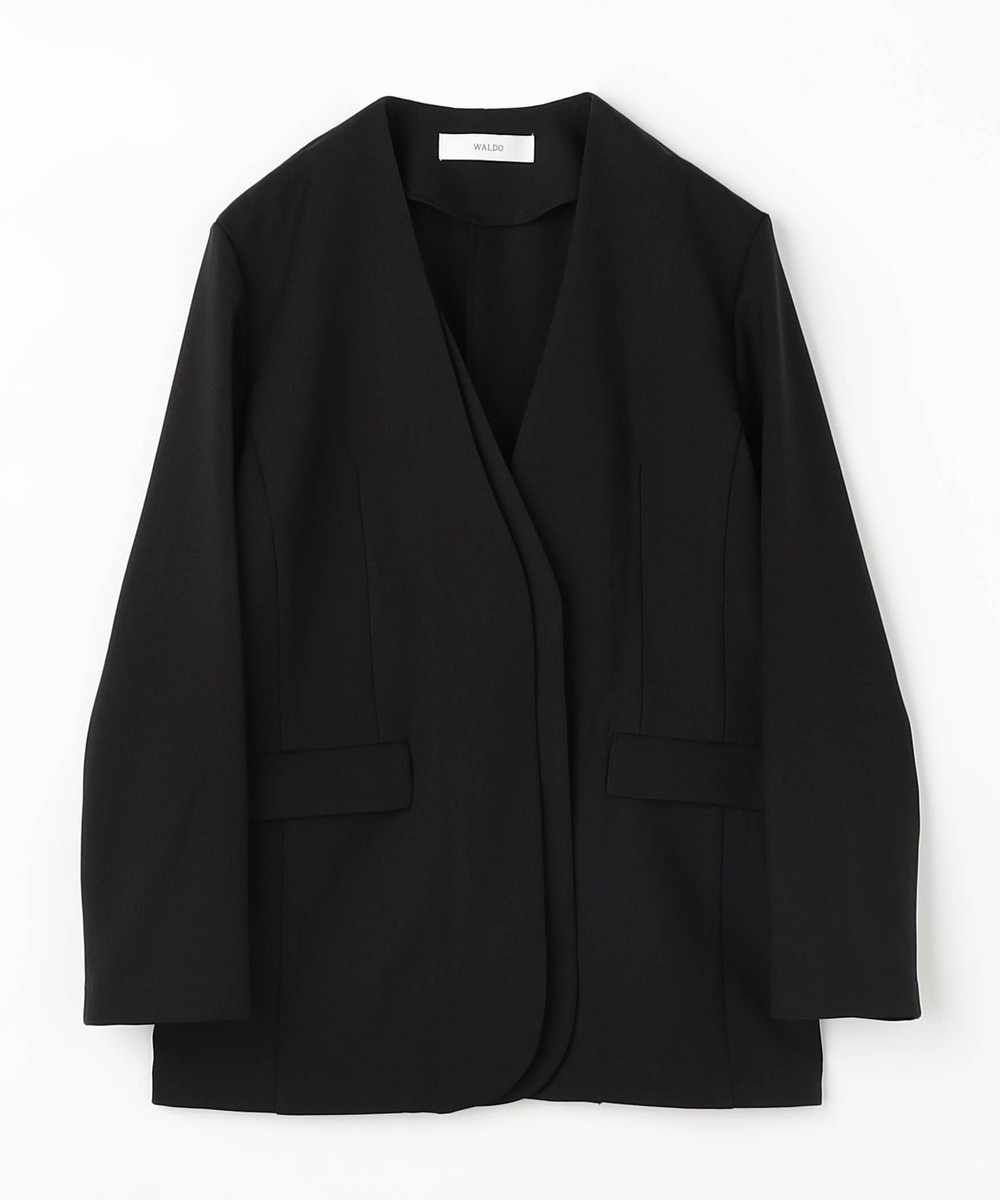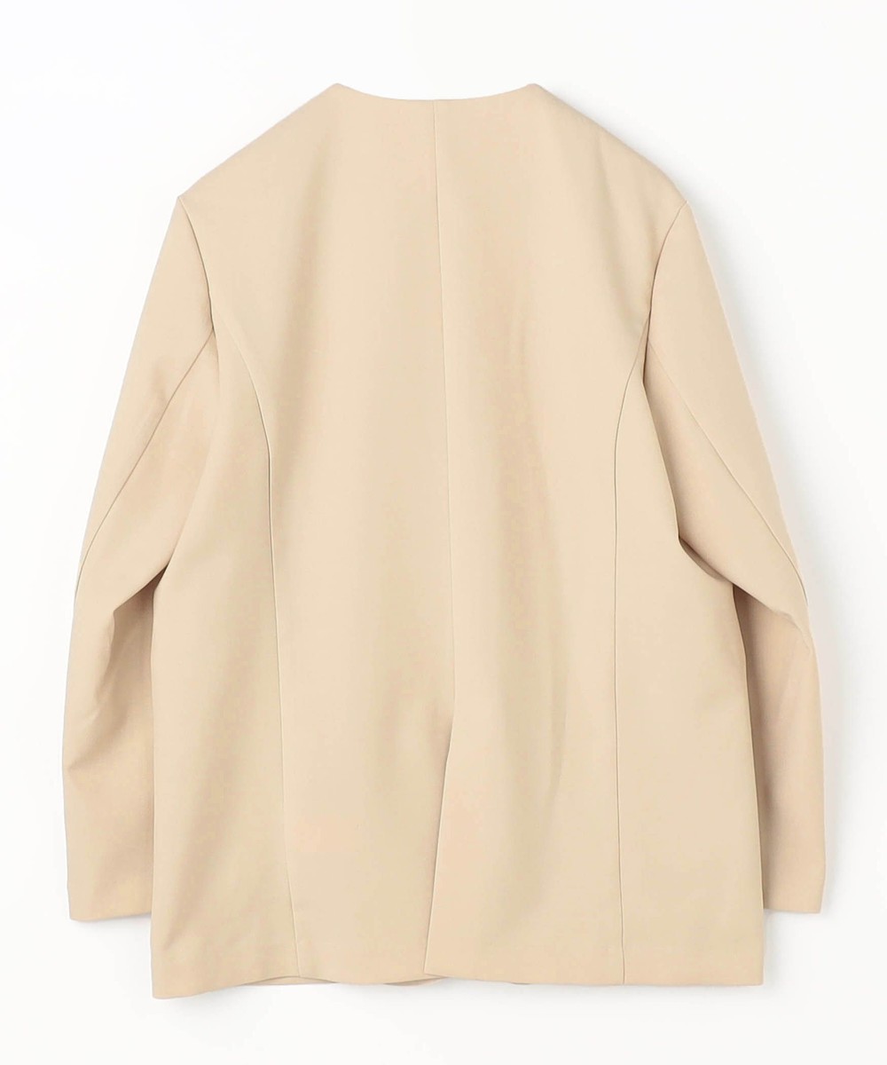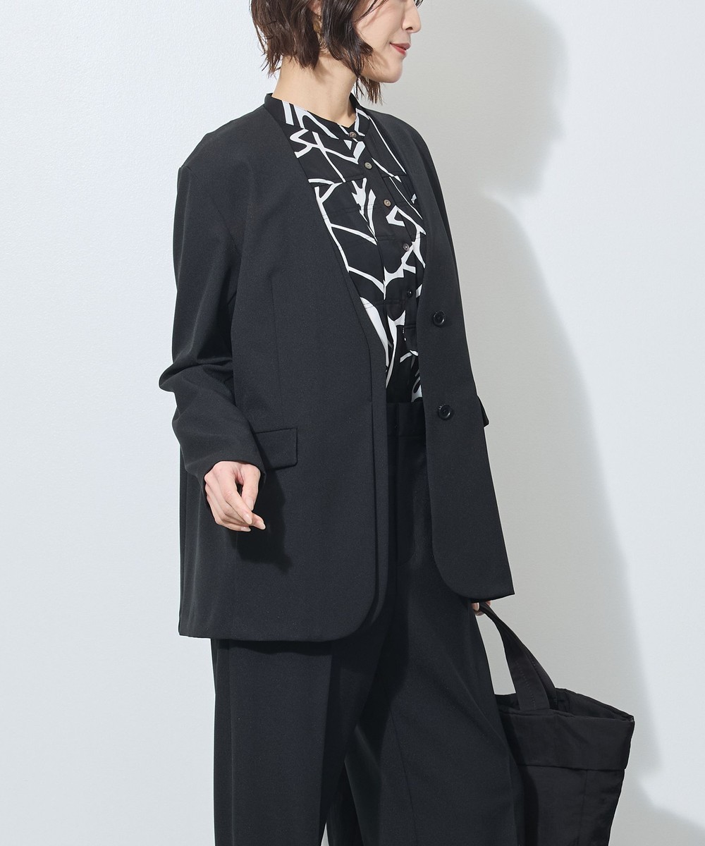スッキリとしたノーカラーで、シンプルながらもフロントのレイヤード風デザインが上品な印象のジャケットです。