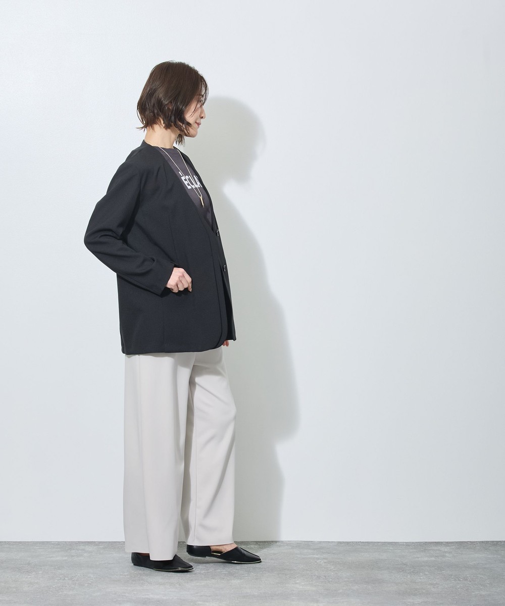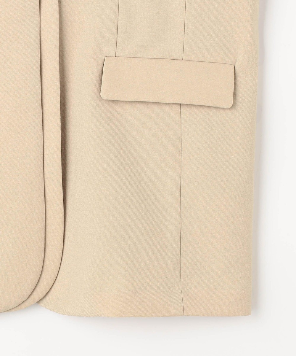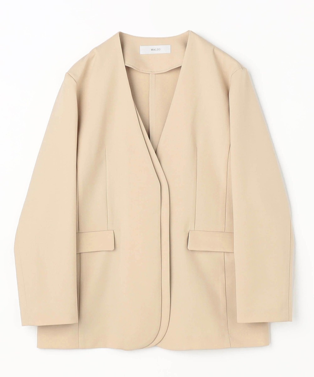 スッキリとしたノーカラーで、シンプルながらもフロントのレイヤード風デザインが上品な印象のジャケットです。