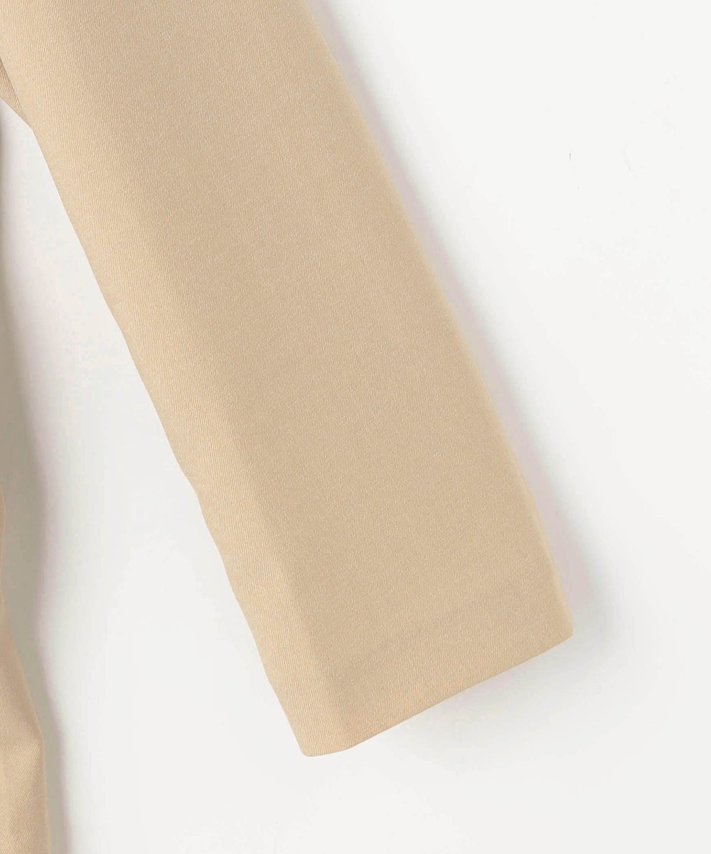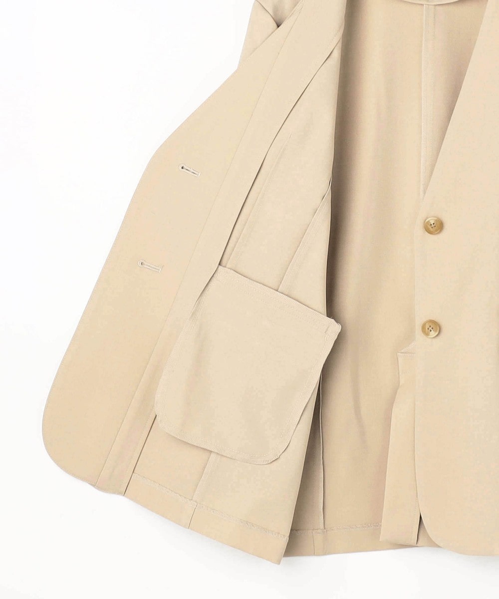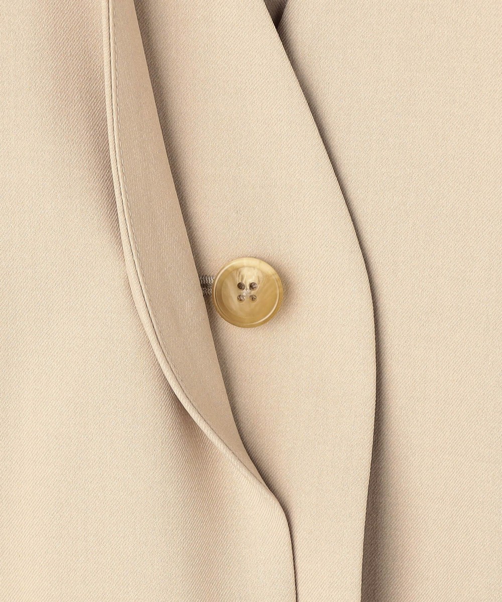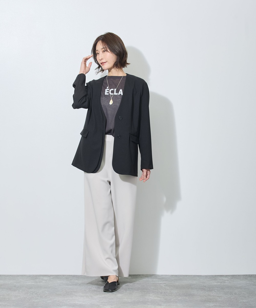 スッキリとしたノーカラーで、シンプルながらもフロントのレイヤード風デザインが上品な印象のジャケットです。