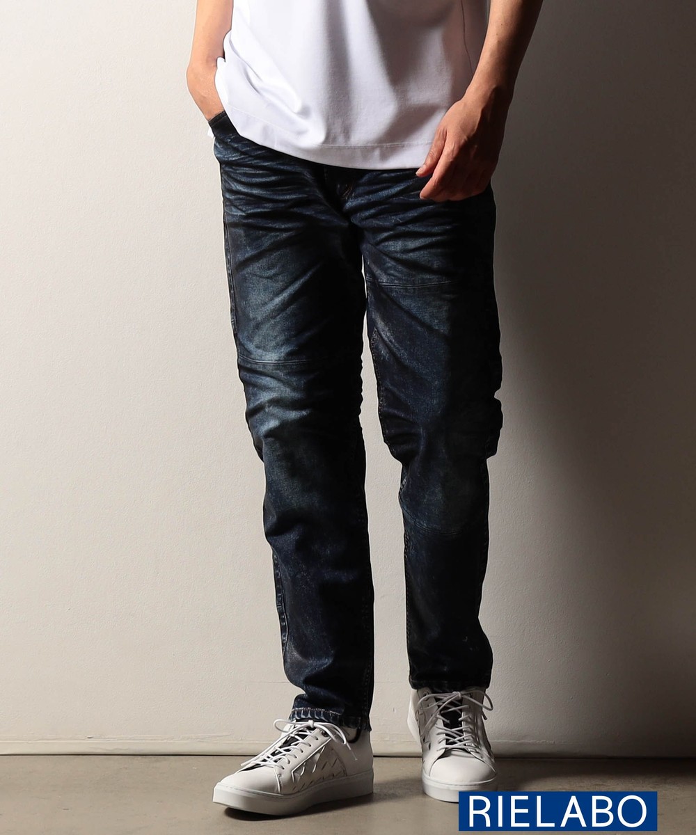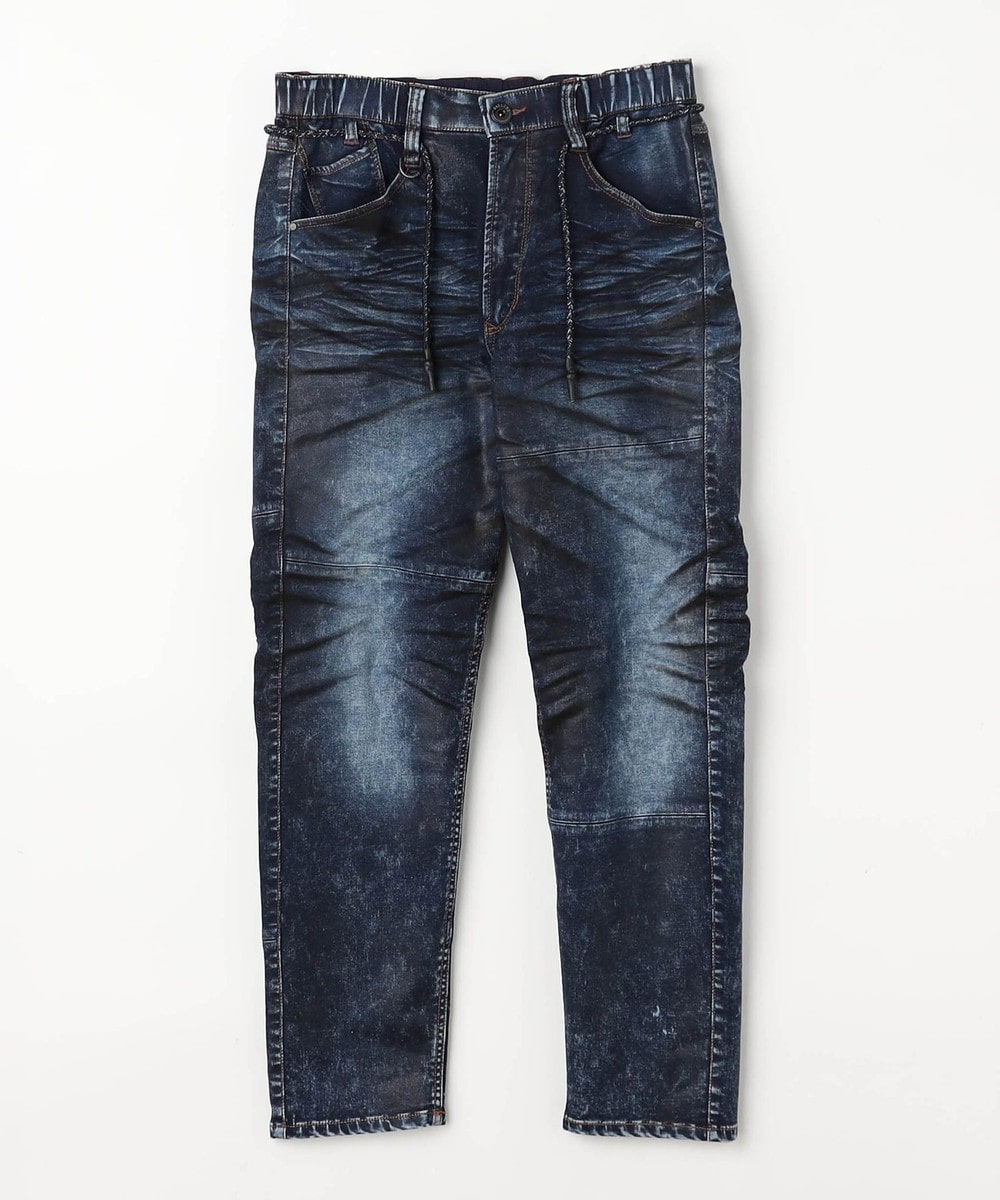 国内で最終加工、顔料を混ぜた樹脂コーティング剤を部分的吹き付け、所々アイロンでしっかり抑える事で縫い代の厚みがある部分や平たい部分に光沢を出してコーティングパンツの様な質感に仕上げます。最後に立体的でリアルな3Dシワ加工を施し、更に陰影感をつける様に顔料を吹き付けています。