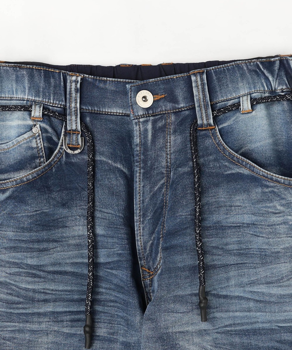 ウエストベルトに平ゴムを通し、表出しスピンドル仕様の5ポケットデザインイージーパンツ。