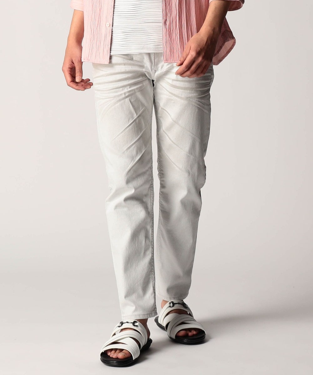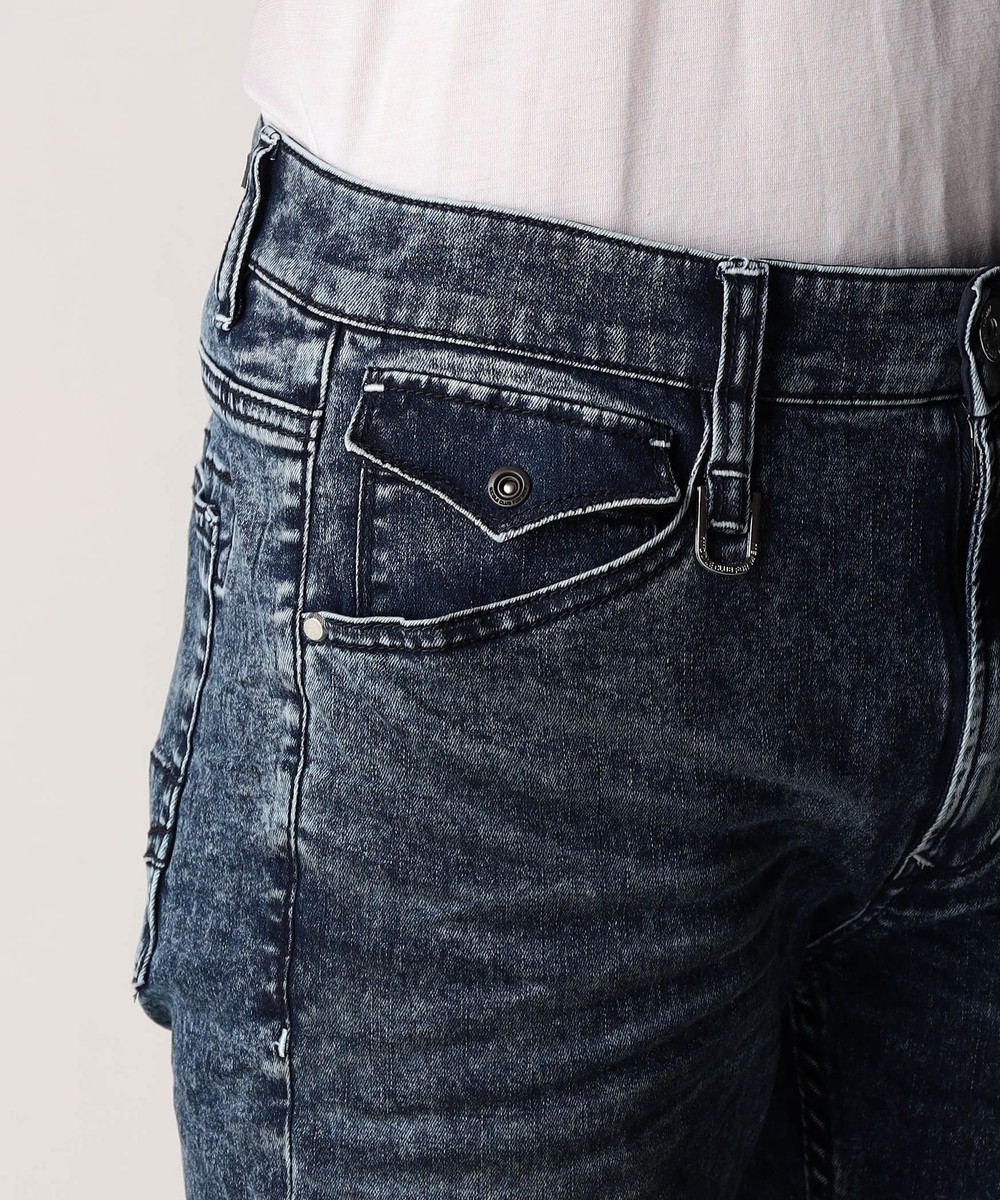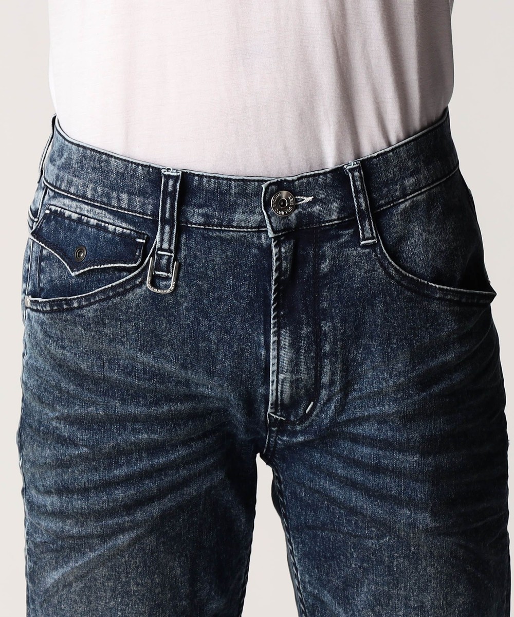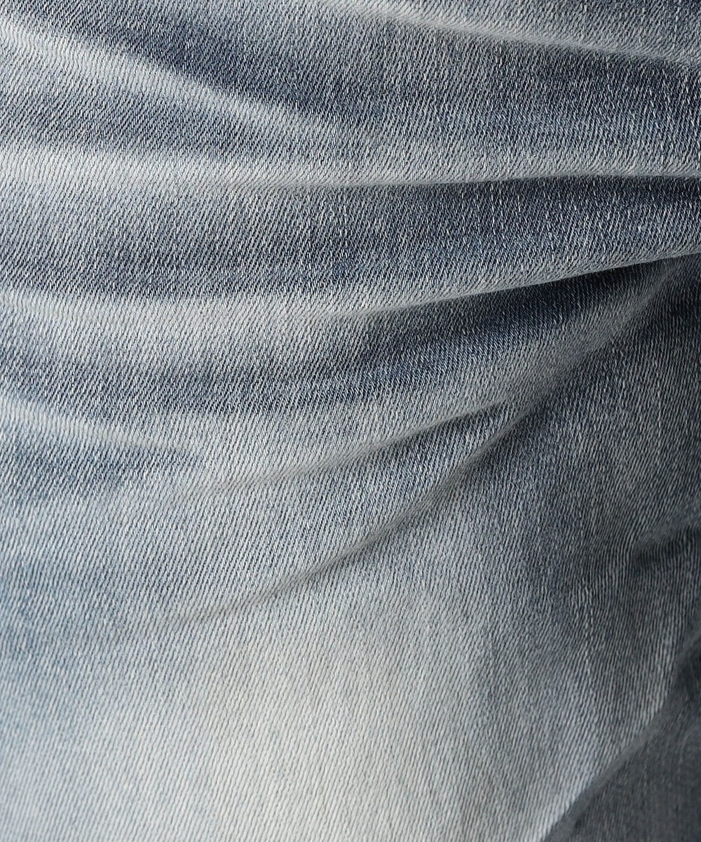 09ホワイト、製品洗いと撥水加工を施して洗い晒し感の雰囲気ある印象に仕上げ、前股・太もも内側・脇・膝裏に3Dシワ加工+薄く吹き付け加工を施しています。60ブルーは今季新色、ケミカルブリーチ加工を施してムラ感のある陰影感を出し、ユーズド+3D+吹き付け加工。64サックスは全体的に手拭きの次亜ブリーチ加工を施し、フェードしたブルーカラーにユーズド+3D+吹き付け加工。67ネイビーはブラスト加工で色差をしっかり出したユーズド加工後、黒のオーバーダイ加工で全体を濃く仕上げ、3Dシワ加工+黒顔料の吹き付け加工を施してシワに陰影感をつけています。